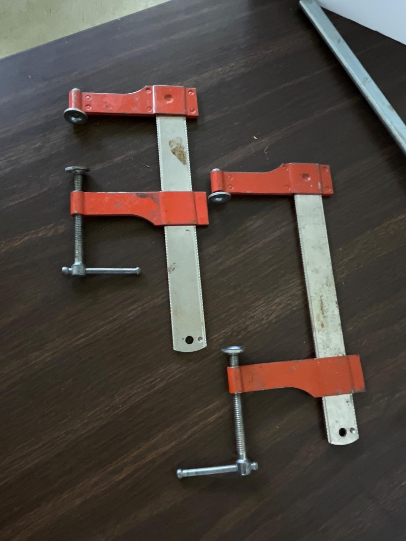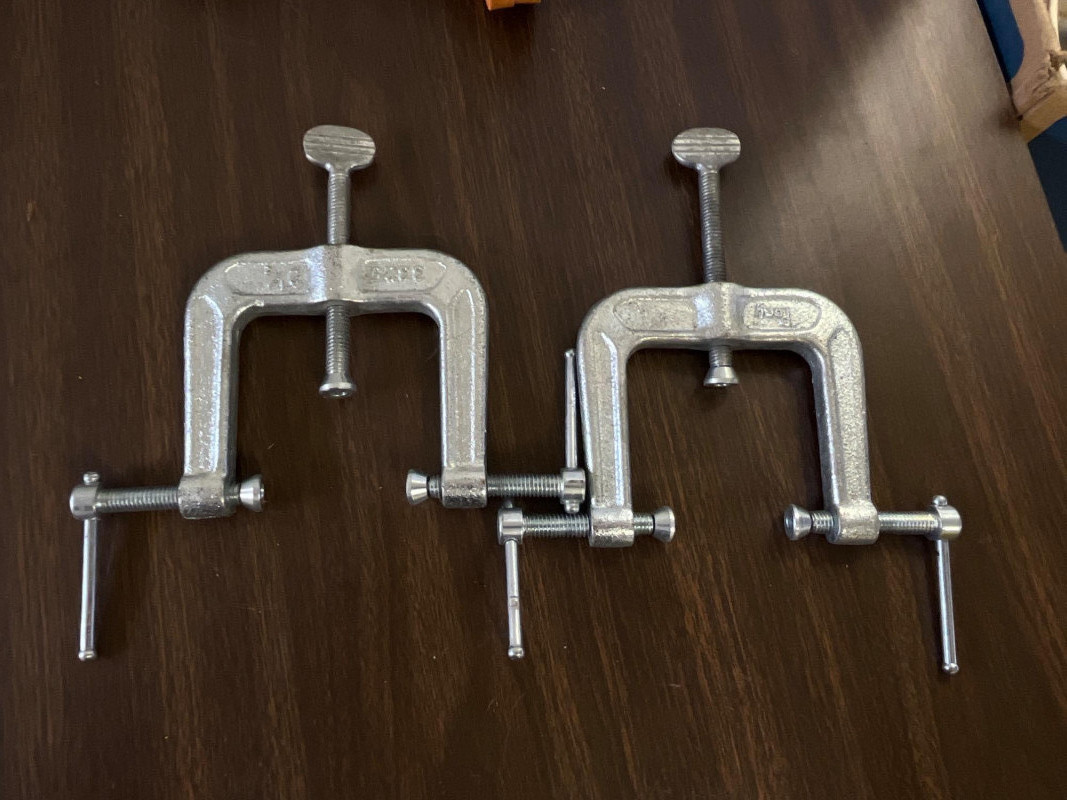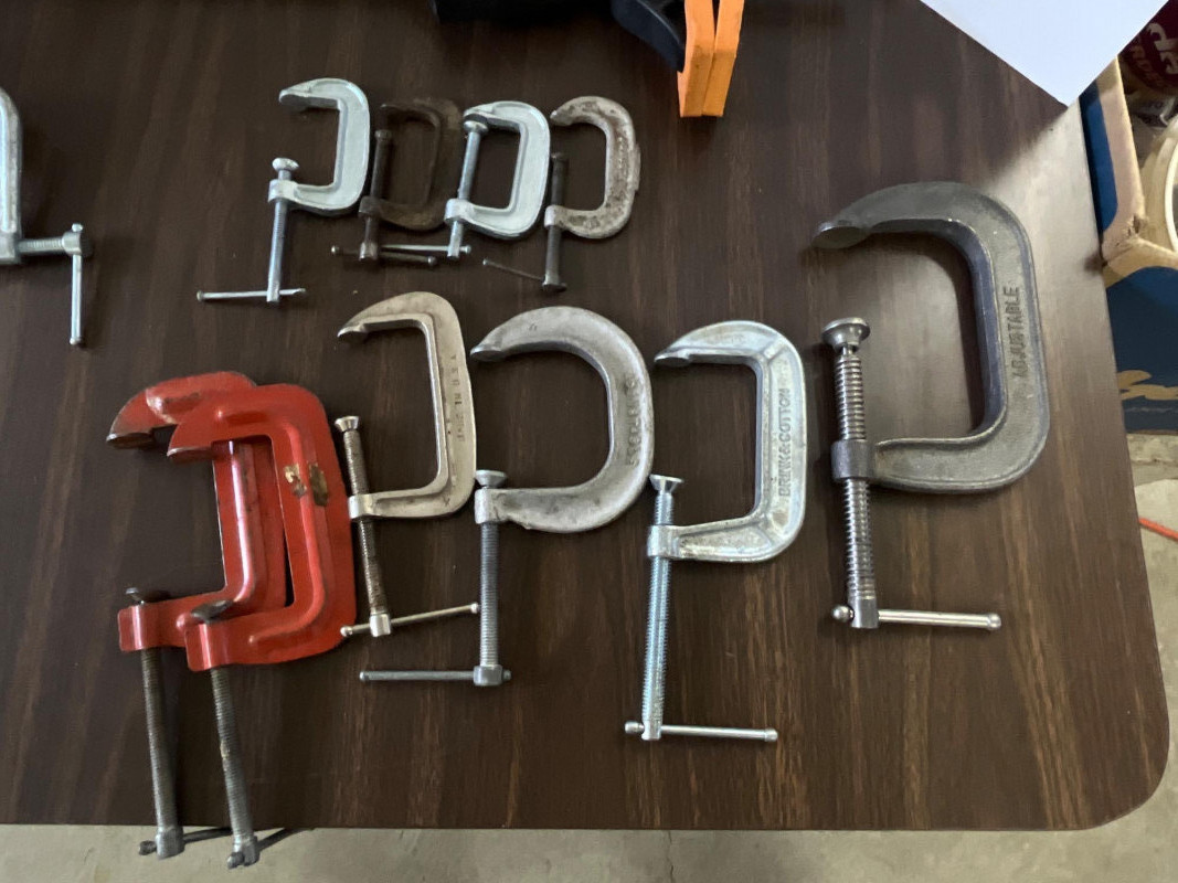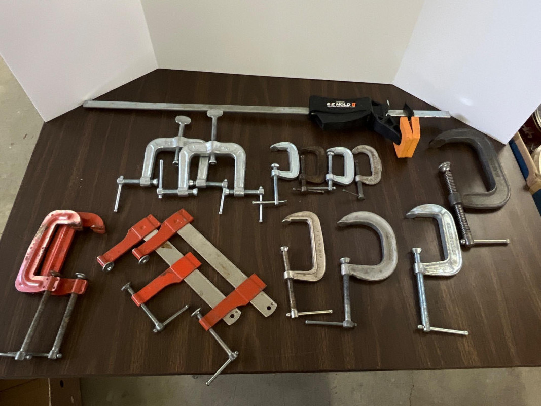 (15) Assorted Clamps (10) various C-clamps (2) 3-way edging clamps (2) bar clamps (2) Jorgensen E-Z bar and spreader clamp