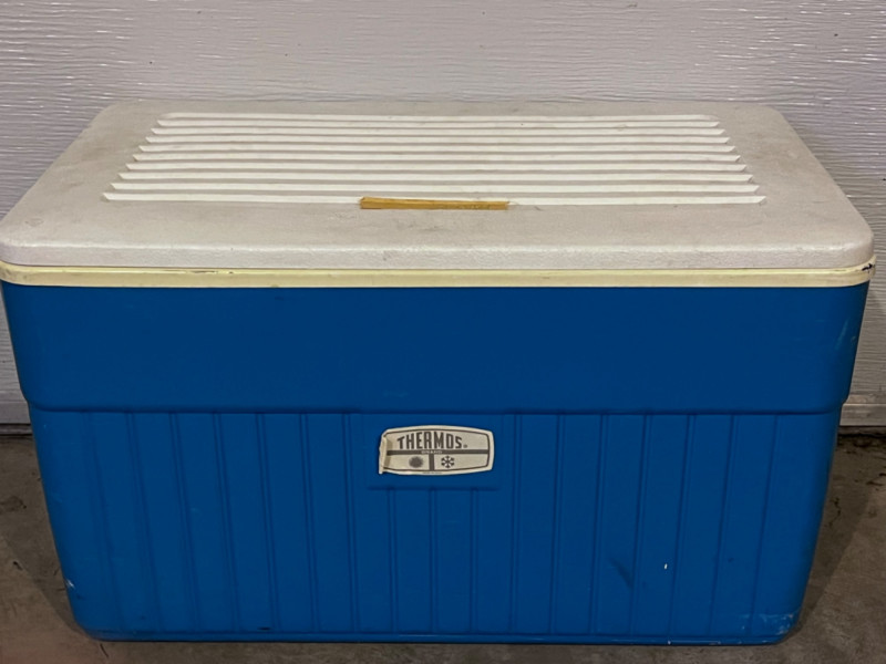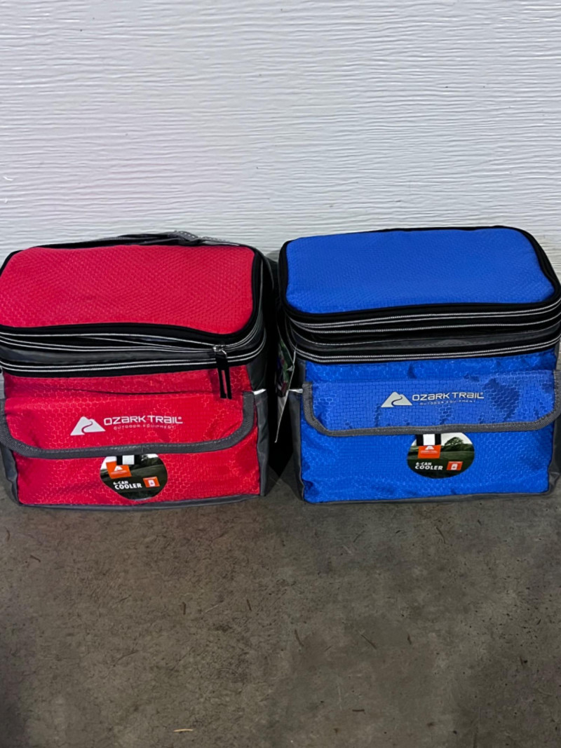 Thermos Cooler–Gott Cooler–(2) Ozark Trail Lunch Bag Coolers Blue Thermos cooler. Grey Gott color with handle. 15”x10”x13.5” Blue & red Ozark Trail 6-can coolers.