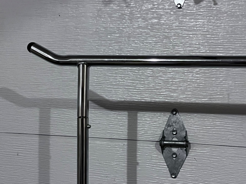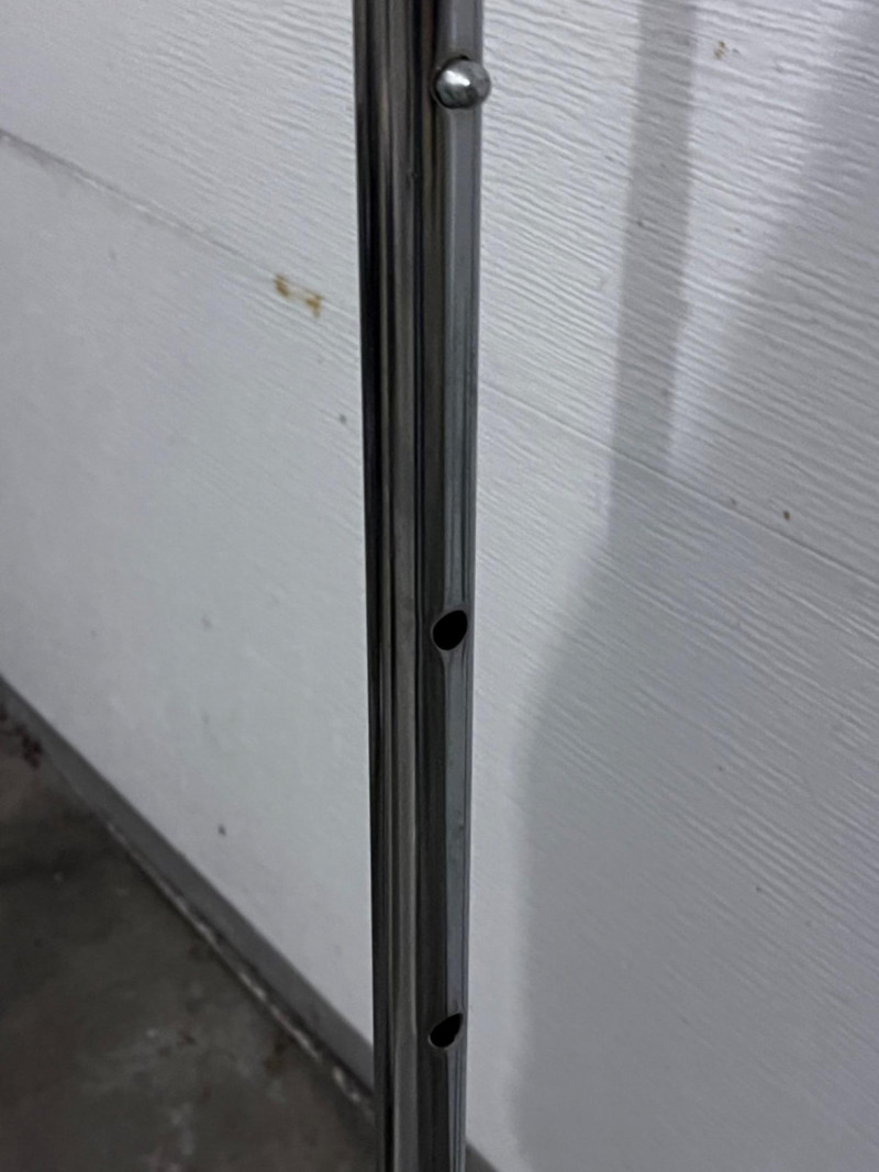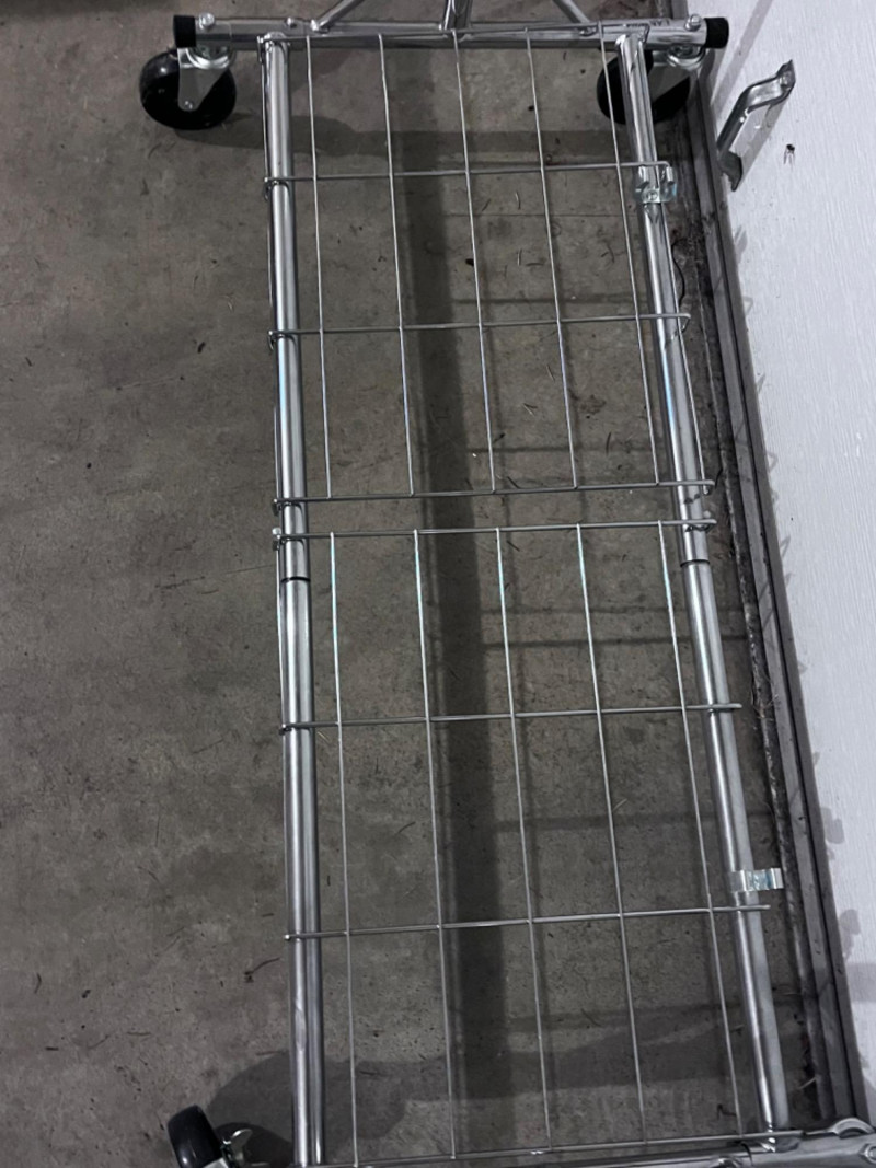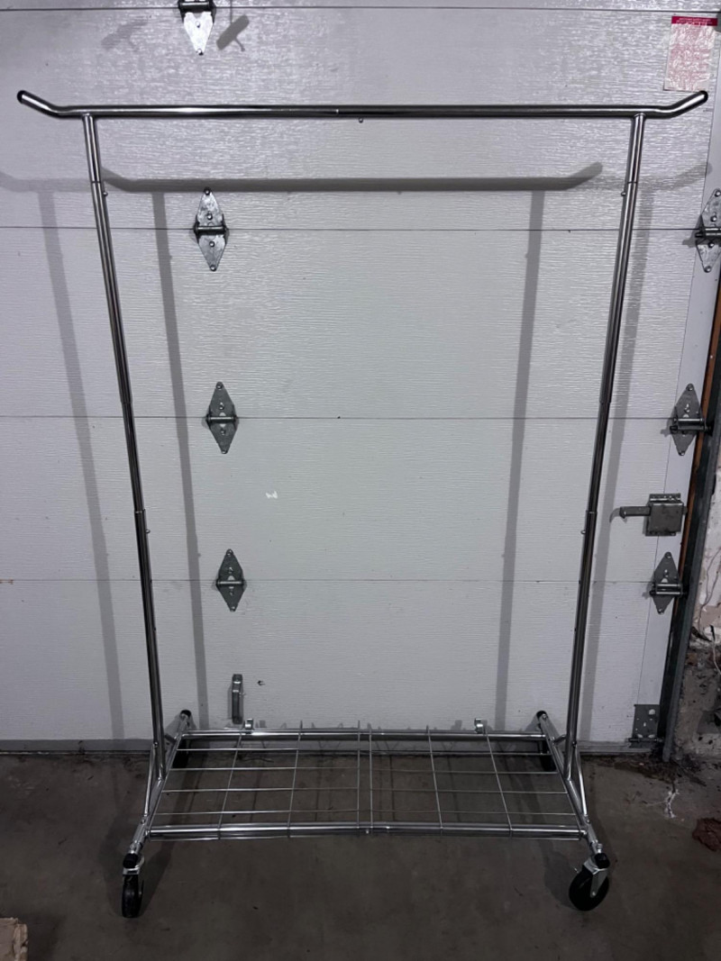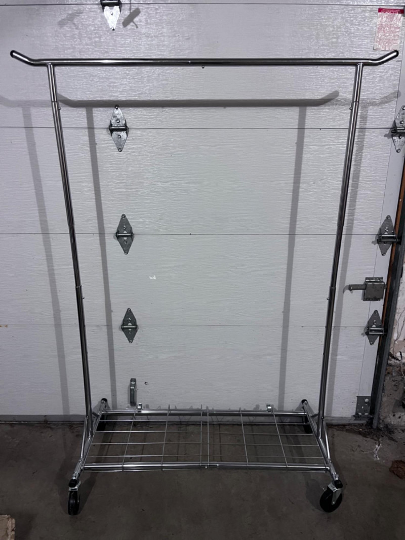 Langria Rolling Clothing Rack Silver metal clothes rack with bottom storage.