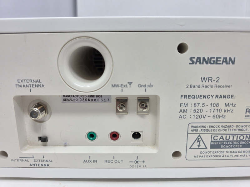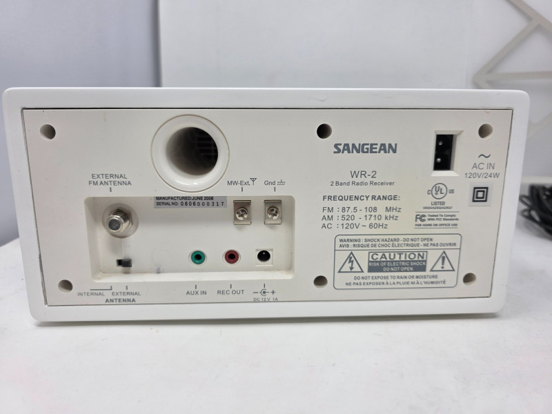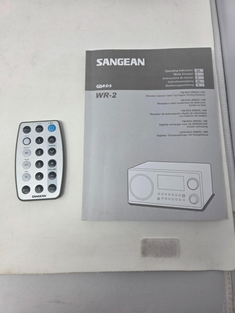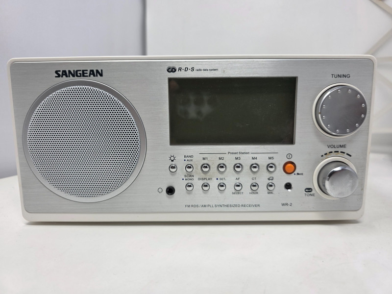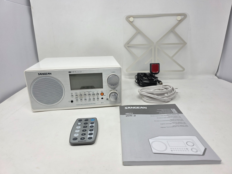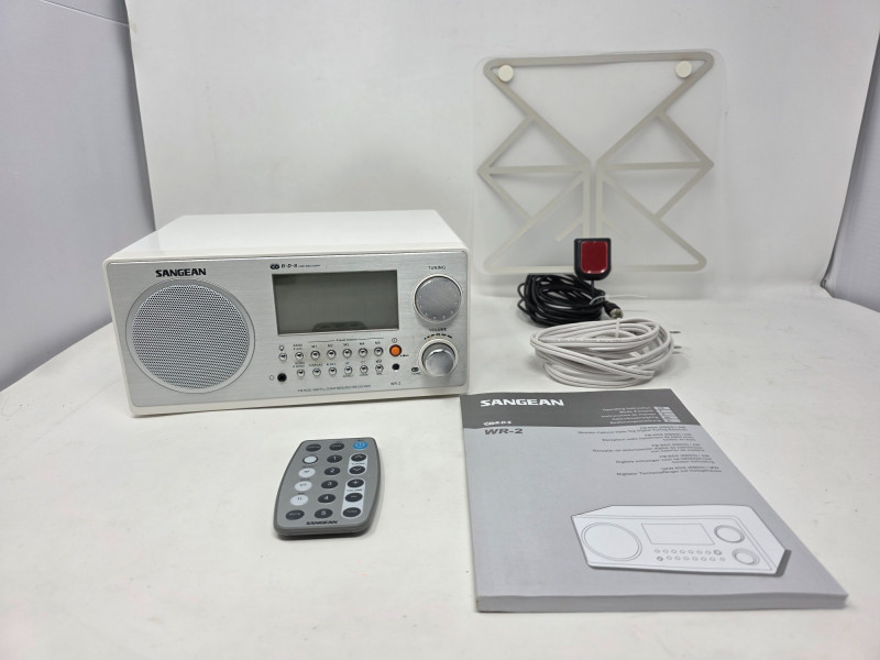 Sangean WR-2 Table Top Stereo The Sangean WR-2 is an AM/FM digital tuning tabletop radio known for its rich sound quality due to an acoustically tuned wooden cabinet and adjustable bass and treble controls. Features a 3-inch, 7-watt full-range speaker with a 7W amplifier and acoustic bass compensation system, delivering warm, room-filling sound. Users can adjust bass and treble levels via a single rotary control It includes a range of features such as a clock, alarm, external antenna, manual, cables and remote control. Tested - Works! 4.5"T x 9.5"W x 7.5"D