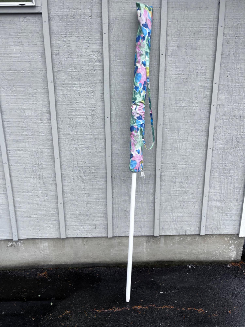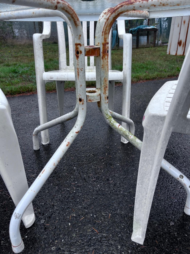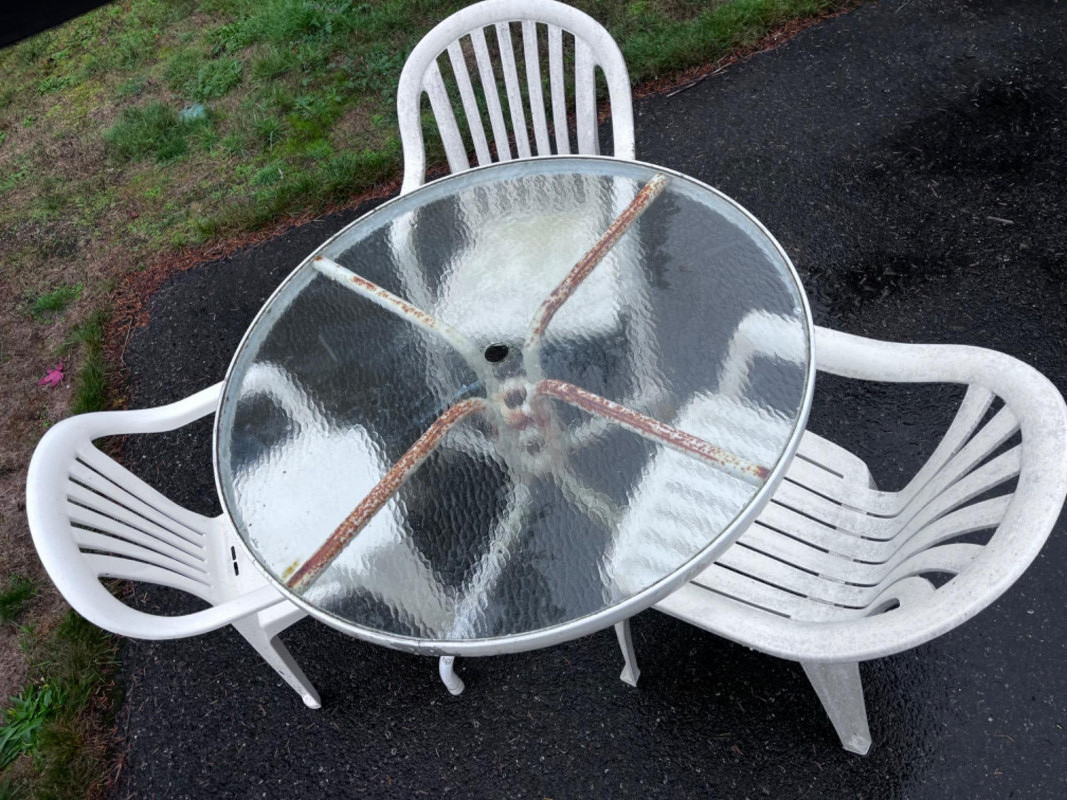 Metal Frame Glass Top Table With (3) White Rubbermaid Plastic Chairs White metal outside table with glass top. Umbrella holder on table. Needs good cleaning. Comes with umbrella.