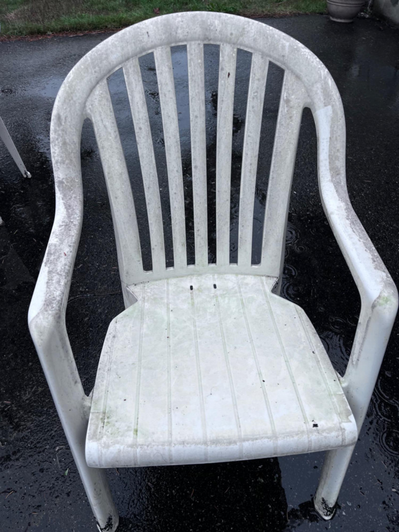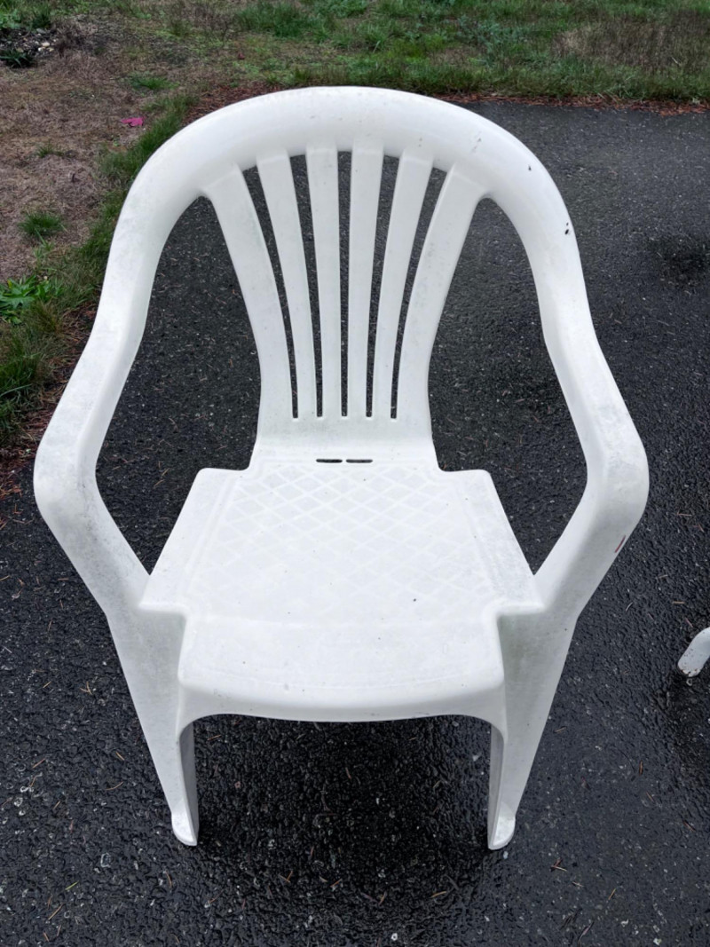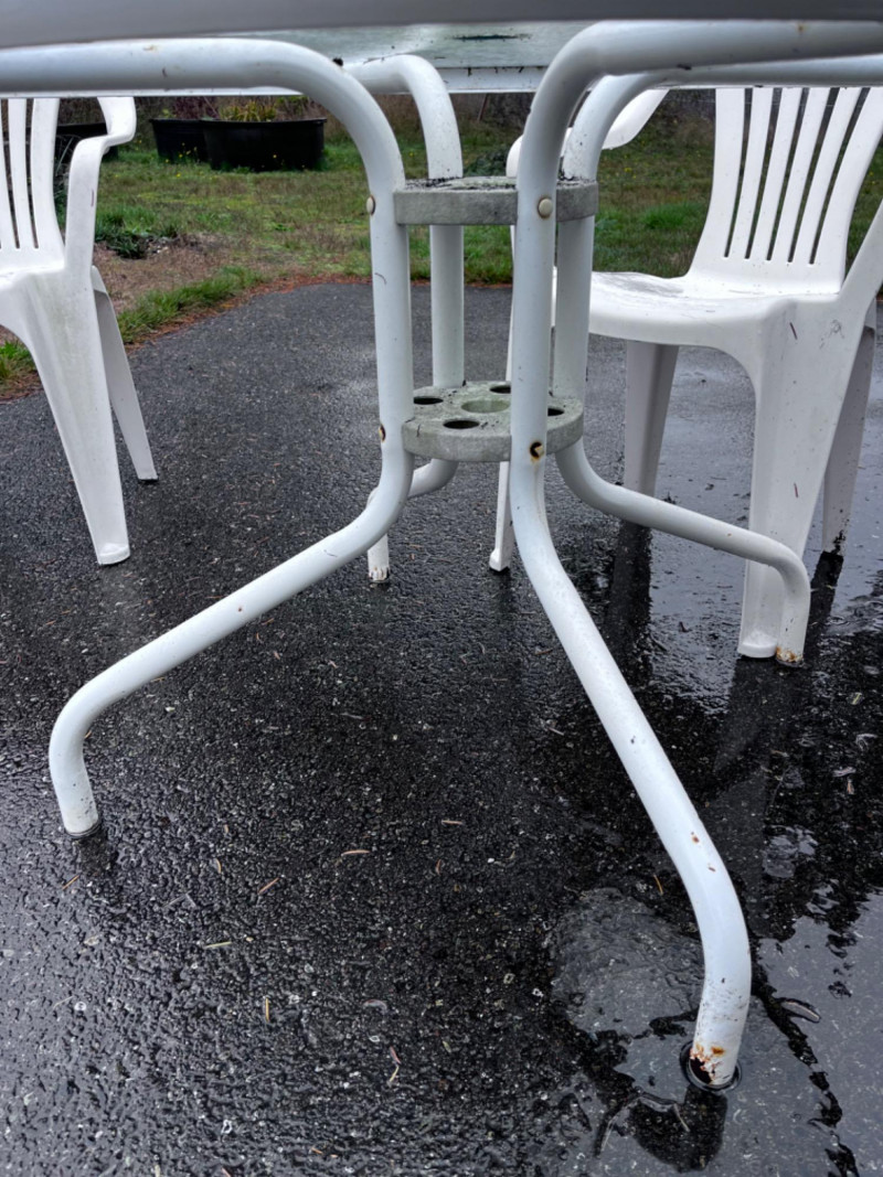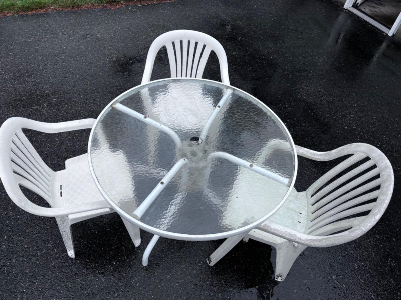 Outdoor Metal Frame With Glass Top Table With (3) White Plastic Chairs (3) White plastic chairs 22”x20”x35” Needs good clean.