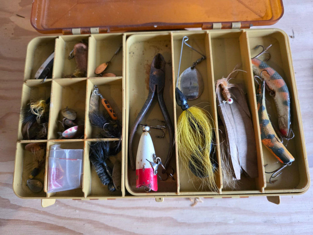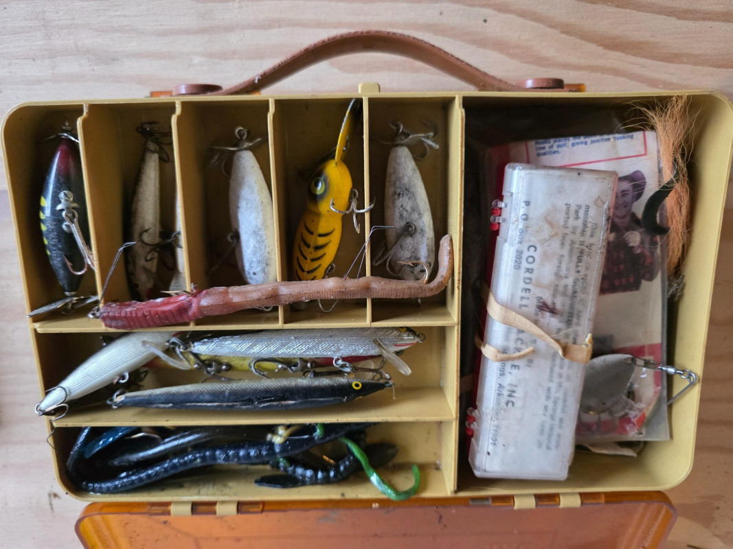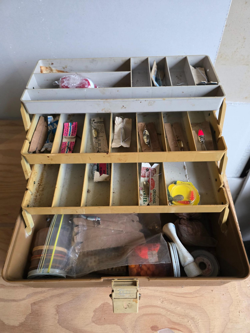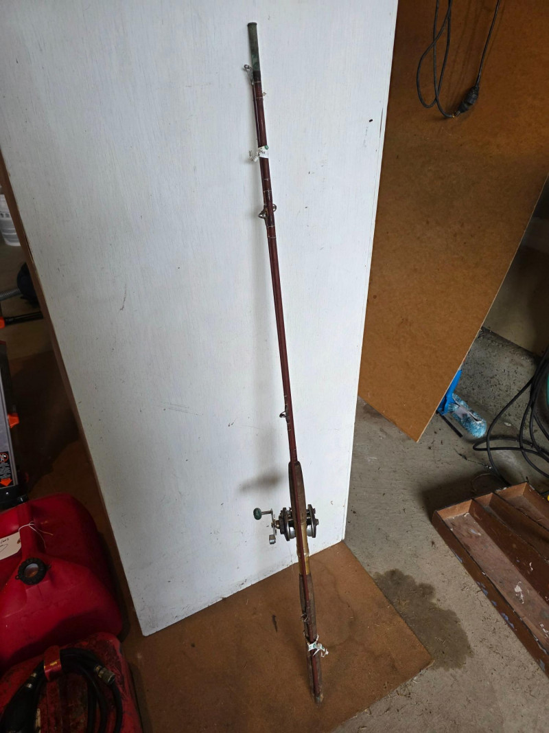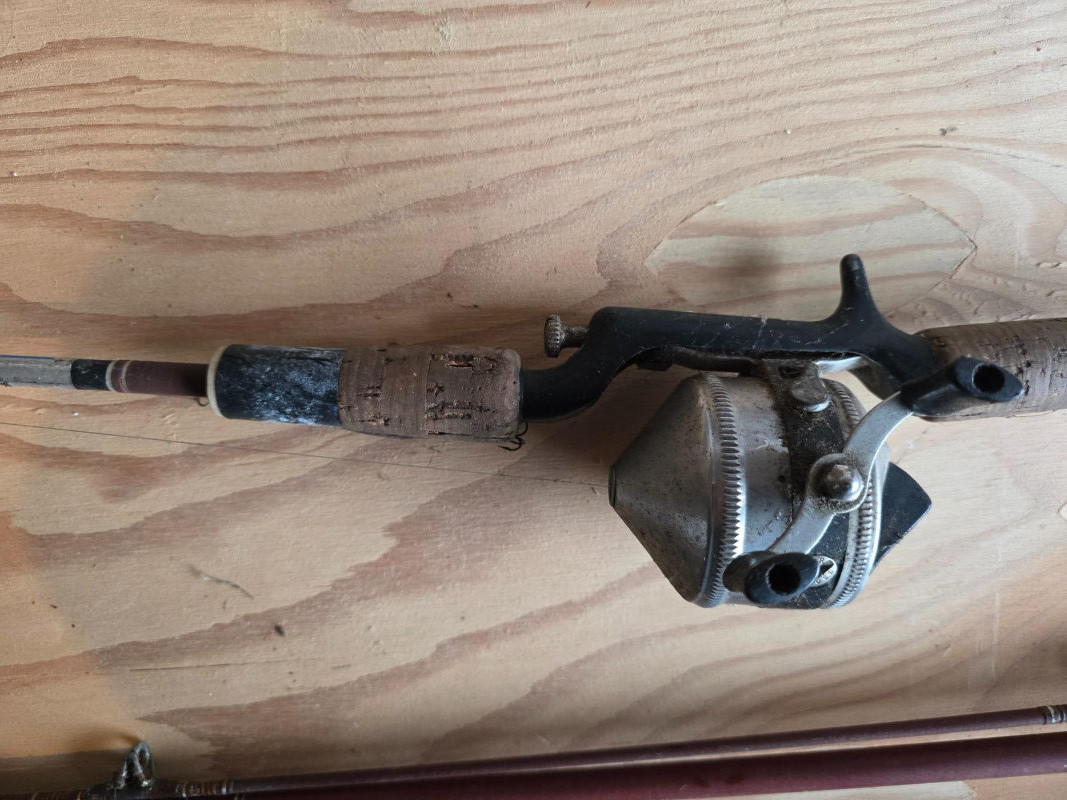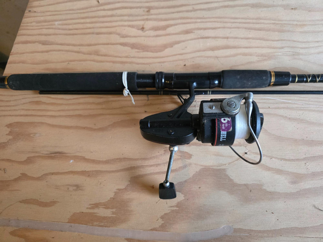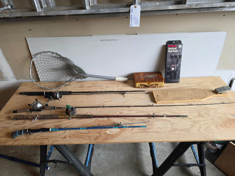 Big Fishing Lot #3 Fishing rod/reel combos, tackle box with gear and large net (1) Centurion 6' Rod (2-piece) (1) Penn Peer 109 Reel & 100"L Rod (2-piece) (1) Misc Reel & Zebco Model 6100-6' Rod (1-piece) (1) Mitchell 300S Spinning Reel & Muster Model GC51 7' Rod (2-piece) (1) Plano Mini-Magnum 3250 Side-Kick tackle box full of gear (1) Tackle box with gear (1) 14"W Catch Net With Aluminum Handle (1) Berkley Vertical Rod Rack (1) Fish Descaling Board