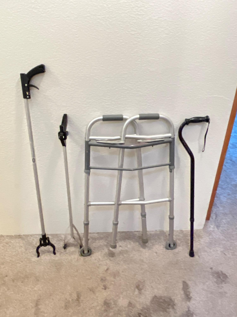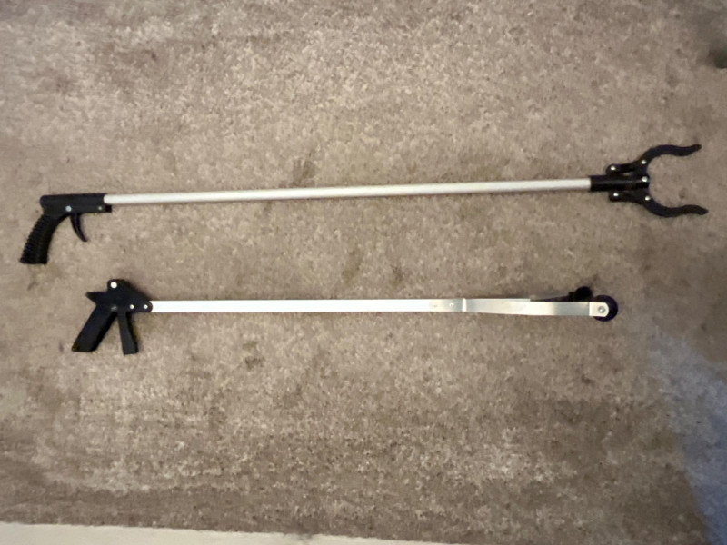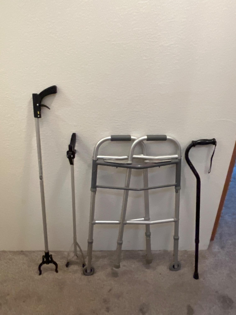 Mobility Aids and (2) Grabber Tools (2) Grabber tools 44” and 33.5 Used Walker Used cane