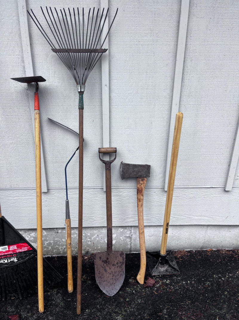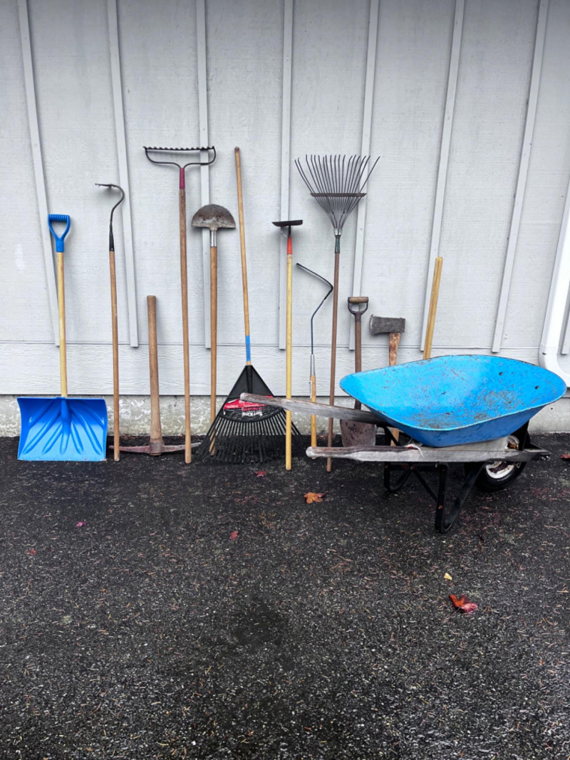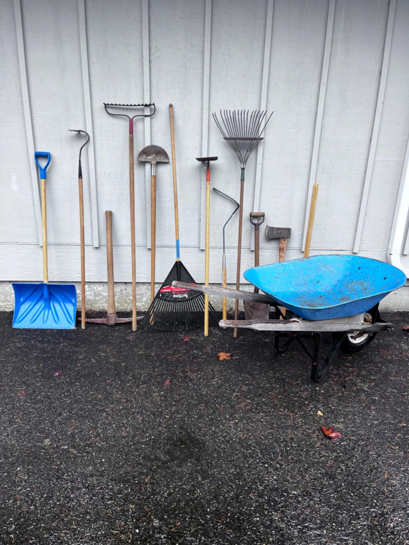 Snow shovel, pickaxe, rakes, axe, wheelbarrow, & more!