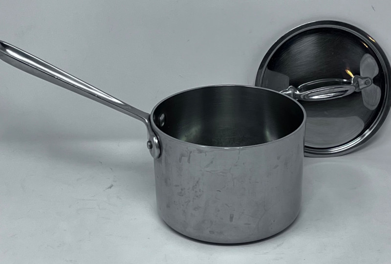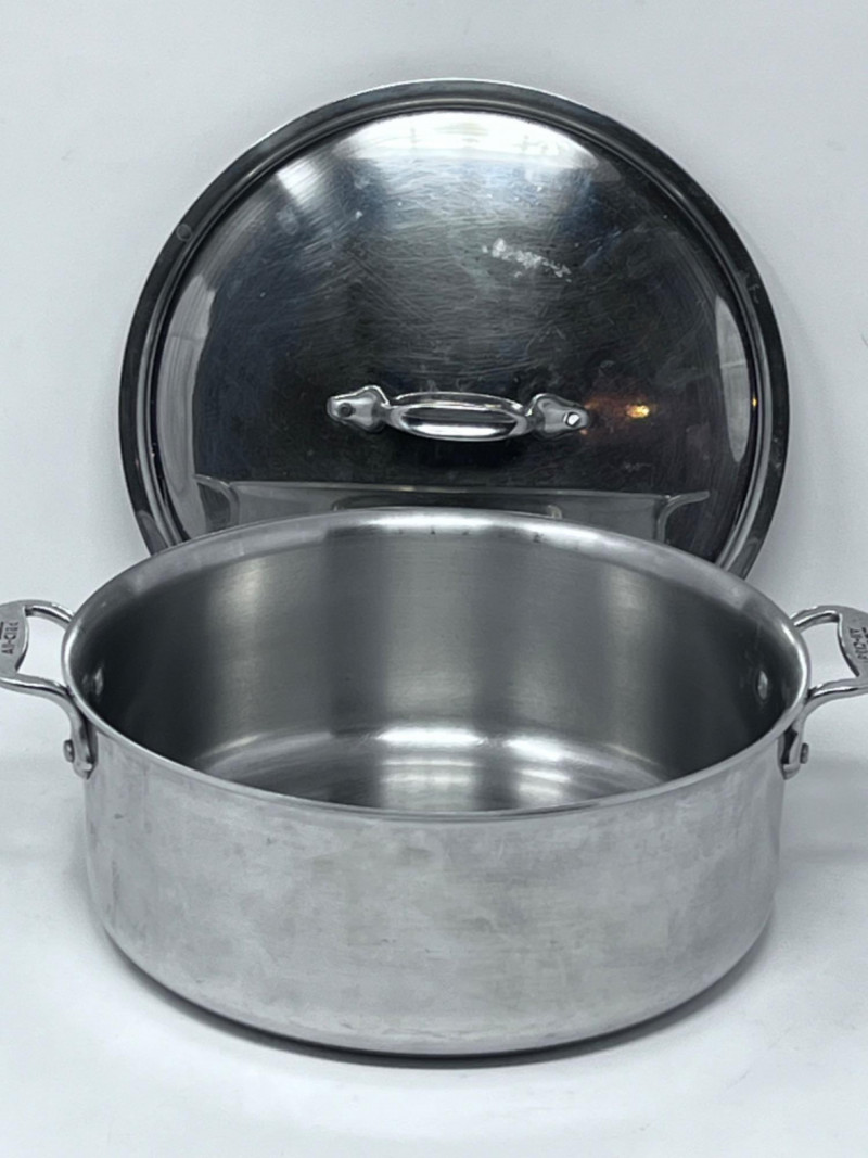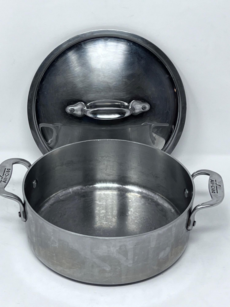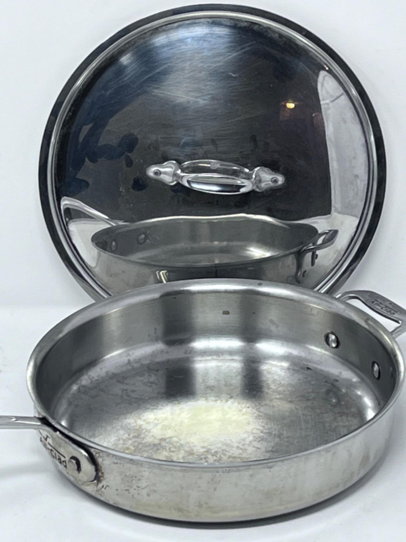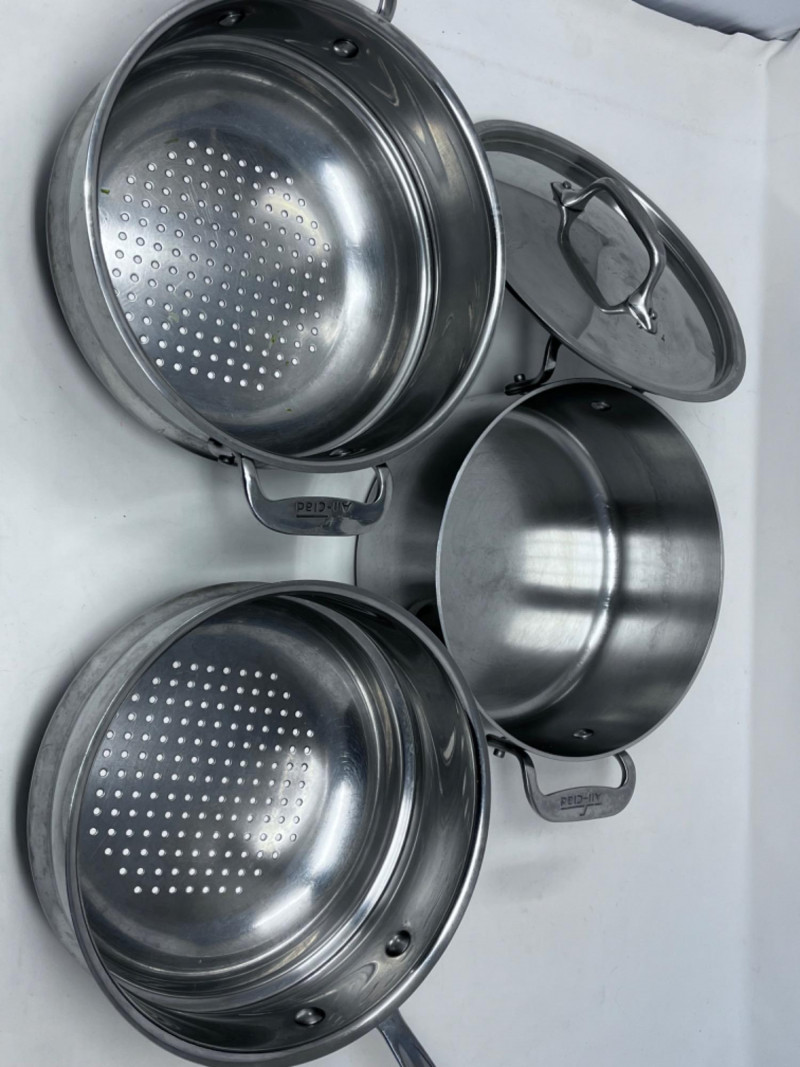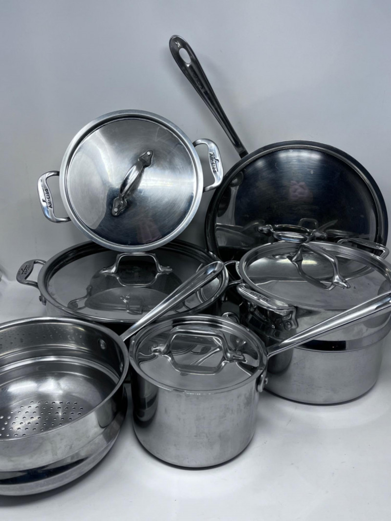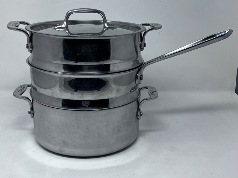 All-Clad Cookware Double boiler with steamer insert. 8.5” diameter. Three pots with lids. Largest is 11” diameter. Pan is 11” diameter. Comes with lid.