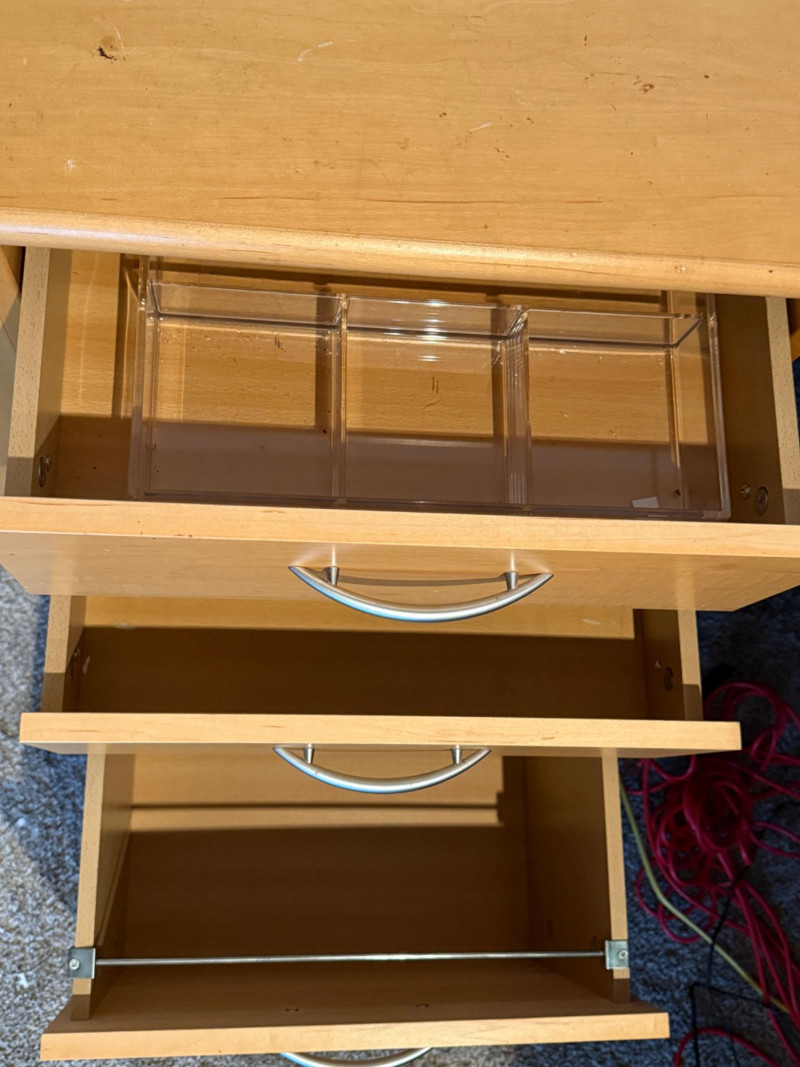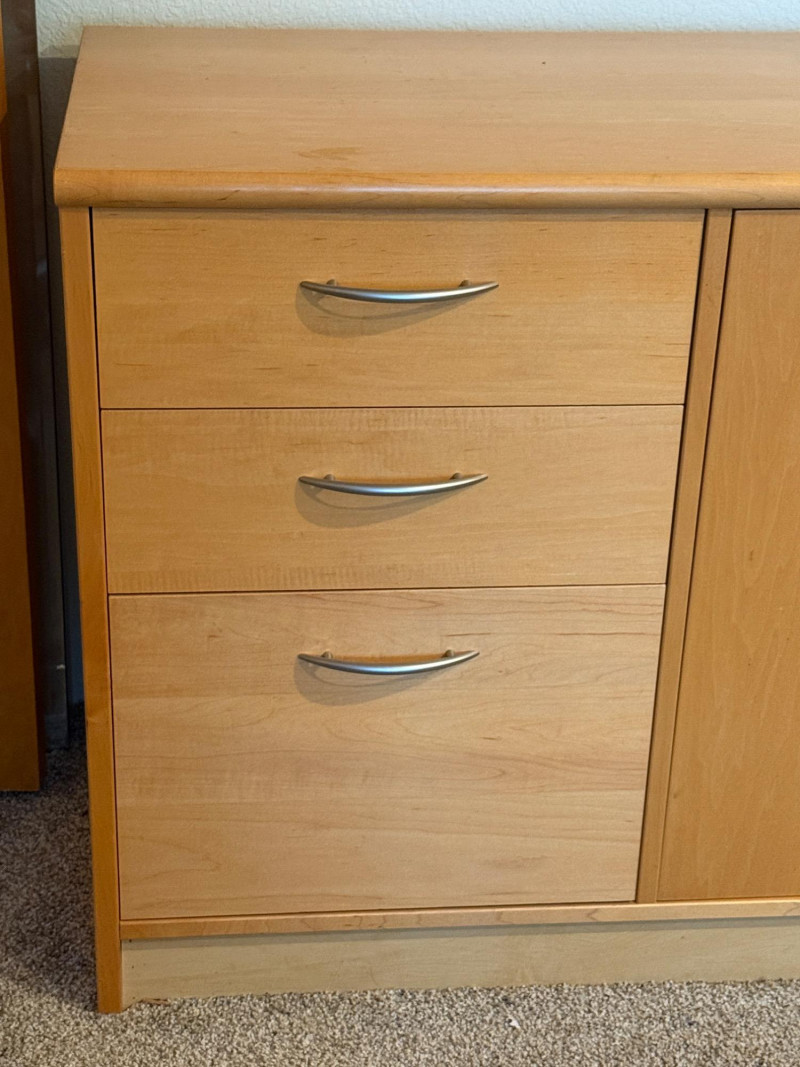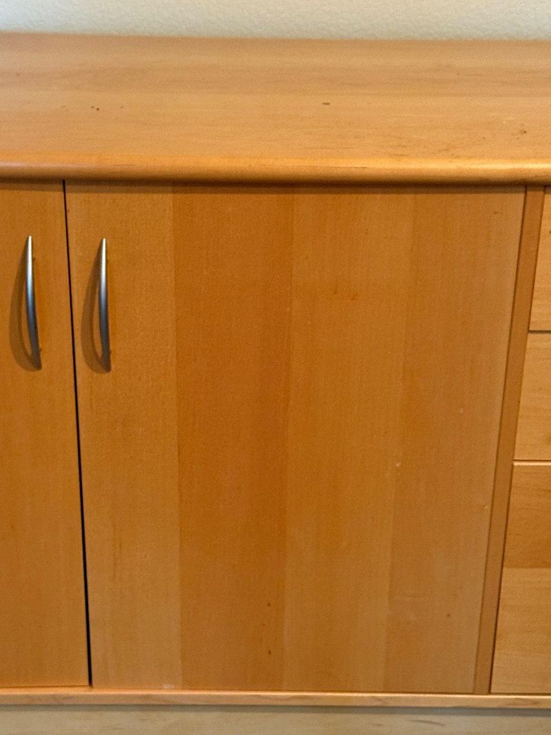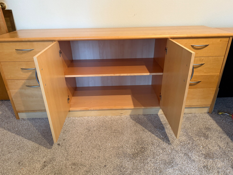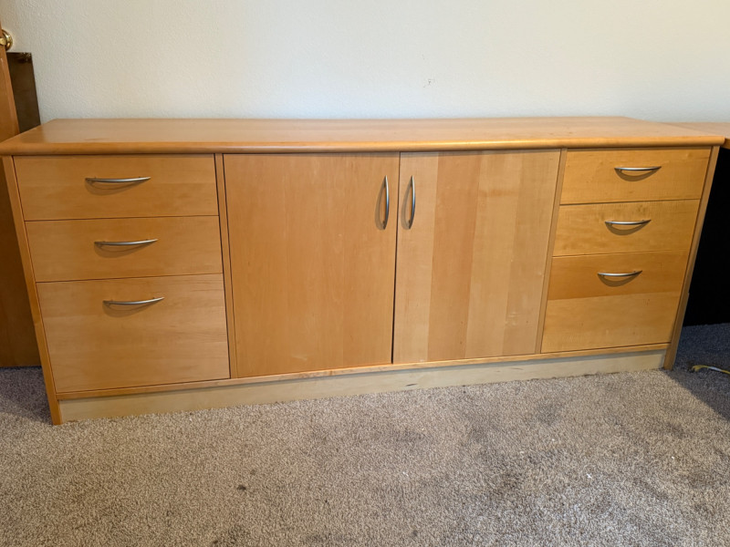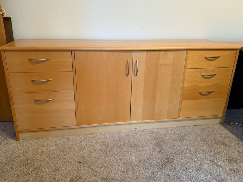 Storage Console 6 Drawer, 2 doors with single shelf Needs surface cleaning with no major damage noted. 71.25x19x29” Matte silver hardware
