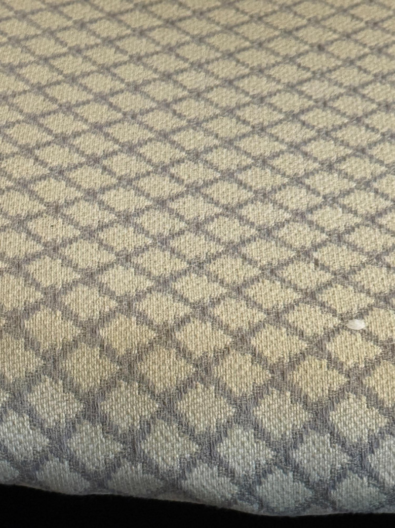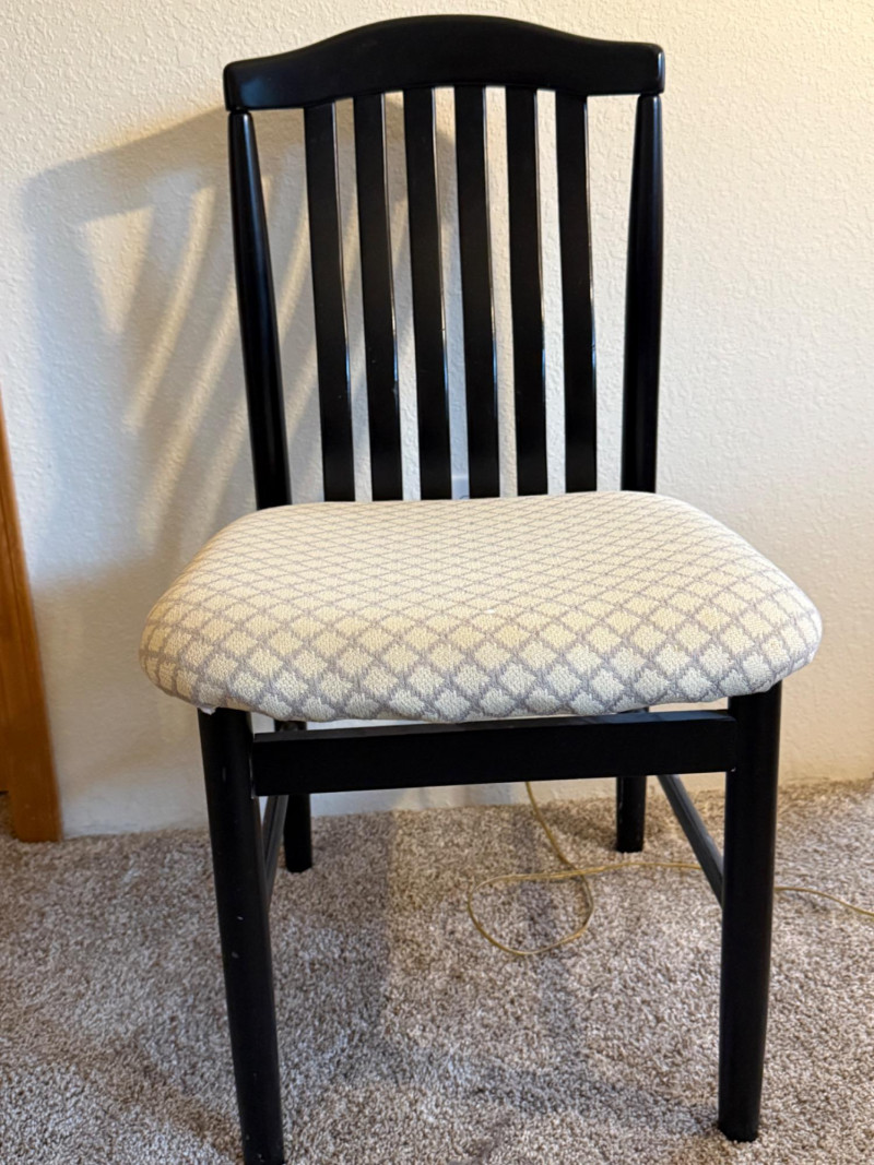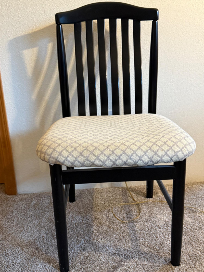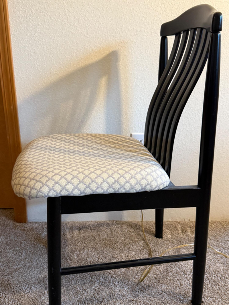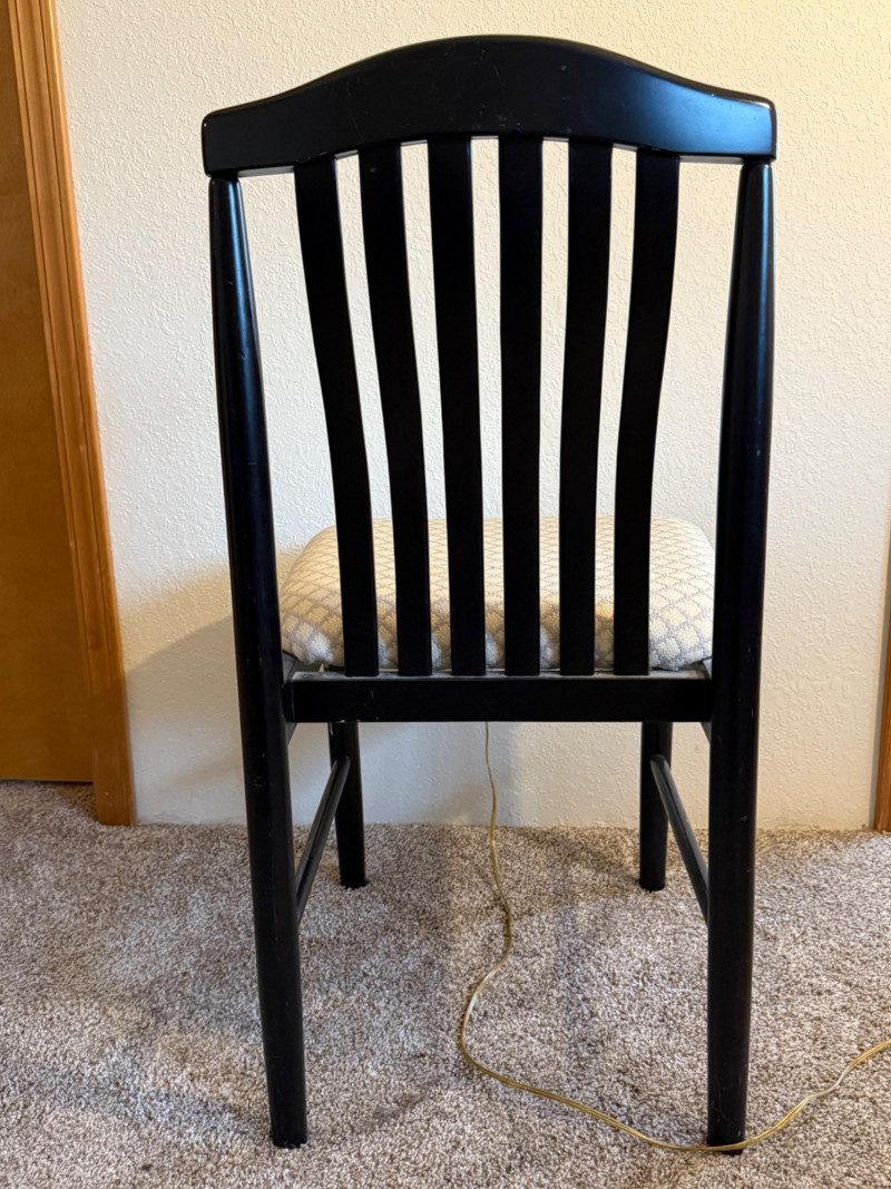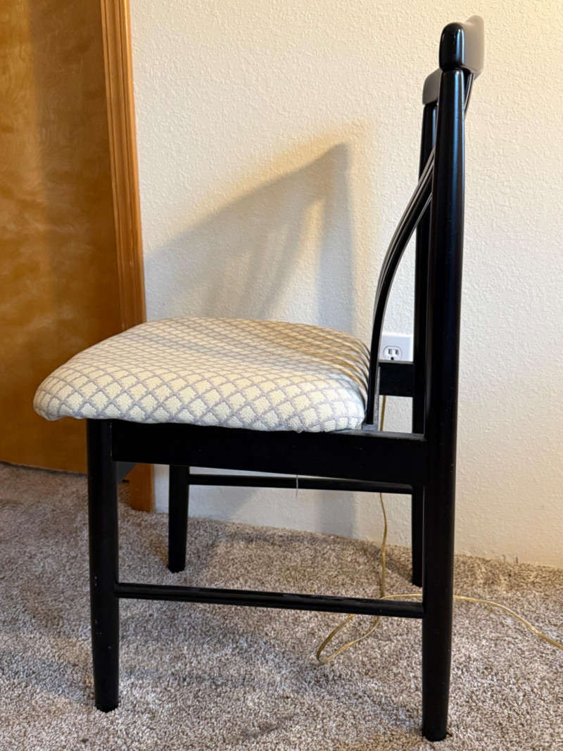 Smaller Size Black Slat Back Side Chair with cream diamond pattern upholstery.