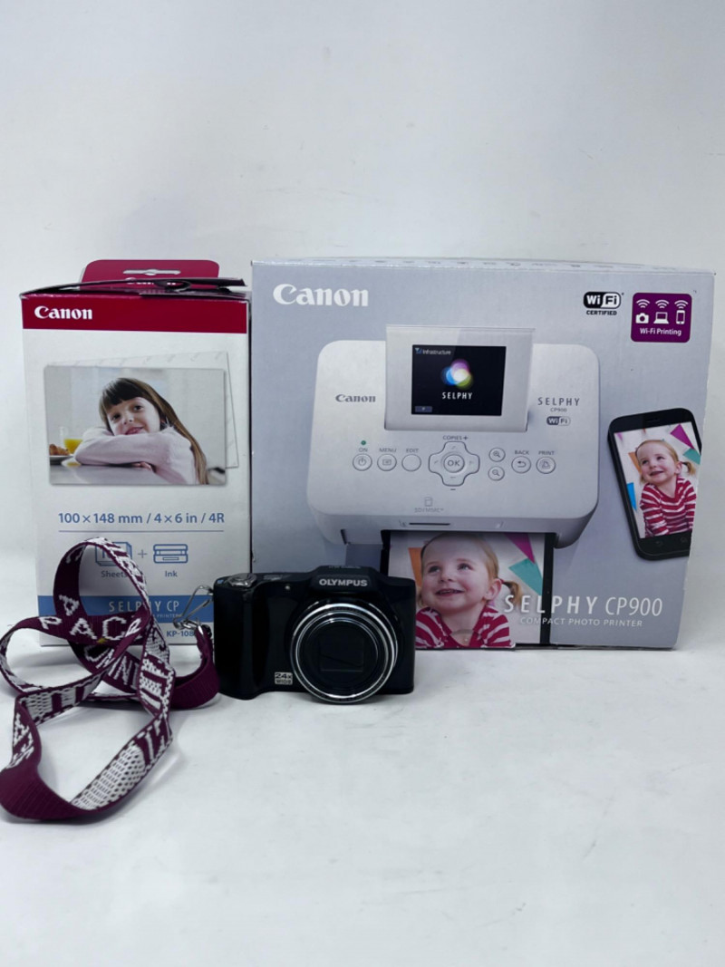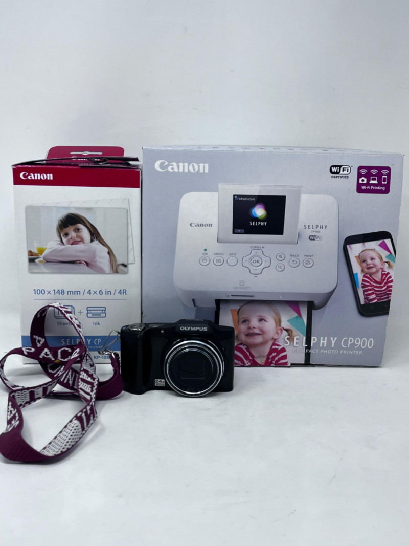 Canon Selphy CP900 & Olympus SZ-14 Selphy CP900 compact photo printer with 4”x6” Selphy sheets and ink cartridges. Tested: powers on. Tri-pod