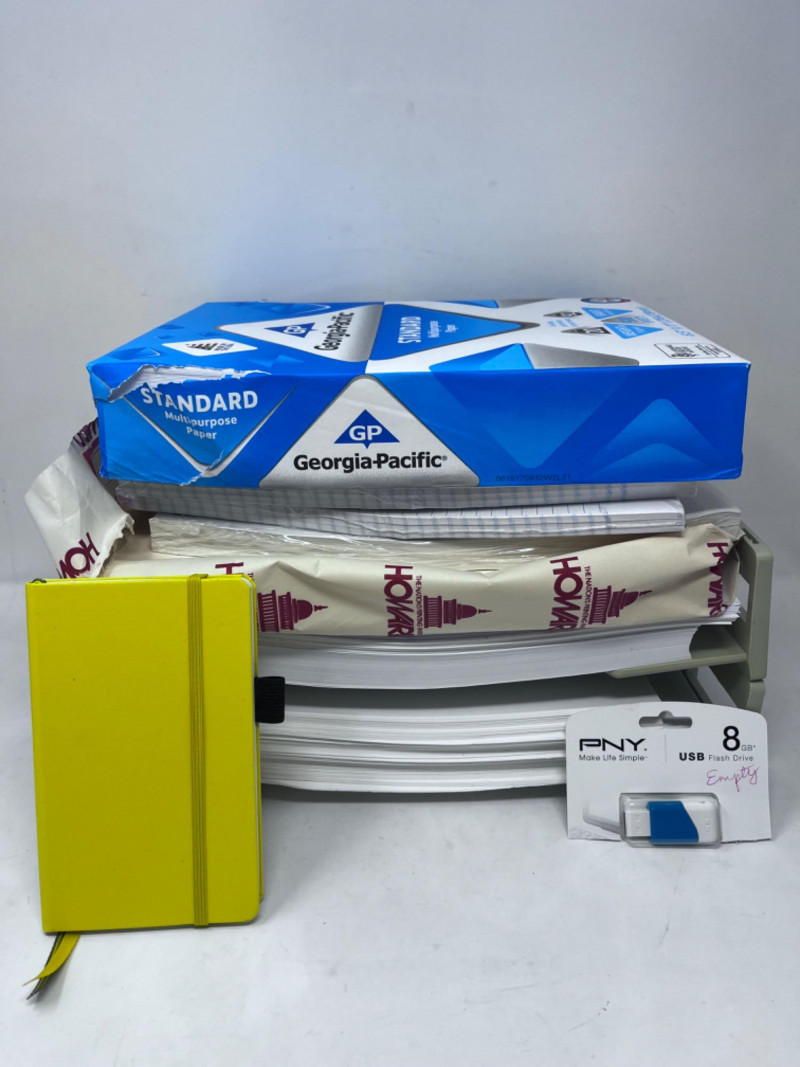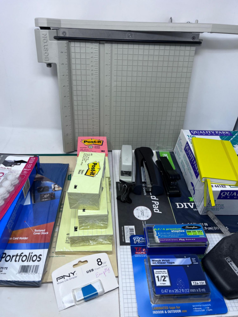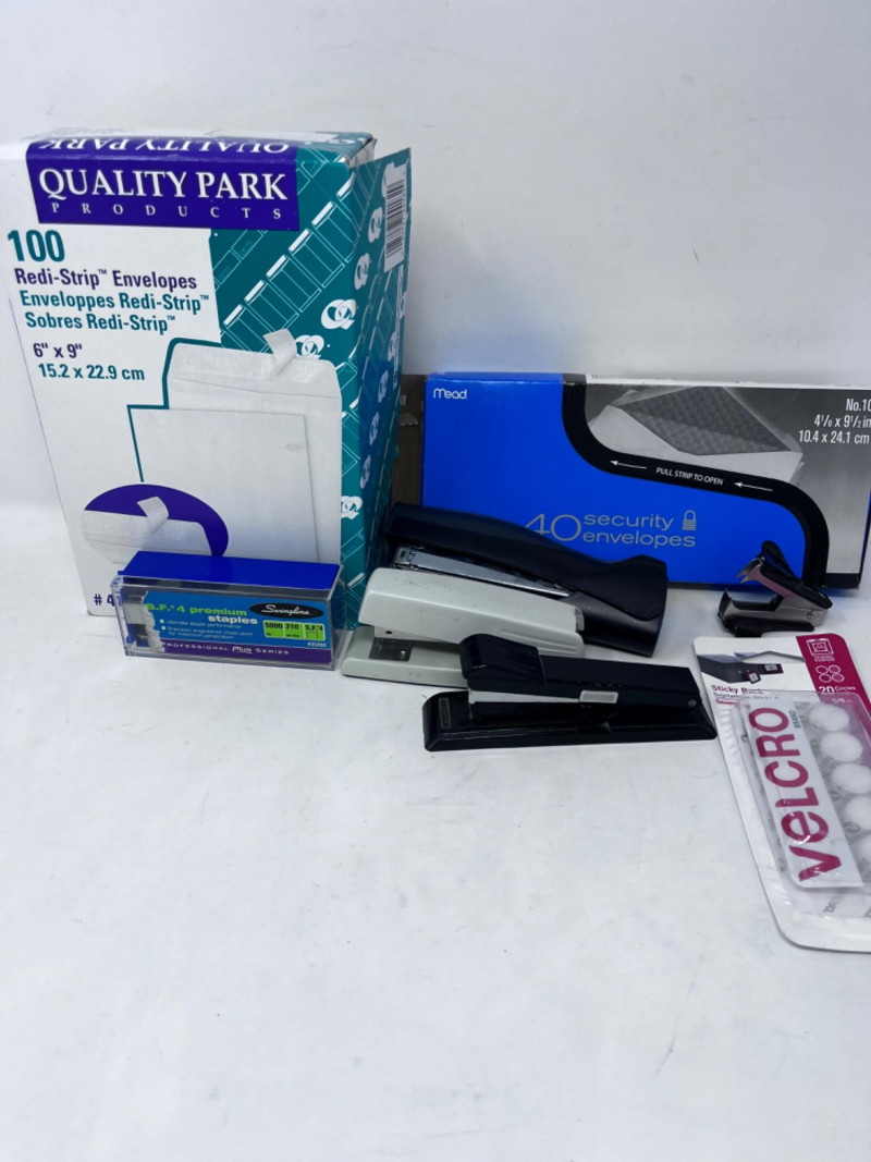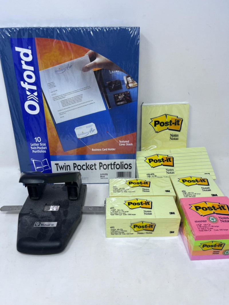 Office Supplies 13”x19” (2) Staplers, a pack of staples, and a staple remover (9) Various Post-it notepads Box of 6”x9” envelopes Box of 4 1/8”x9 1/2” envelopes Pen + Gear dividers. 4x4 Quad Pad McMILLAN Columnar Pad Printer paper (2) packs of lined paper