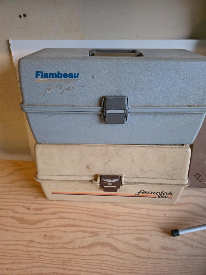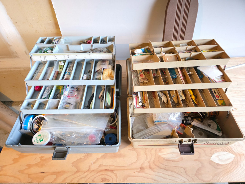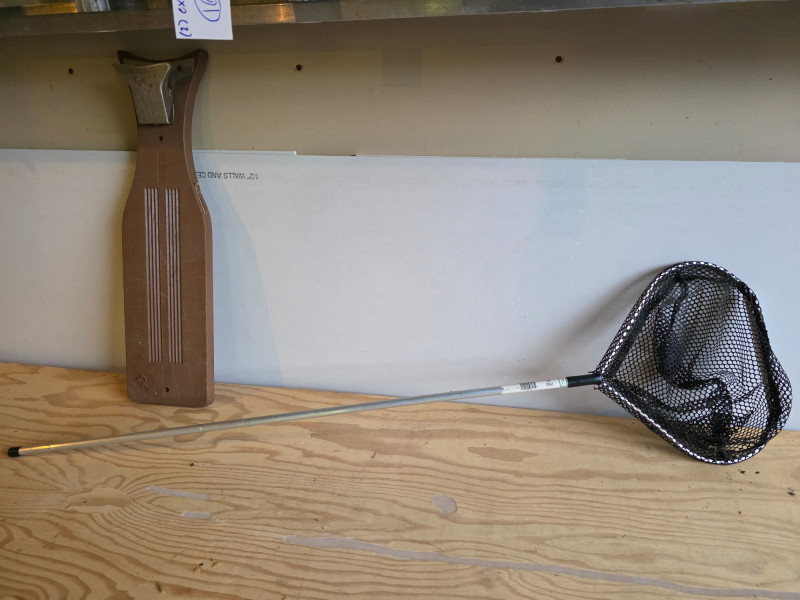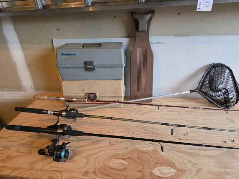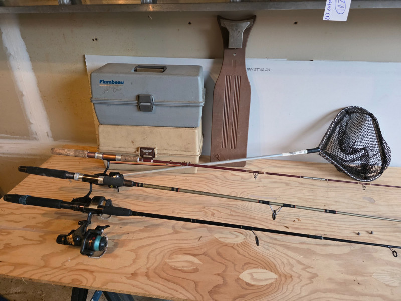 Big Fishing Lot #4 Fishing rod/reel combos, tackle box with gear and pond net (1) Shimano PX200 Graphite Spinning Reel & Shimano FX-2602 6' Spining Rod (1-piece) (1) Mitchell 300A Spinning Reel & Danco Silver Eagle 6.5' Spinning Rod (1-piece) (1) Garcia/Mitchell 300 Spinning Reel & St Croix Pacemaker 6.5' SpinningRod (1-piece) (2) Tackle boxes full of gear (1) 12"W Pond Net With Aluminum Handle (1) Fish Descaling Board