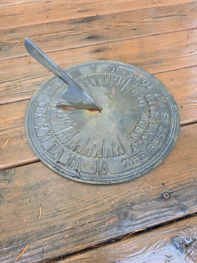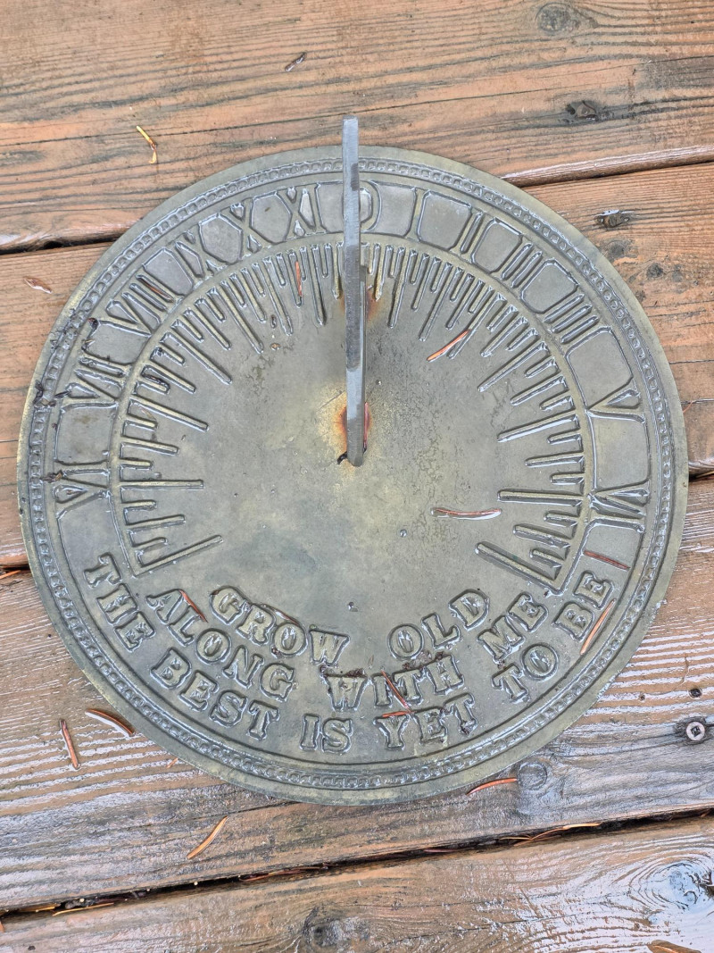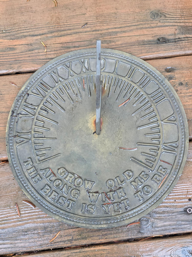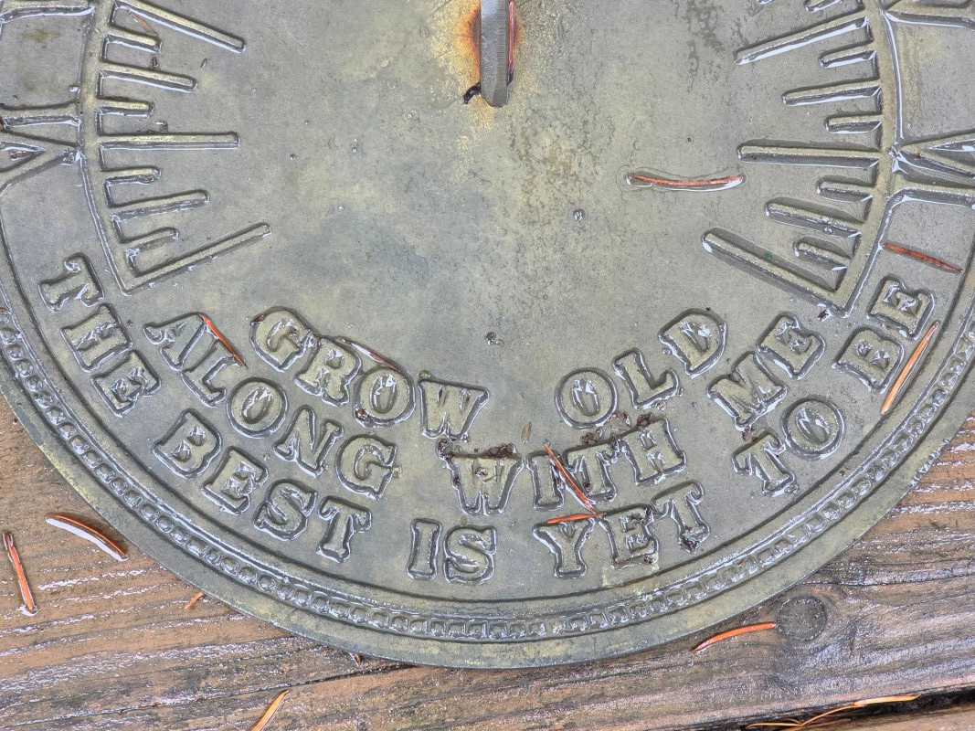 Cast Metal Decorative 11" Sundial Sundial is a decorative garden piece Features a quote often attributed to the Robert Browning poem "Rabbi Ben Ezra" : "GROW OLD ALONG WITH ME THE BEST IS YET TO BE" 5.5"T x 11"Round