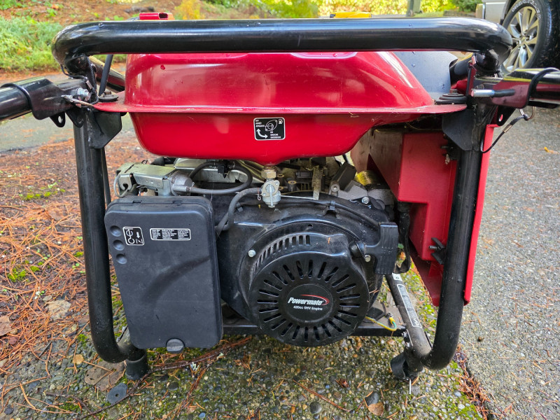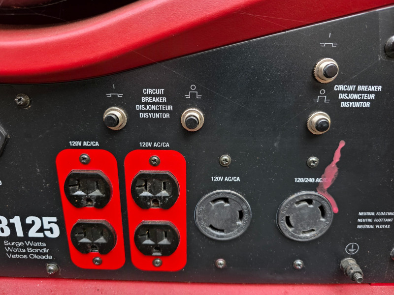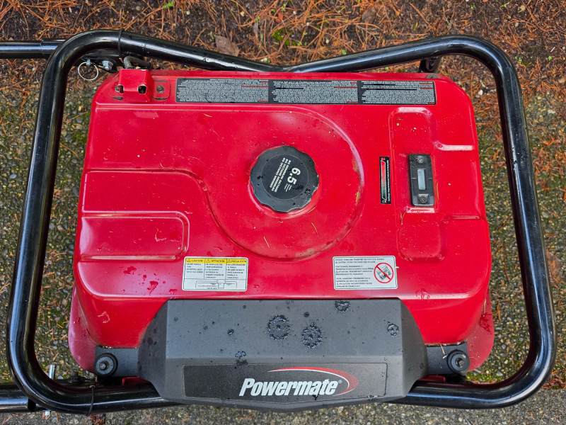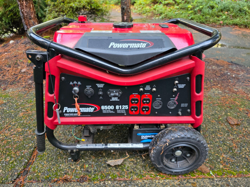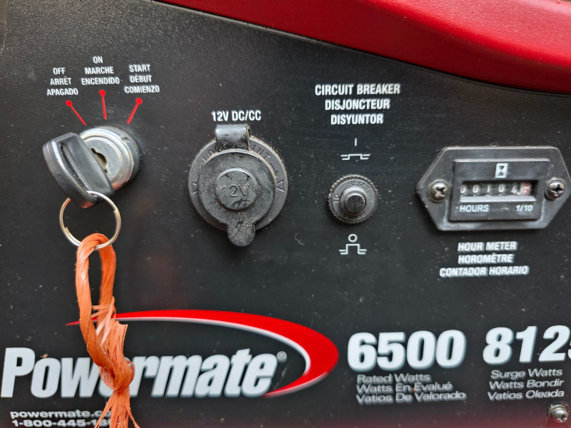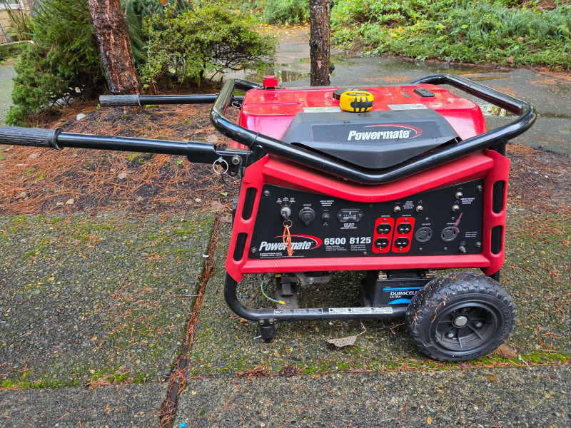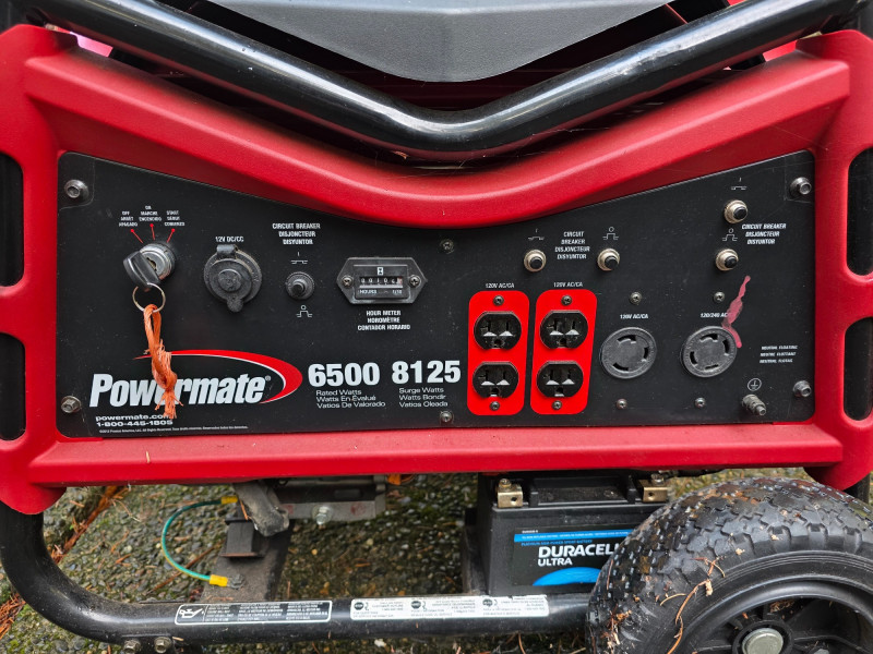 Powermate VX 8125/6500W Portable Gas Generator Powermate Model #PM0106507.01 Easy electric start (keyed) Only 104.7 hours on engine Featuring 6500 running watts and 8125 starting/maximum watts. Key Specifications Running Watts: 6,500 W Maximum/Surge Watts: 8,125 W Engine: Powered by a Powermate 420cc OHV engine Fuel Type: Gasoline Fuel Capacity: 6.5 gallon fuel tank Run Time: Runs for approximately 9 to 9.7 hours at a 50% load Start Type: Features an electric start (battery included) with a recoil backup Outlets: Typically includes a variety of 120V and 240V outlets, such as 120V 20A GFCI duplex and 120/240V 30A twistlock receptacles Features: Includes low oil shutdown, automatic voltage regulation (AVR), and never-flat wheels for portability Includes manual & 5 gallon gas can Tested - Works! 24"T x 27"W x 29"D