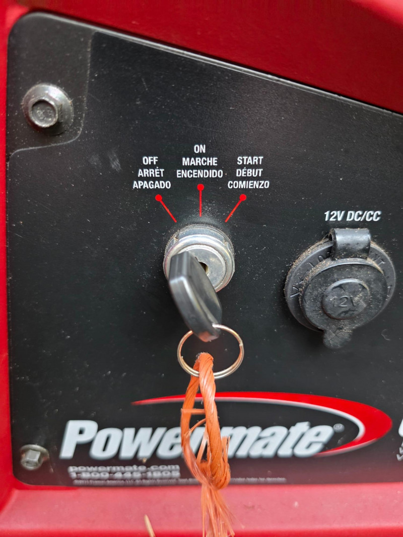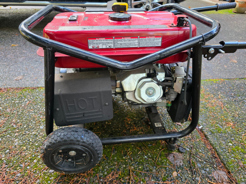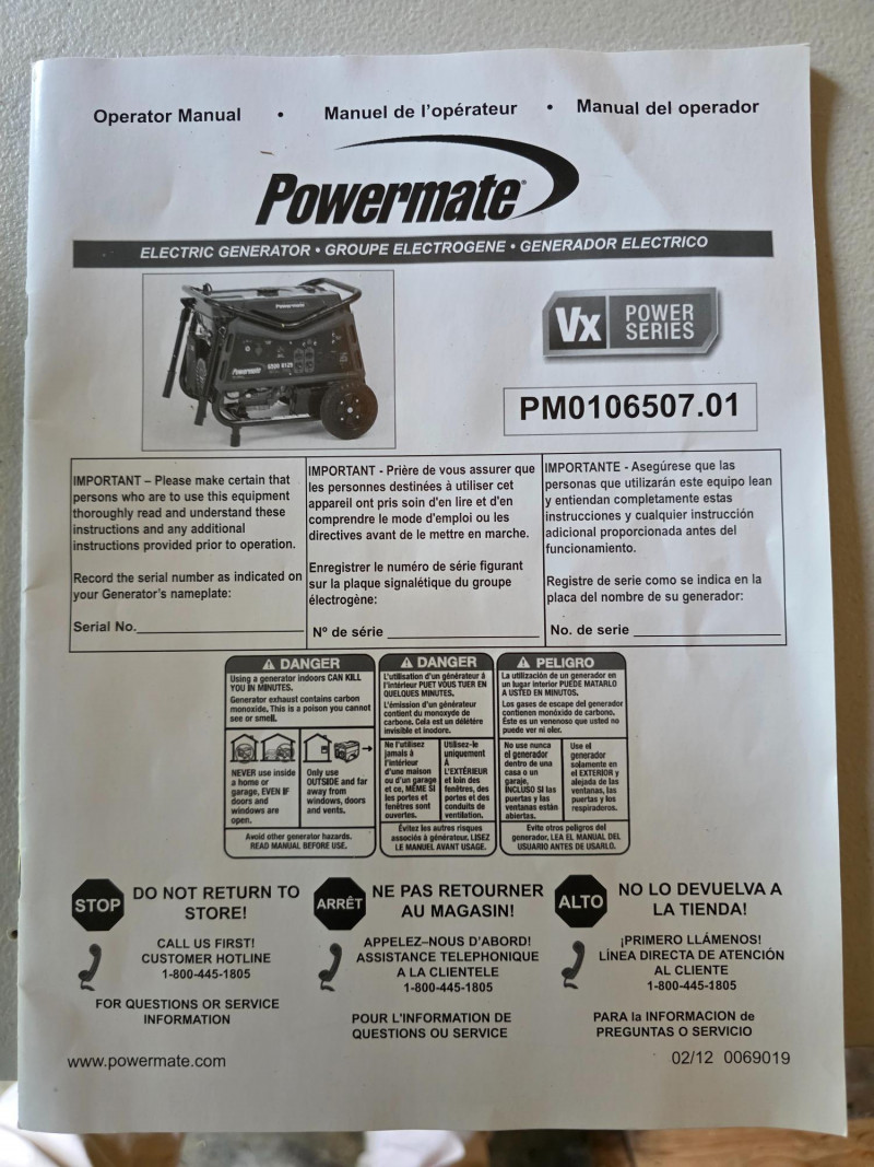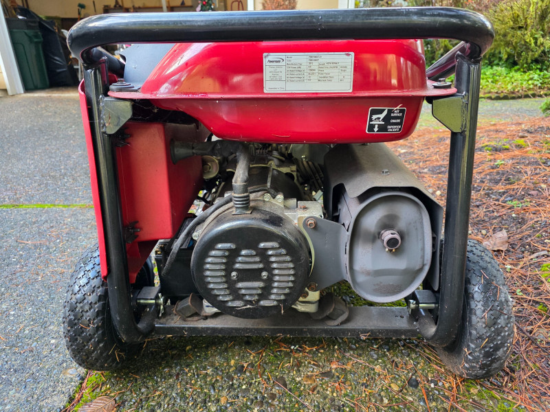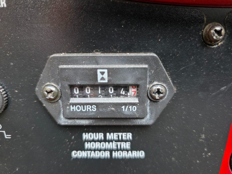 Powermate VX 8125/6500W Portable Gas Generator Powermate Model #PM0106507.01 Easy electric start (keyed) Only 104.7 hours on engine Featuring 6500 running watts and 8125 starting/maximum watts. Key Specifications Running Watts: 6,500 W Maximum/Surge Watts: 8,125 W Engine: Powered by a Powermate 420cc OHV engine Fuel Type: Gasoline Fuel Capacity: 6.5 gallon fuel tank Run Time: Runs for approximately 9 to 9.7 hours at a 50% load Start Type: Features an electric start (battery included) with a recoil backup Outlets: Typically includes a variety of 120V and 240V outlets, such as 120V 20A GFCI duplex and 120/240V 30A twistlock receptacles Features: Includes low oil shutdown, automatic voltage regulation (AVR), and never-flat wheels for portability Includes manual & 5 gallon gas can Tested - Works! 24"T x 27"W x 29"D