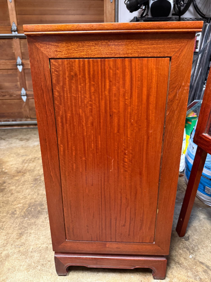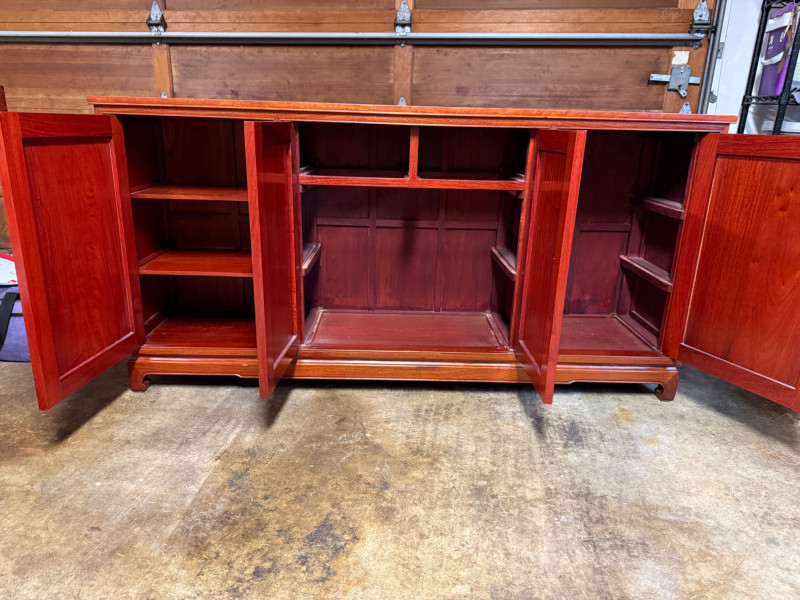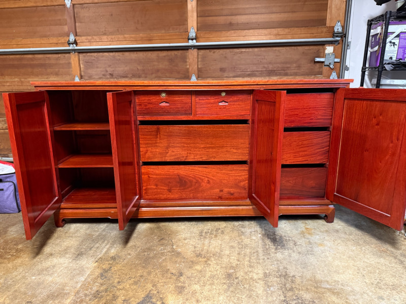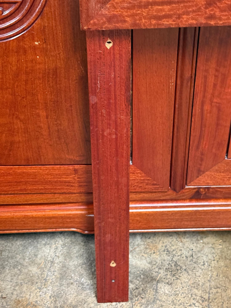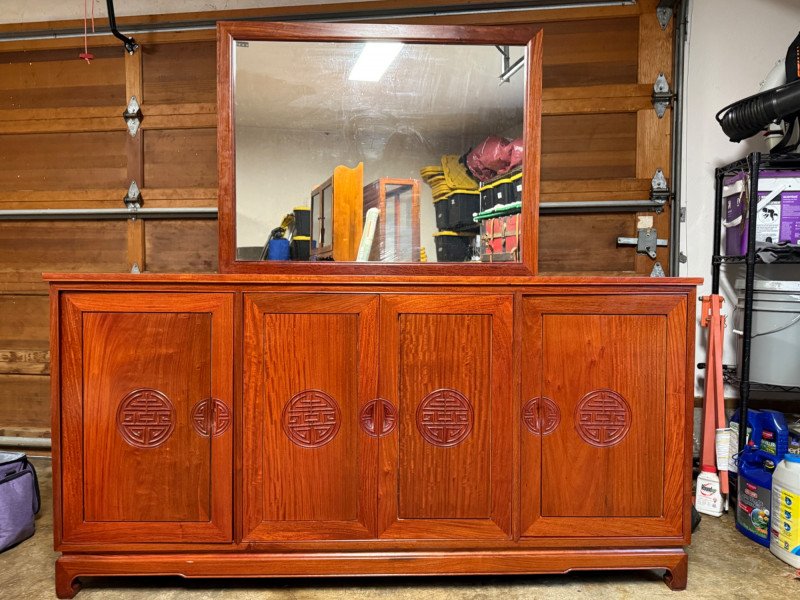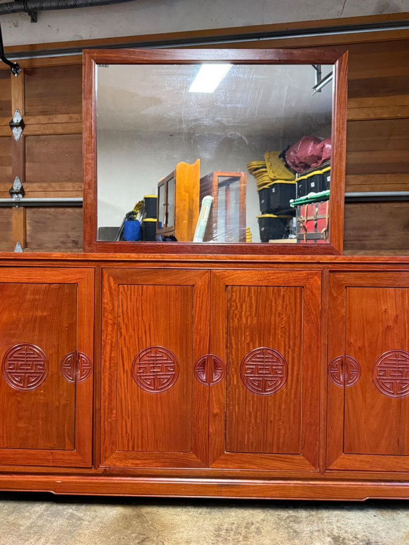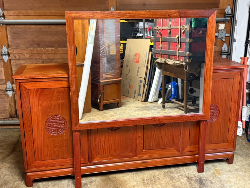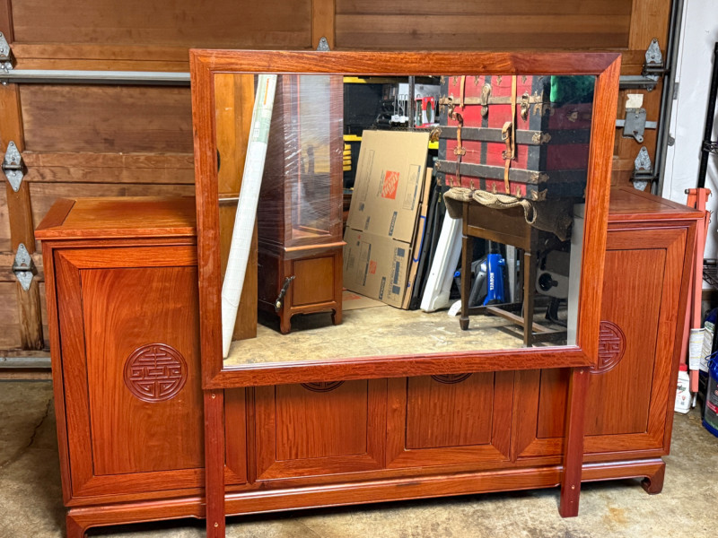 Rosewood Dresser with 4 doors, 7 drawers and 2 shelves measures 18”x72.5”x36” Mirror minus the mounting posts measures 44”x34”