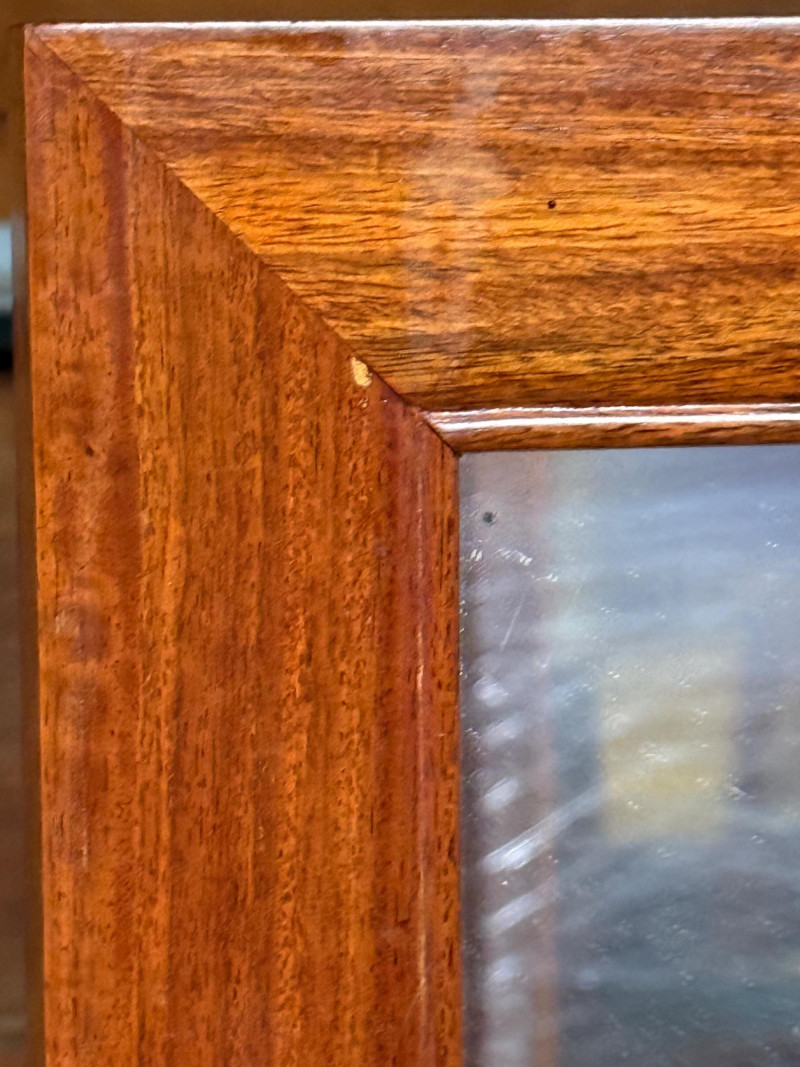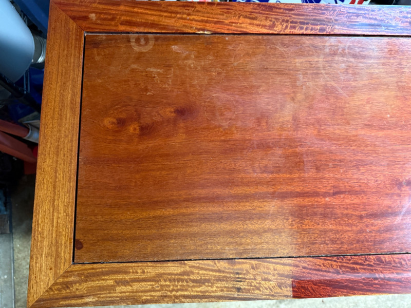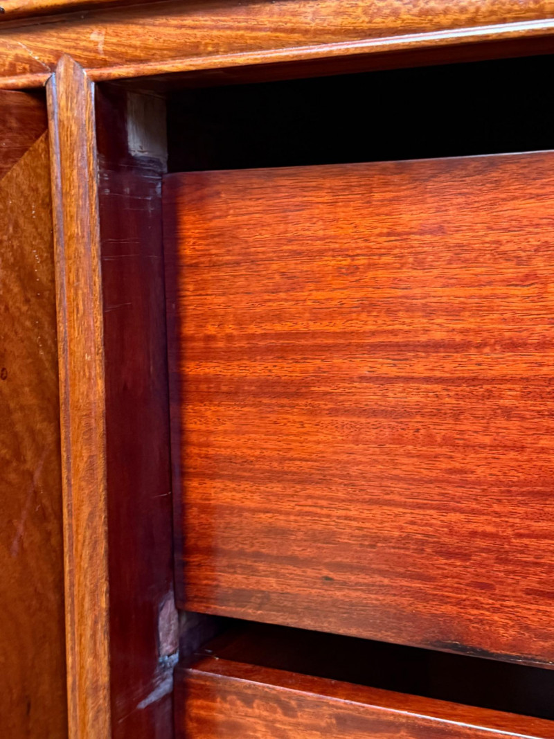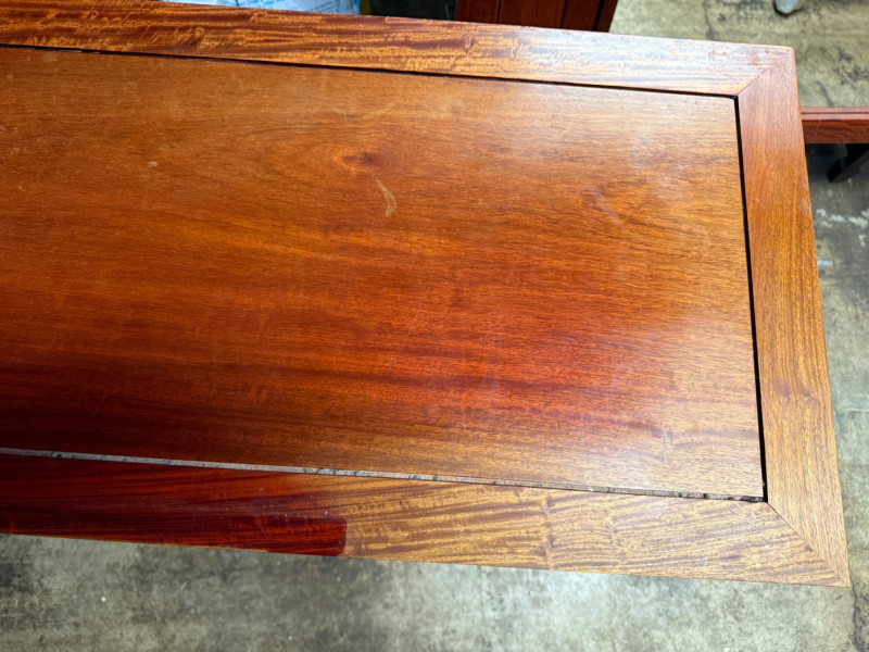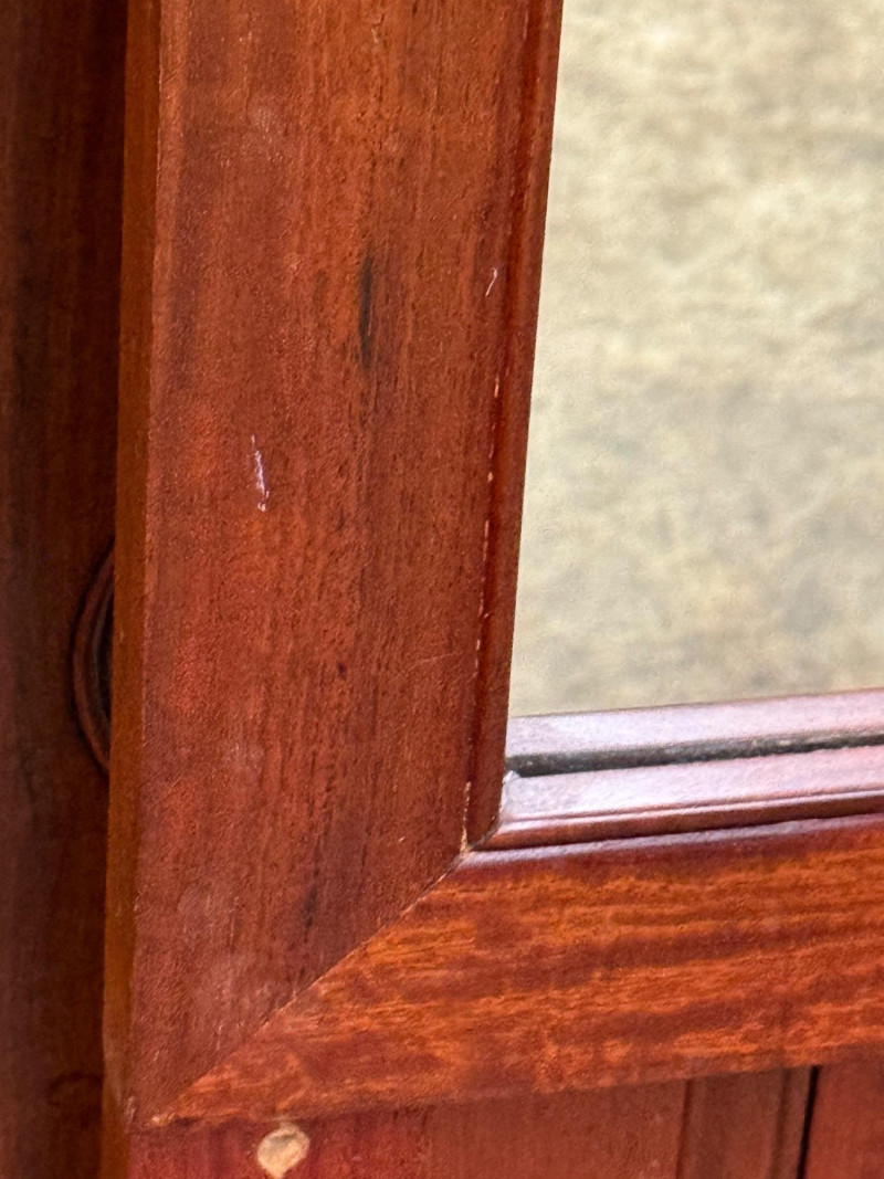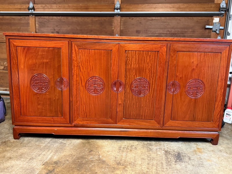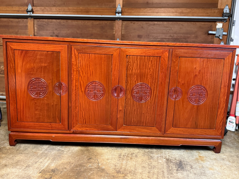 Rosewood Dresser with 4 doors, 7 drawers and 2 shelves measures 18”x72.5”x36” Mirror minus the mounting posts measures 44”x34”