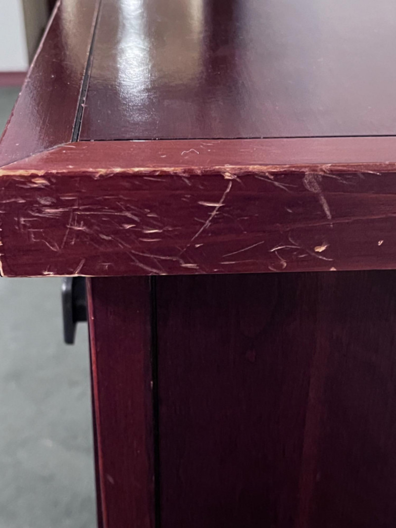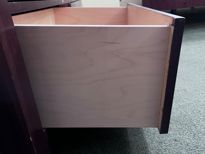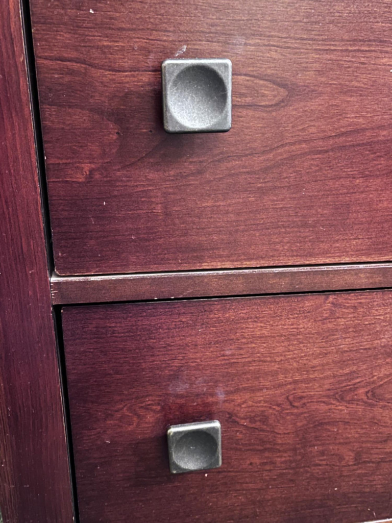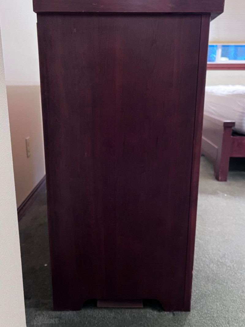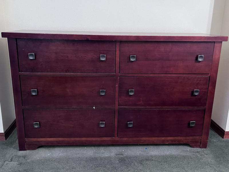 Modern Cherry Finish Wood 6–Drawer Dresser White paint stain on front.