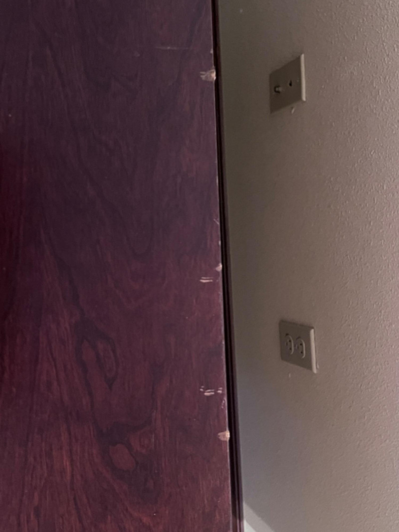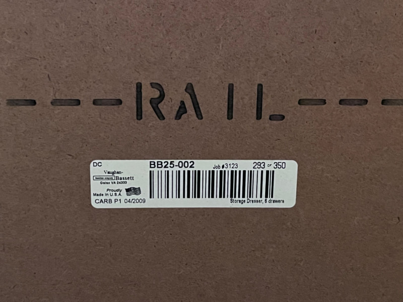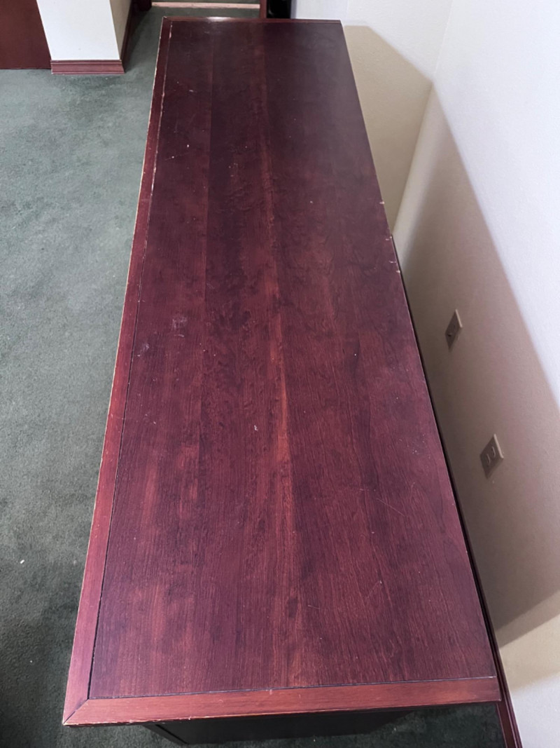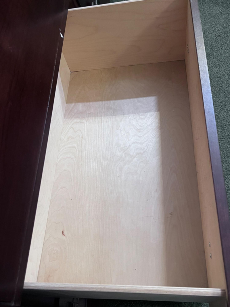 Modern Cherry Finish Wood 6–Drawer Dresser White paint stain on front.