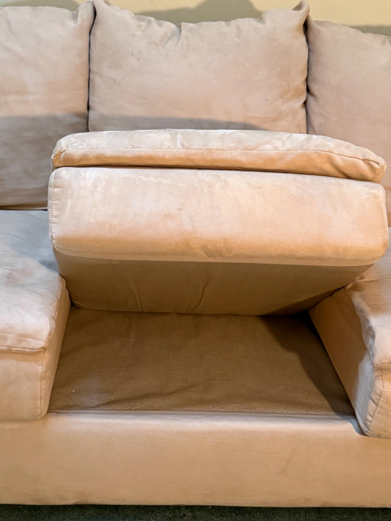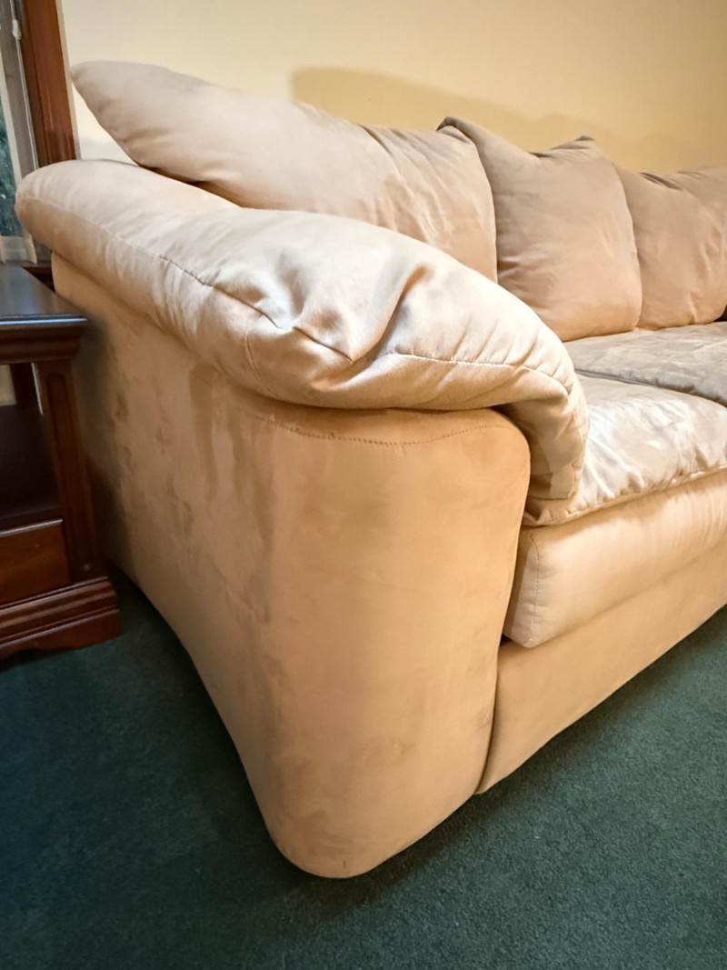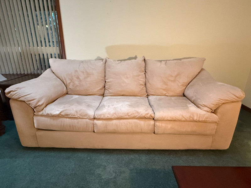 Beige microfiber sofa with removable seat cushions.