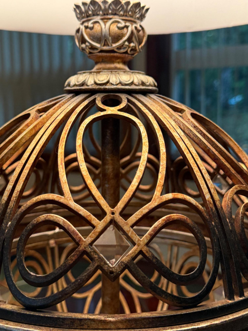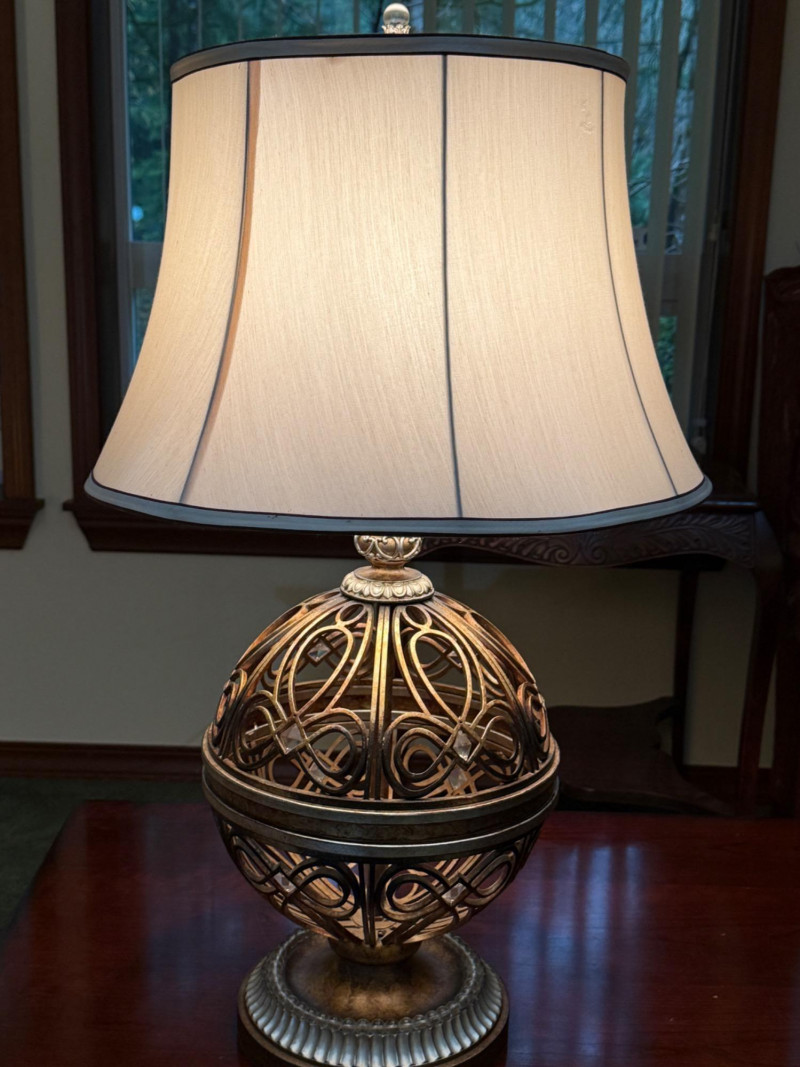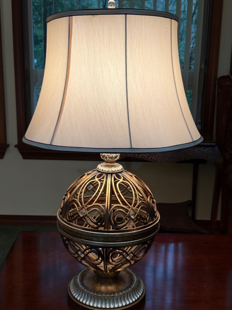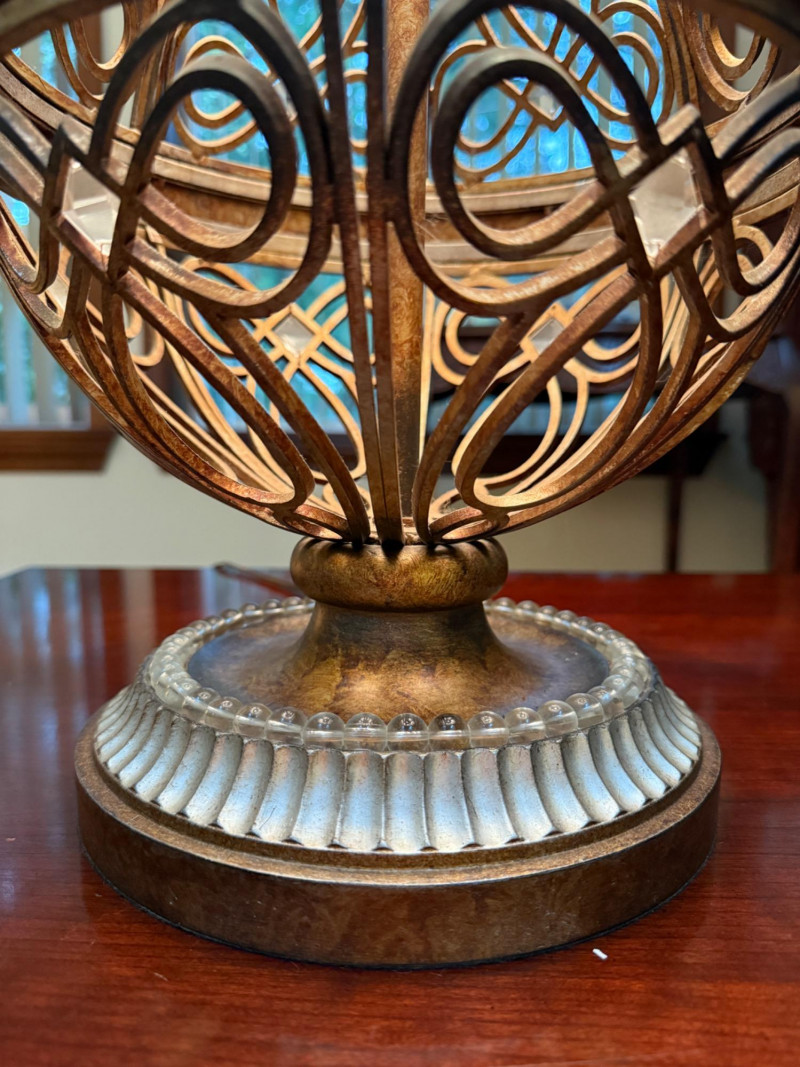 Ornate, spherical metal table lamp, bronze-tone finish and an openwork orb-shaped base Metal Globe 3-Way Table Lamp 11” diameter, 3” tall and 19” shade width. Silver and brass tone metals. This is a substantial lamp.