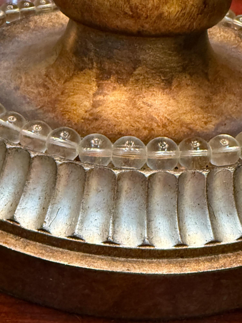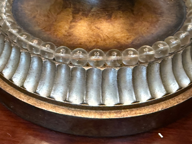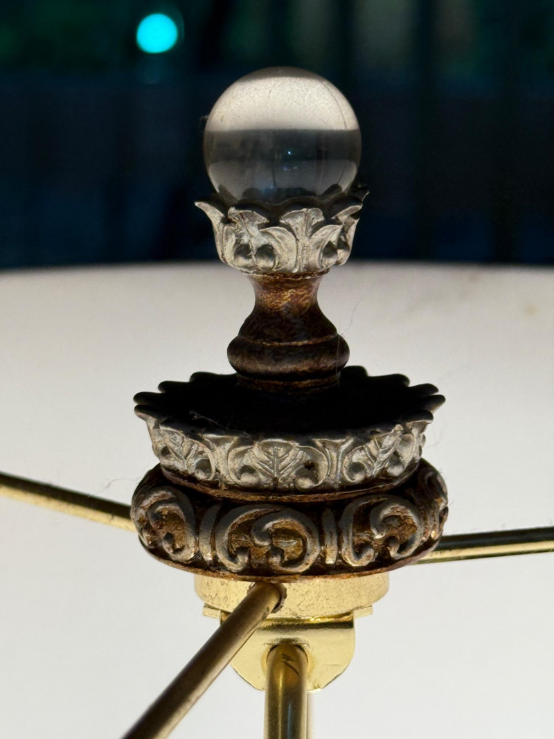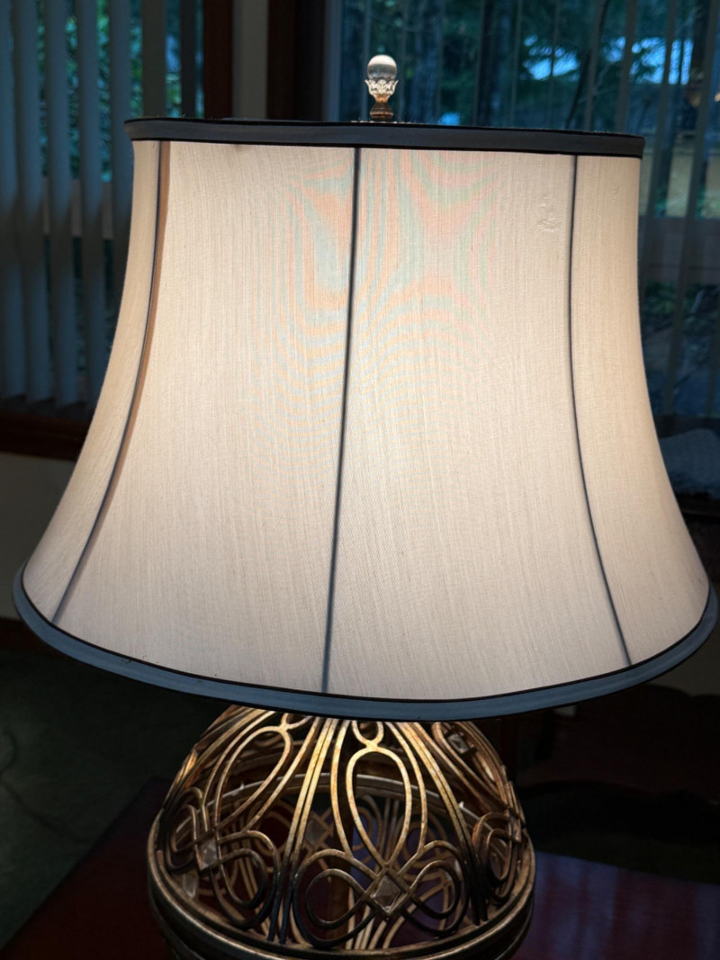 Ornate, spherical metal table lamp, bronze-tone finish and an openwork orb-shaped base Metal Globe 3-Way Table Lamp 11” diameter, 3” tall and 19” shade width. Silver and brass tone metals. This is a substantial lamp.