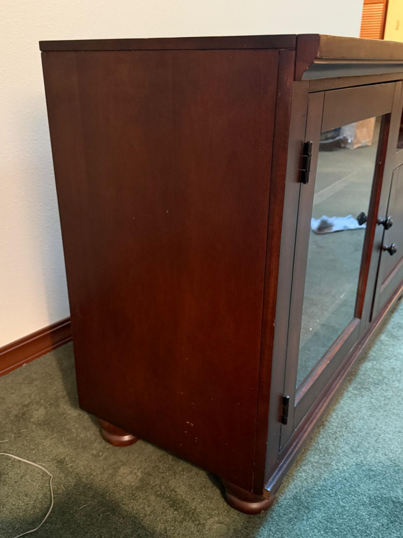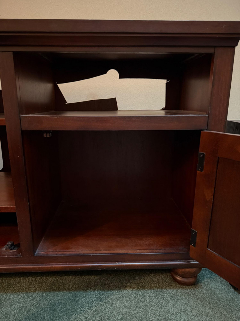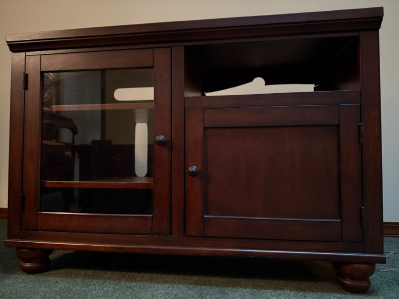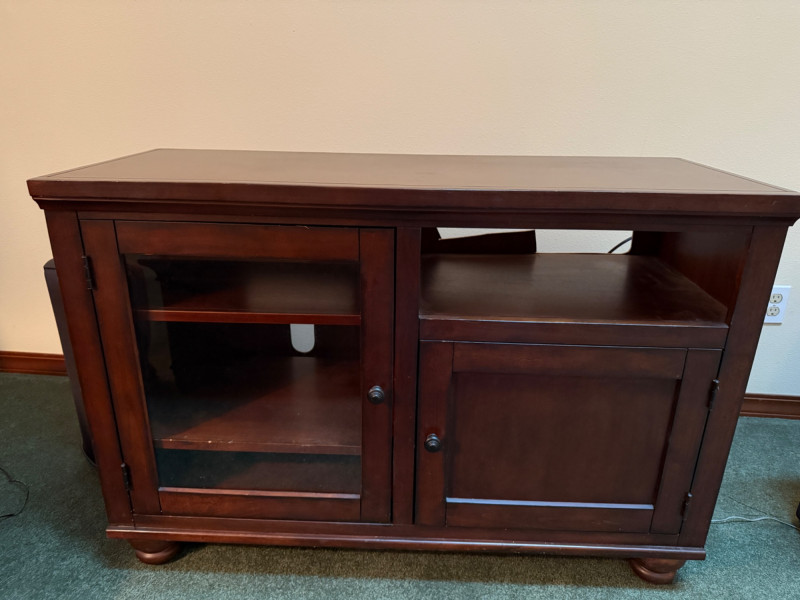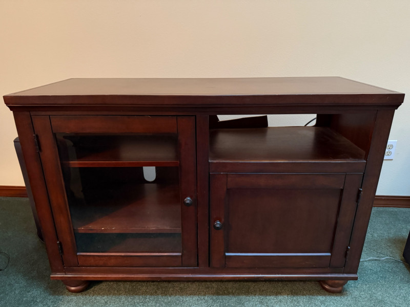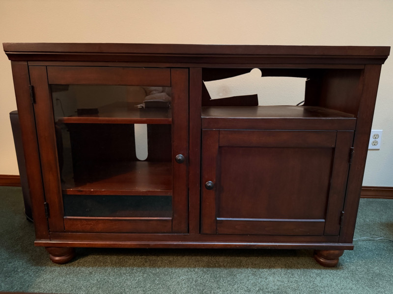 Dark Wood Media Center Glass door with 2 shelves, right side open shelf and cabinet door with oil rubbed bronze hardware. Normal dings and surface scratches.