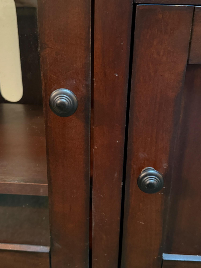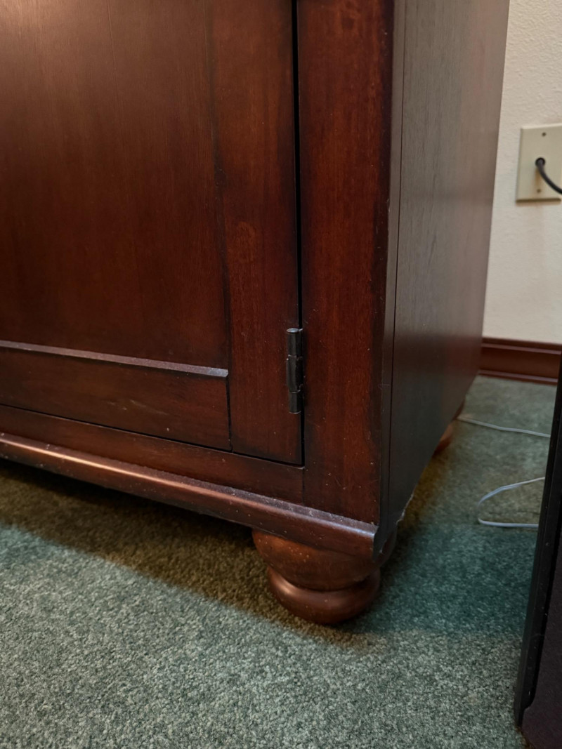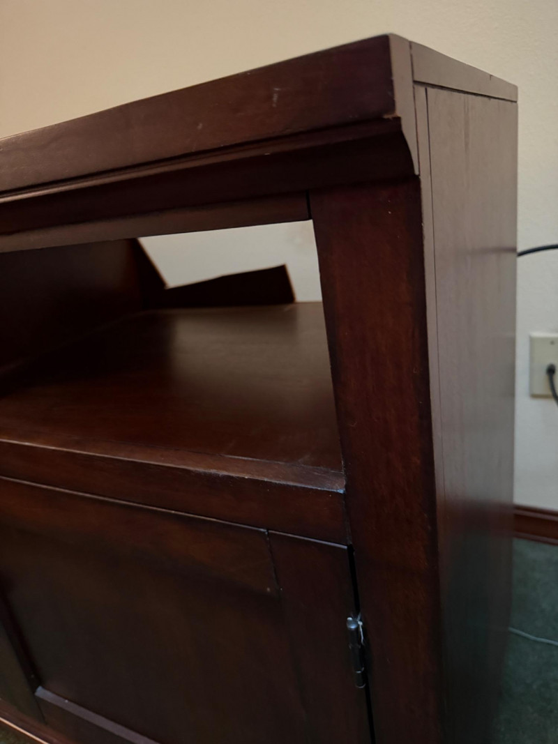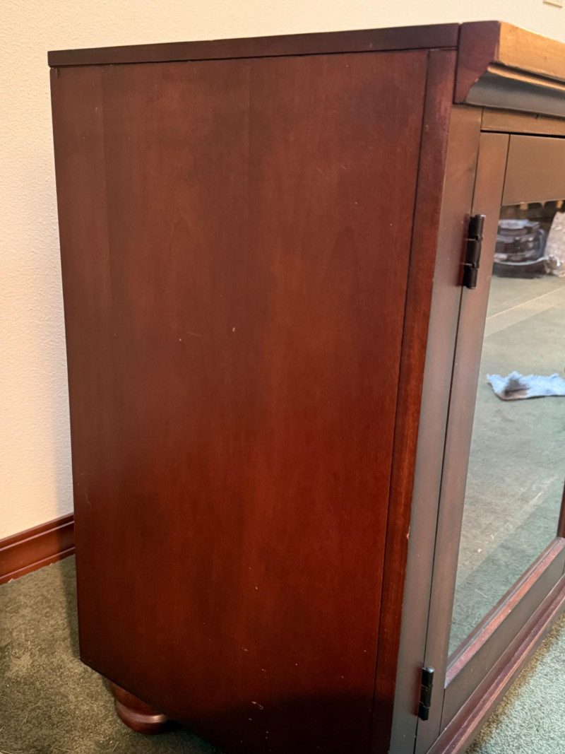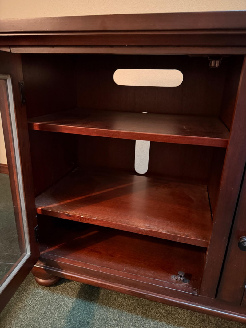 Dark Wood Media Center Glass door with 2 shelves, right side open shelf and cabinet door with oil rubbed bronze hardware. Normal dings and surface scratches.