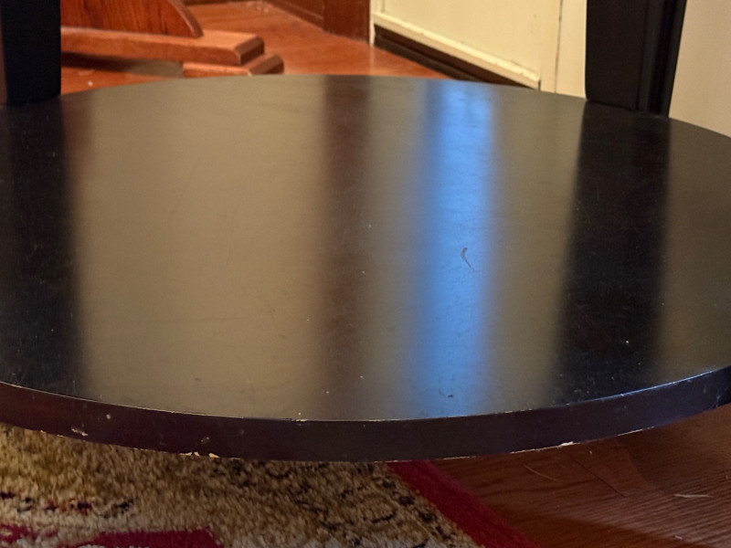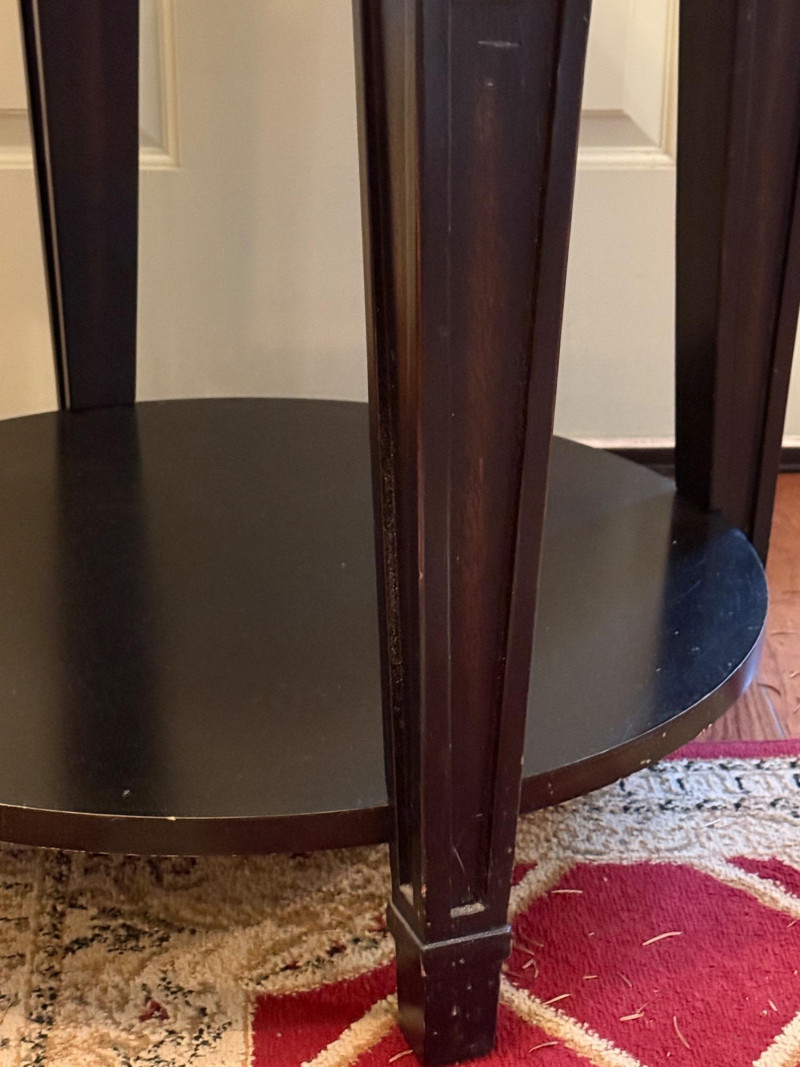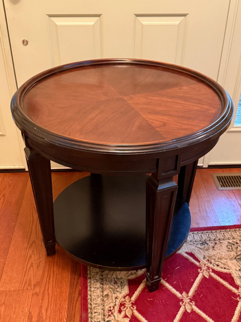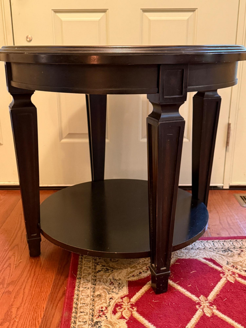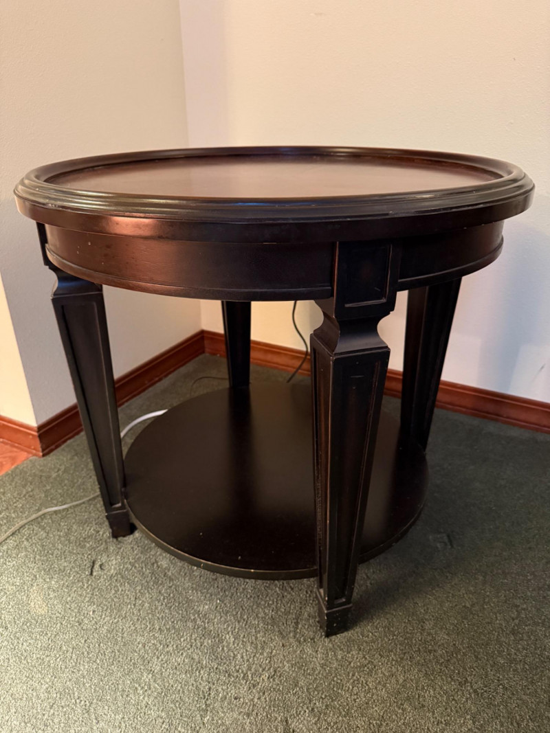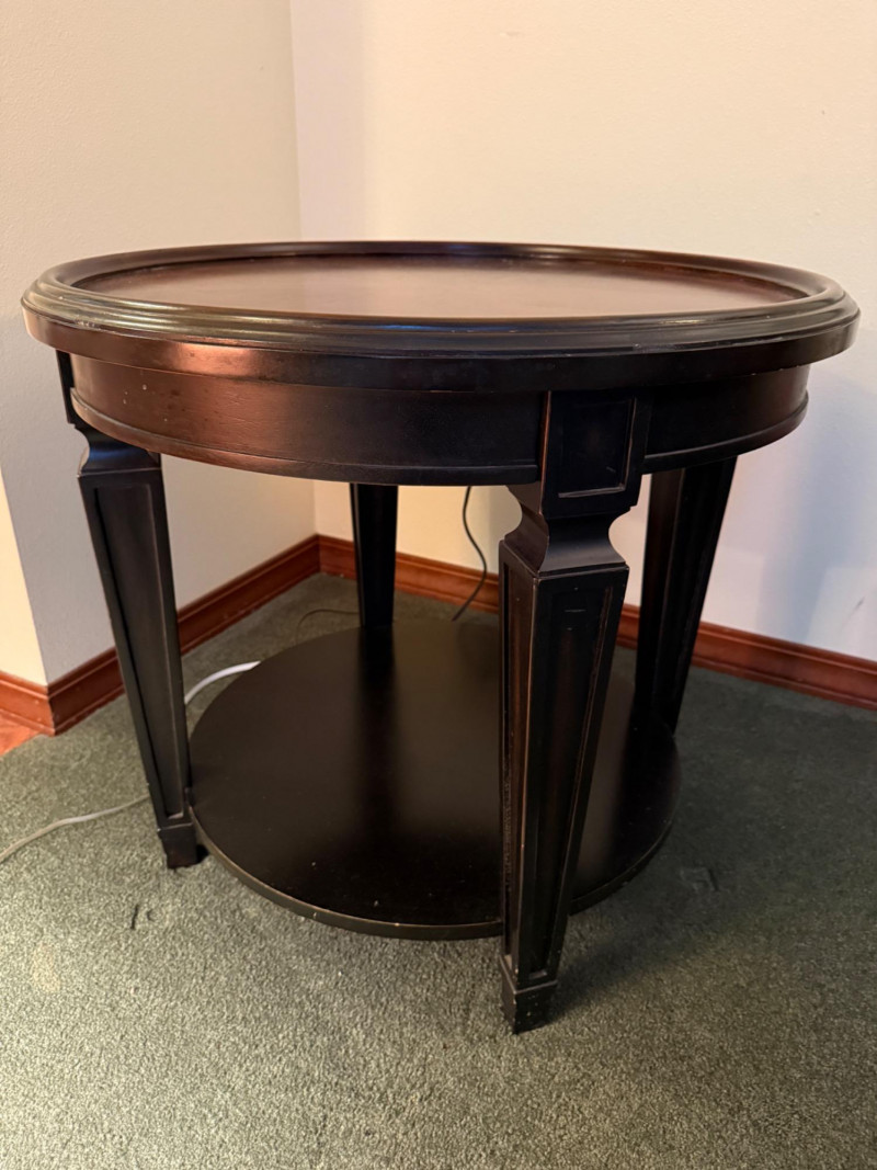 Round Occasional Table Dark wood table with raised edge and tapered legs and one lower shelf. 28”diameter and 25” tall.
