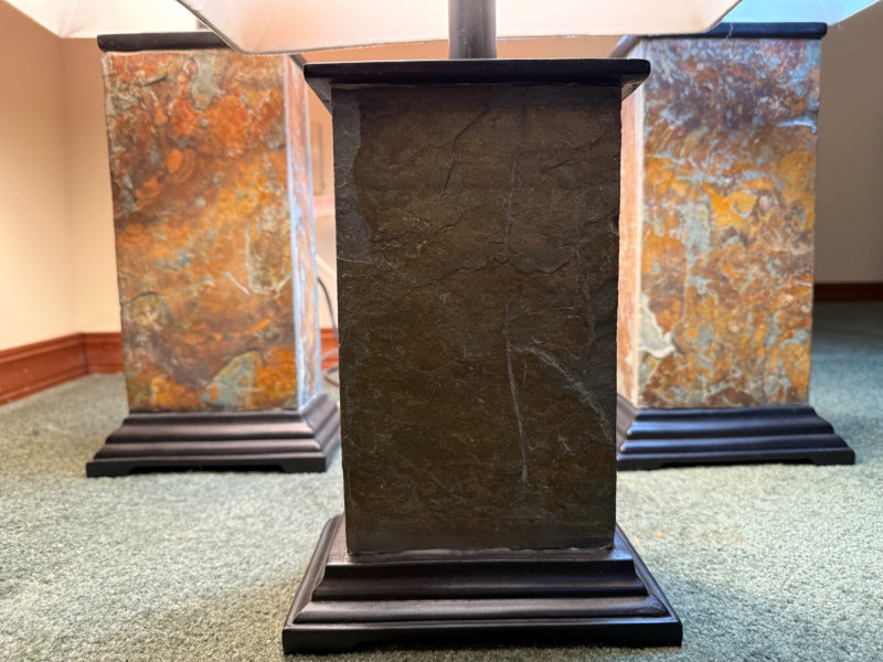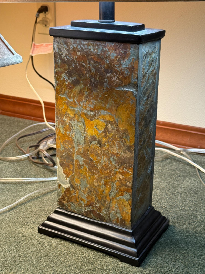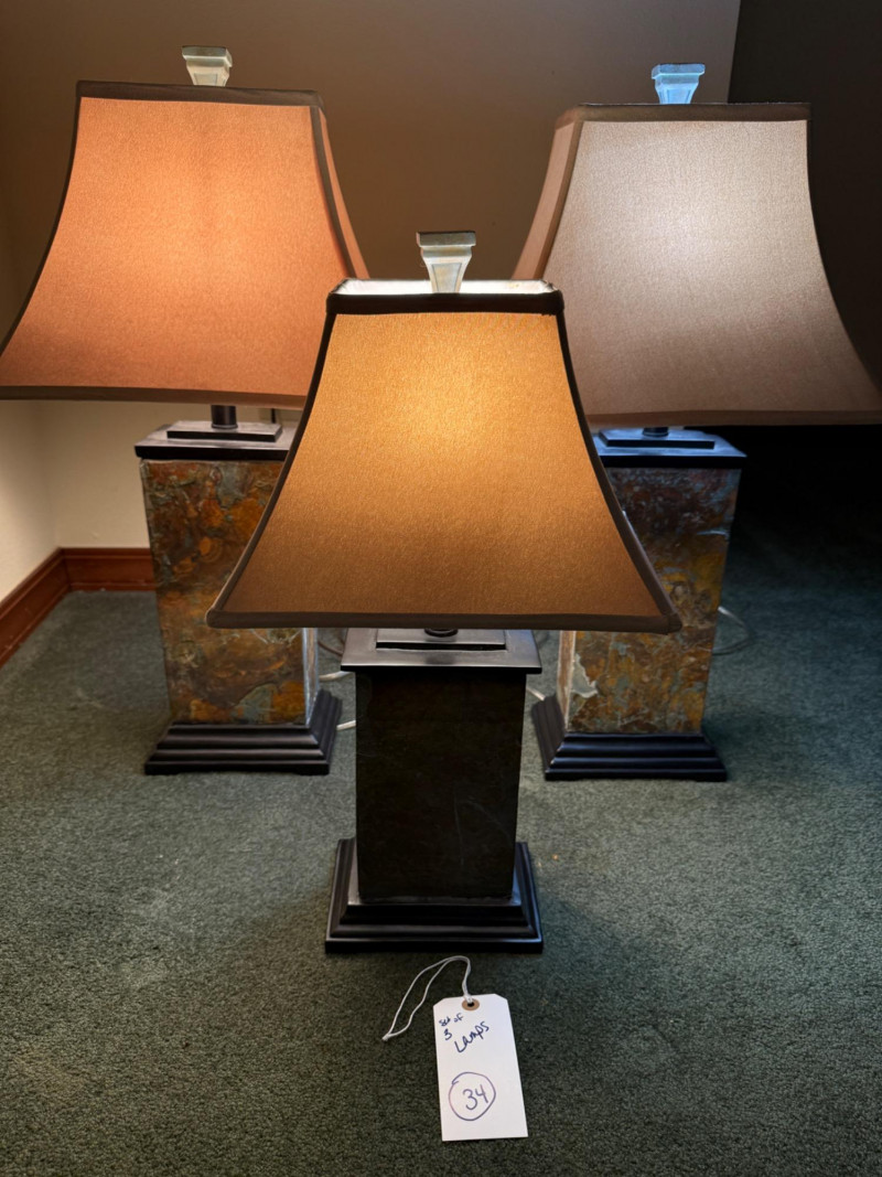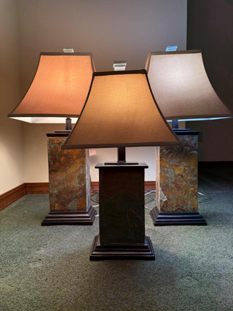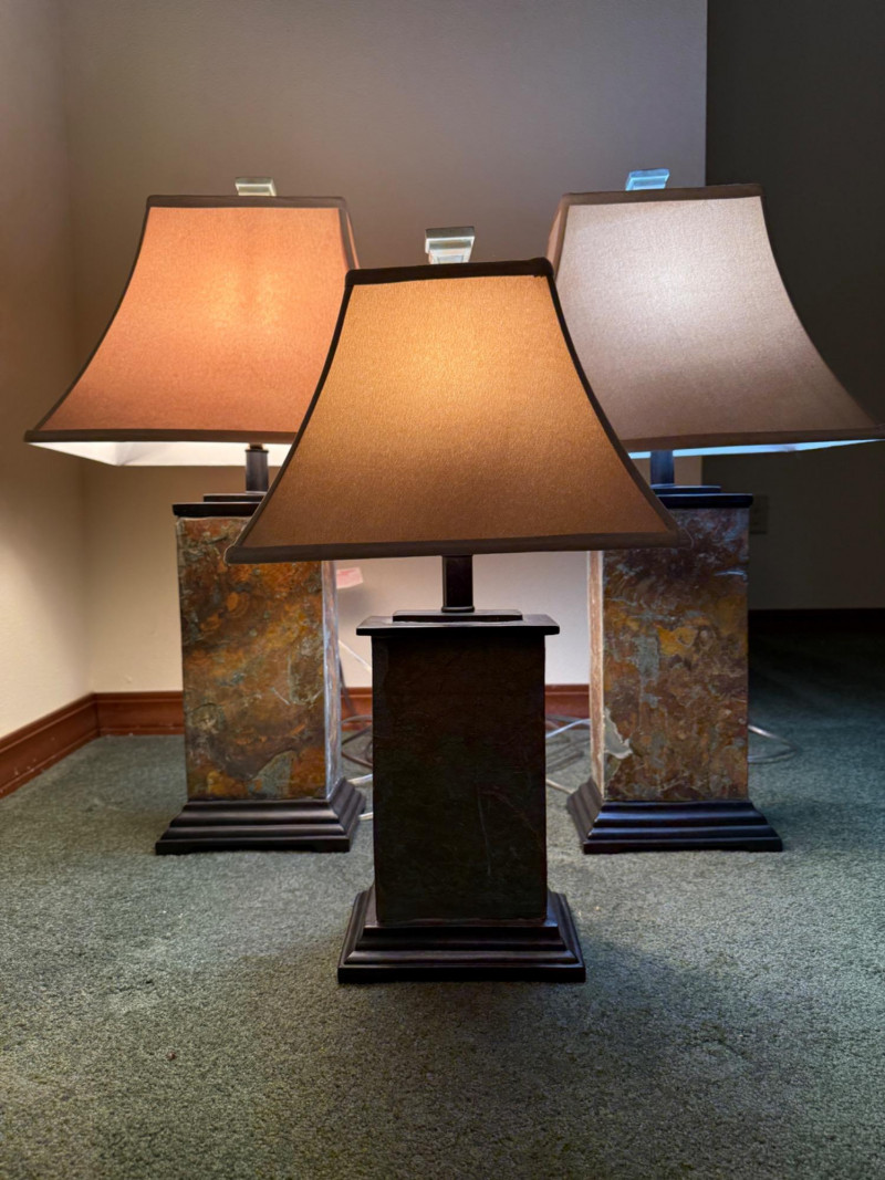 Set of 3 Slate Lamps Matching lamps and shades. Showing what different bulbs will look like. Small lamps is 7.5”x5.25” base, 24.5” tall and 13”x9” shade.
