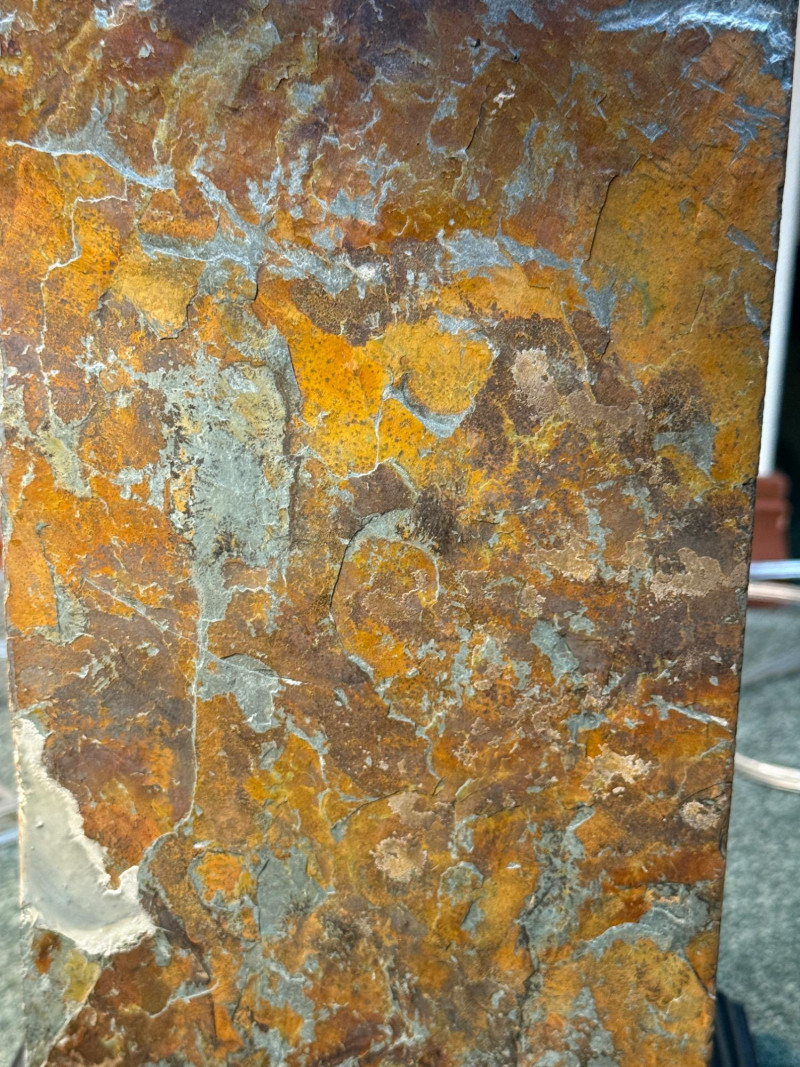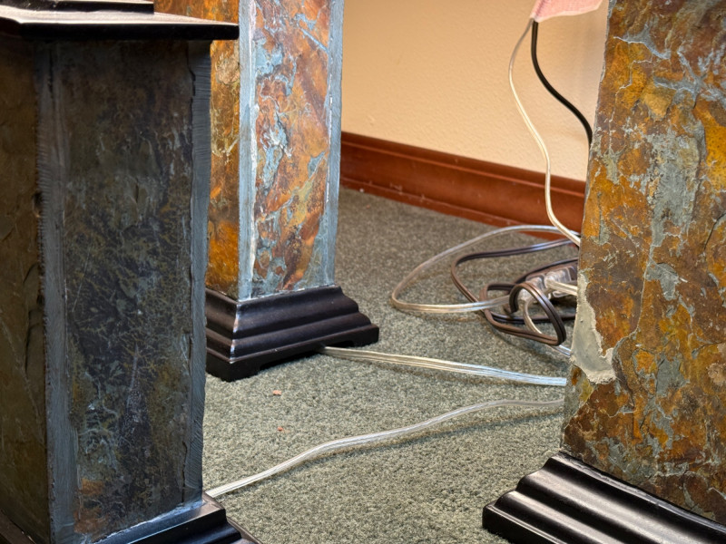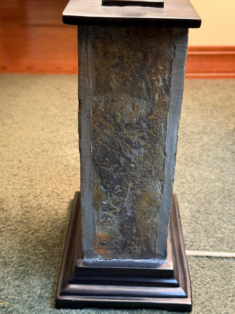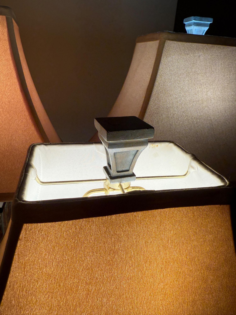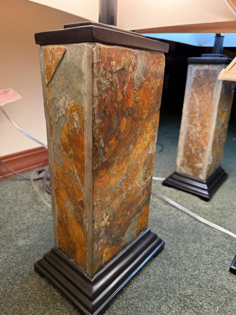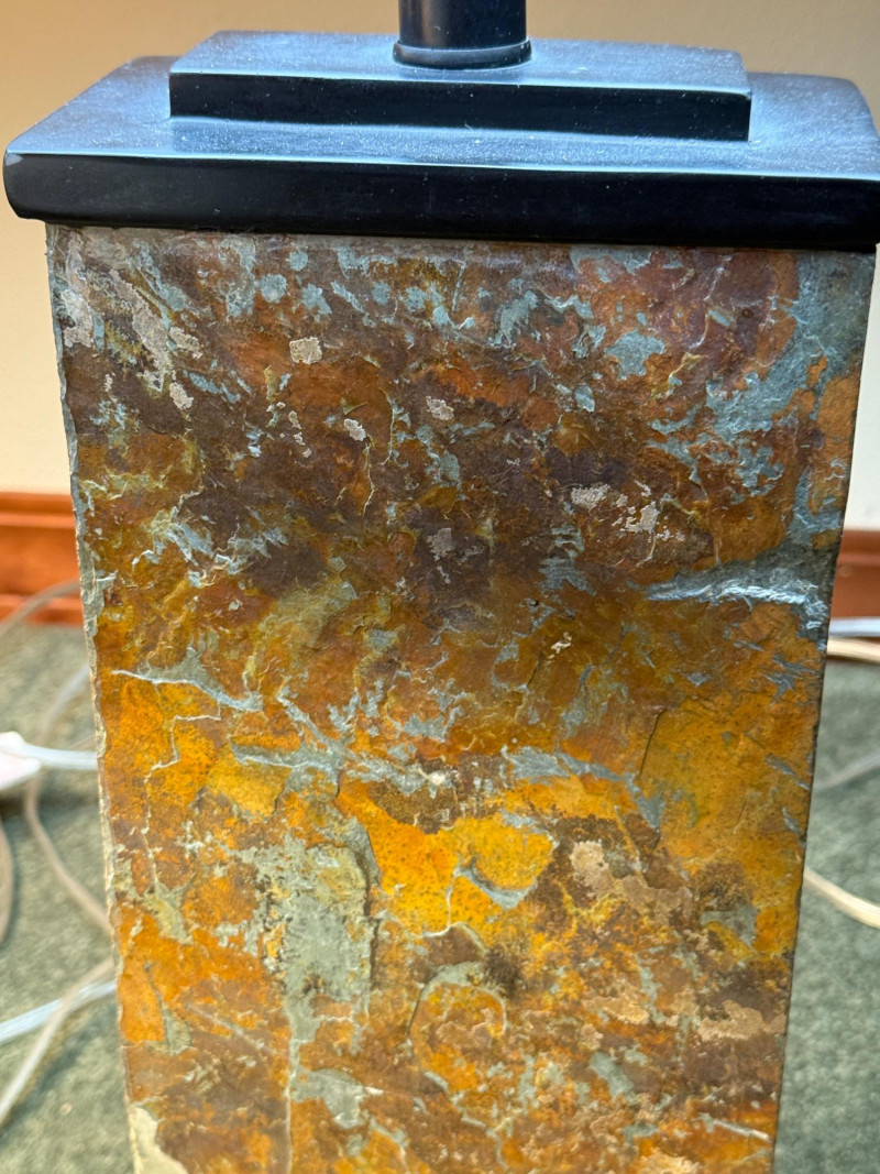 Set of 3 Slate Lamps Matching lamps and shades. Showing what different bulbs will look like. Small lamps is 7.5”x5.25” base, 24.5” tall and 13”x9” shade.