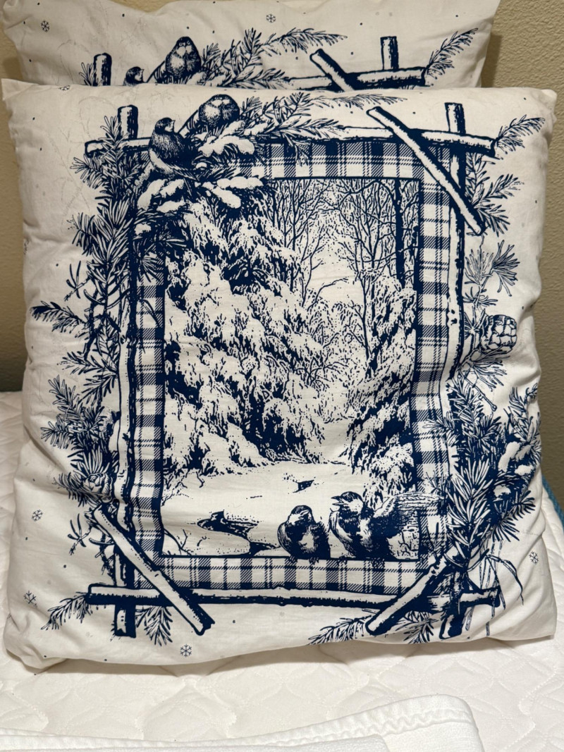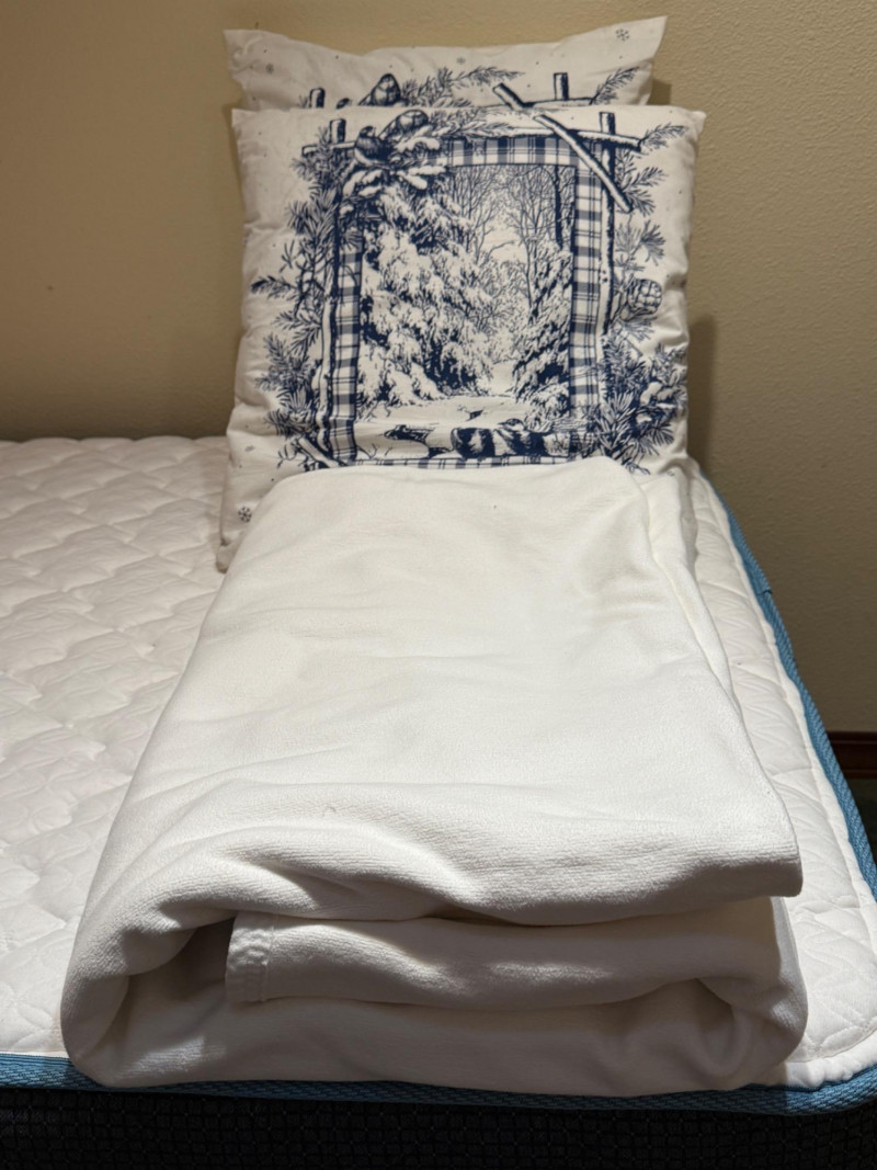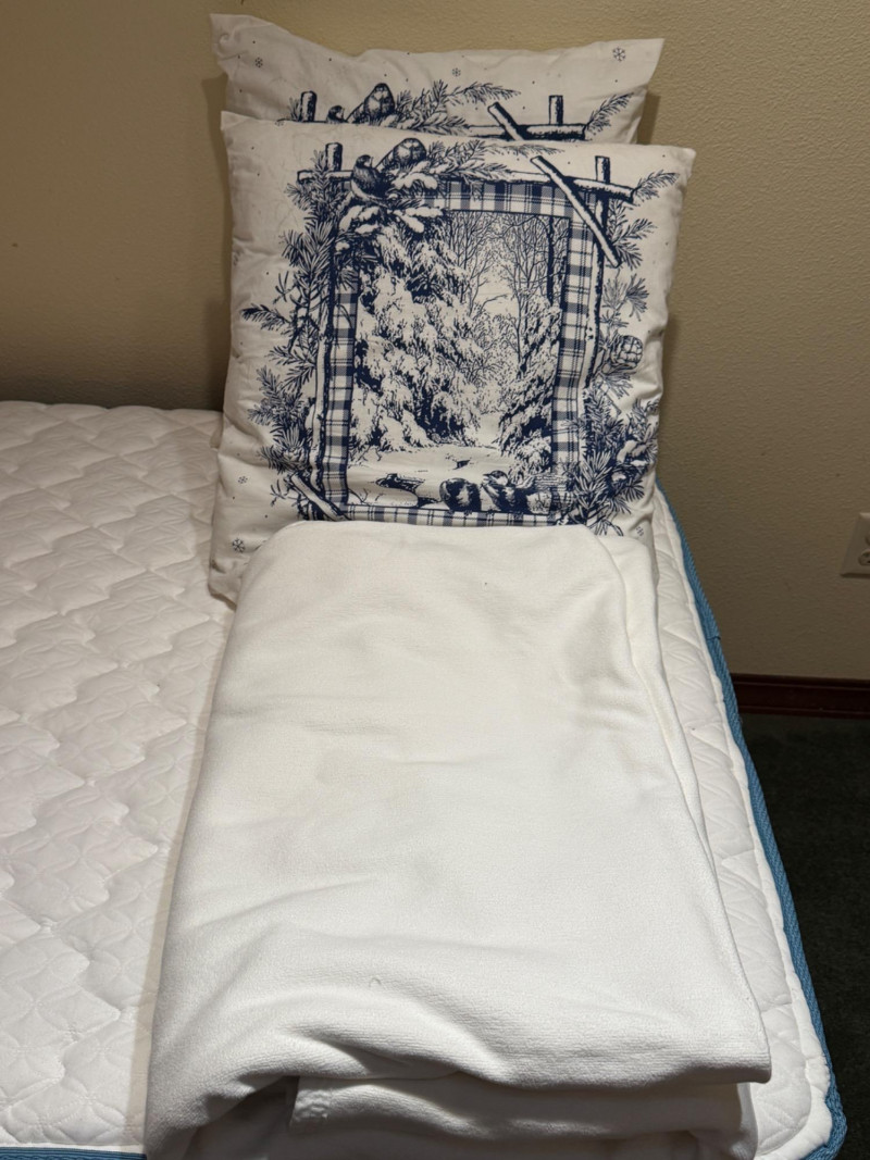 86”x90” White Heavy Flannel type Egyptian cotton blanket and (2) 18”x18” Wintery Pillows.