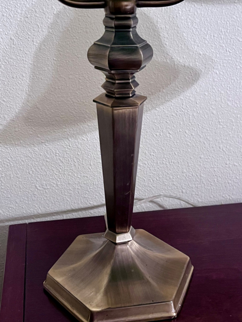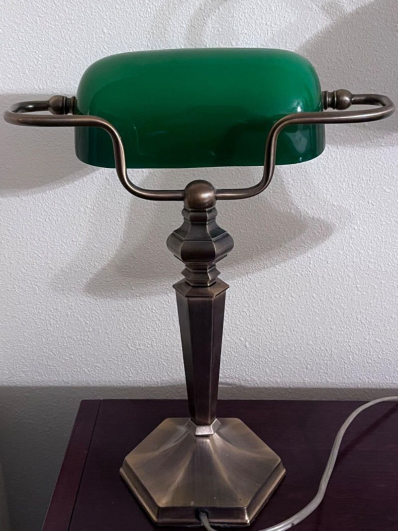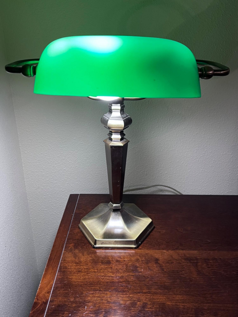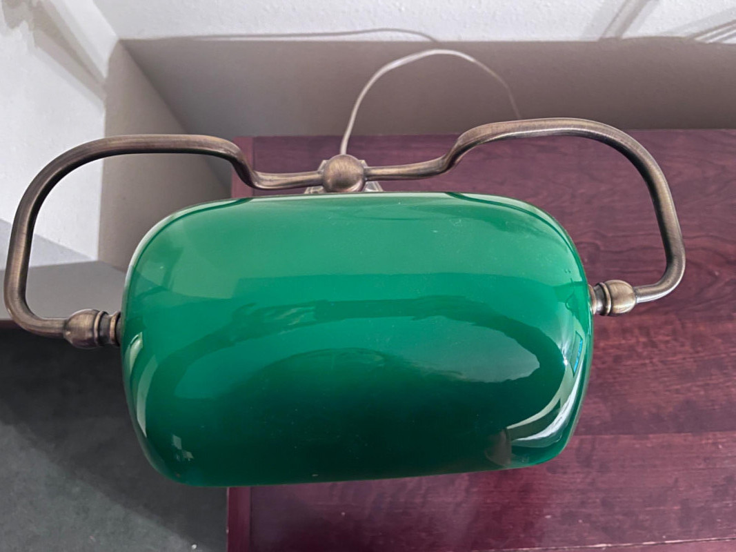 Banker’s lamp has a metal brushed gold tone base with green glass shade.
