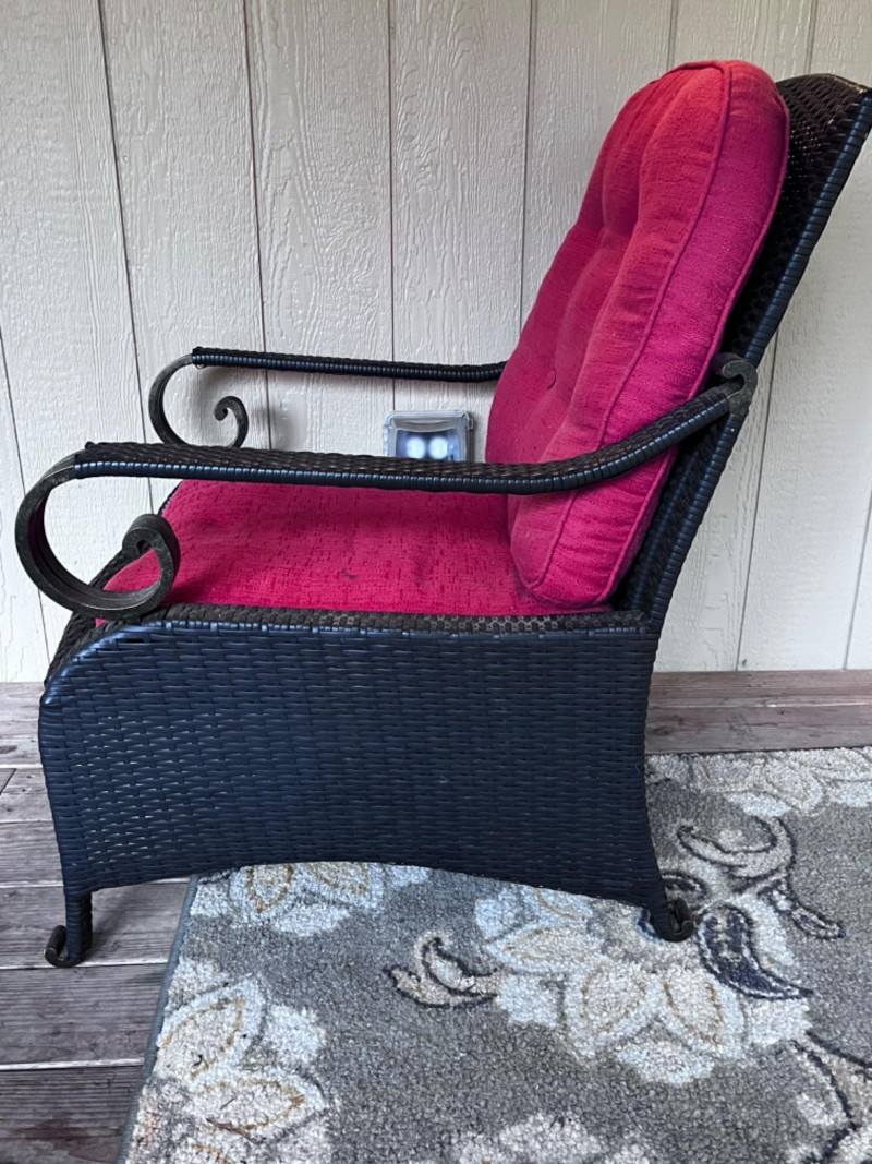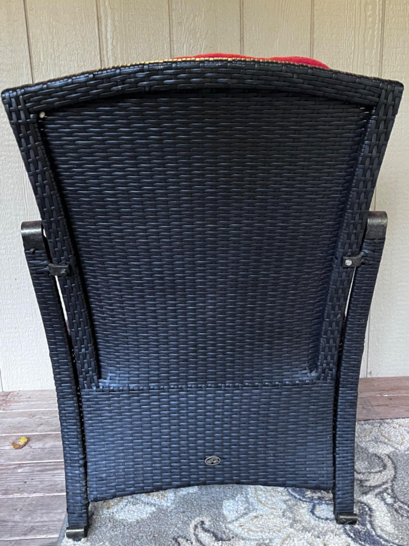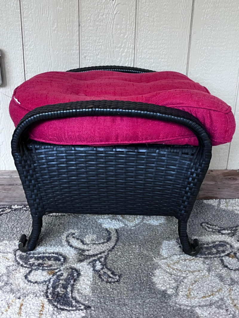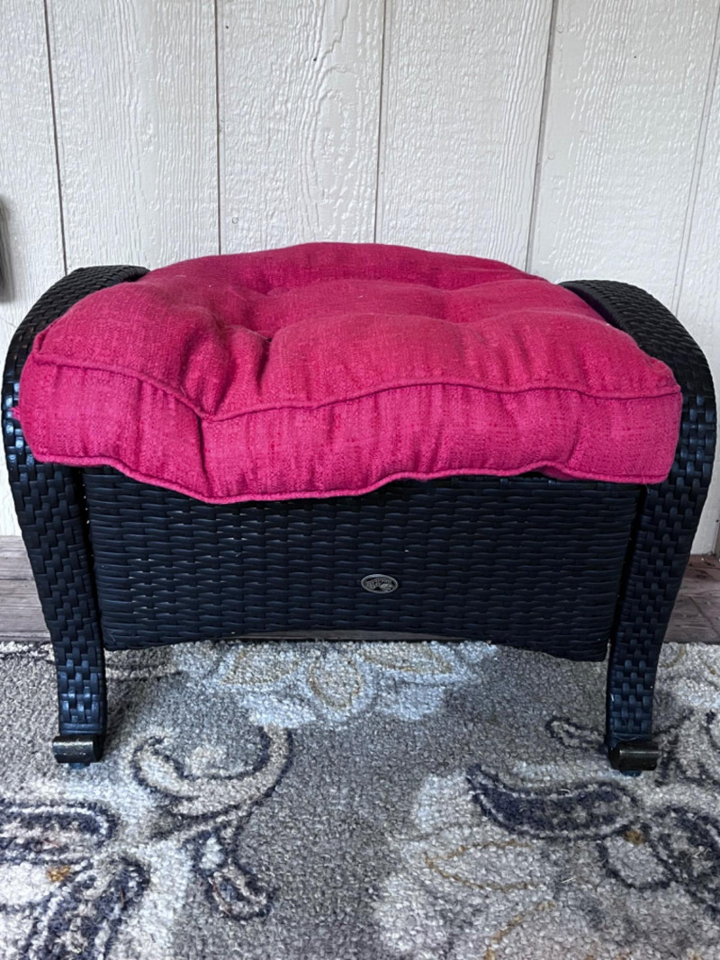 Hampton Bay Black Wicker Patio Chair & Ottoman Black wicker chair with red seat and back cushion. Chair height is 13.5”. Ottoman is 24”x19”x17”.