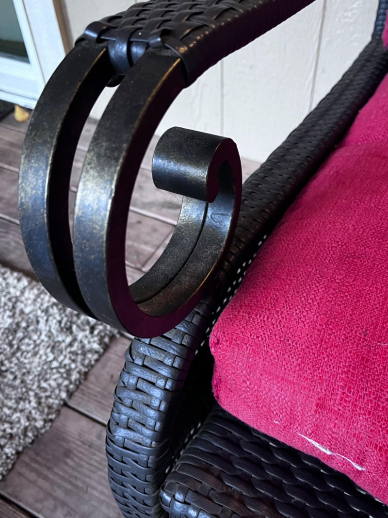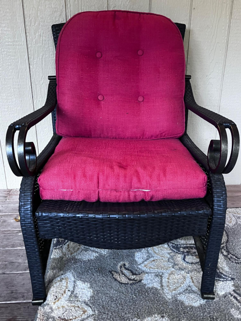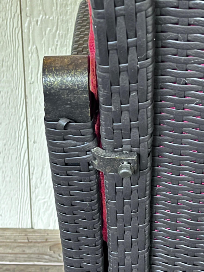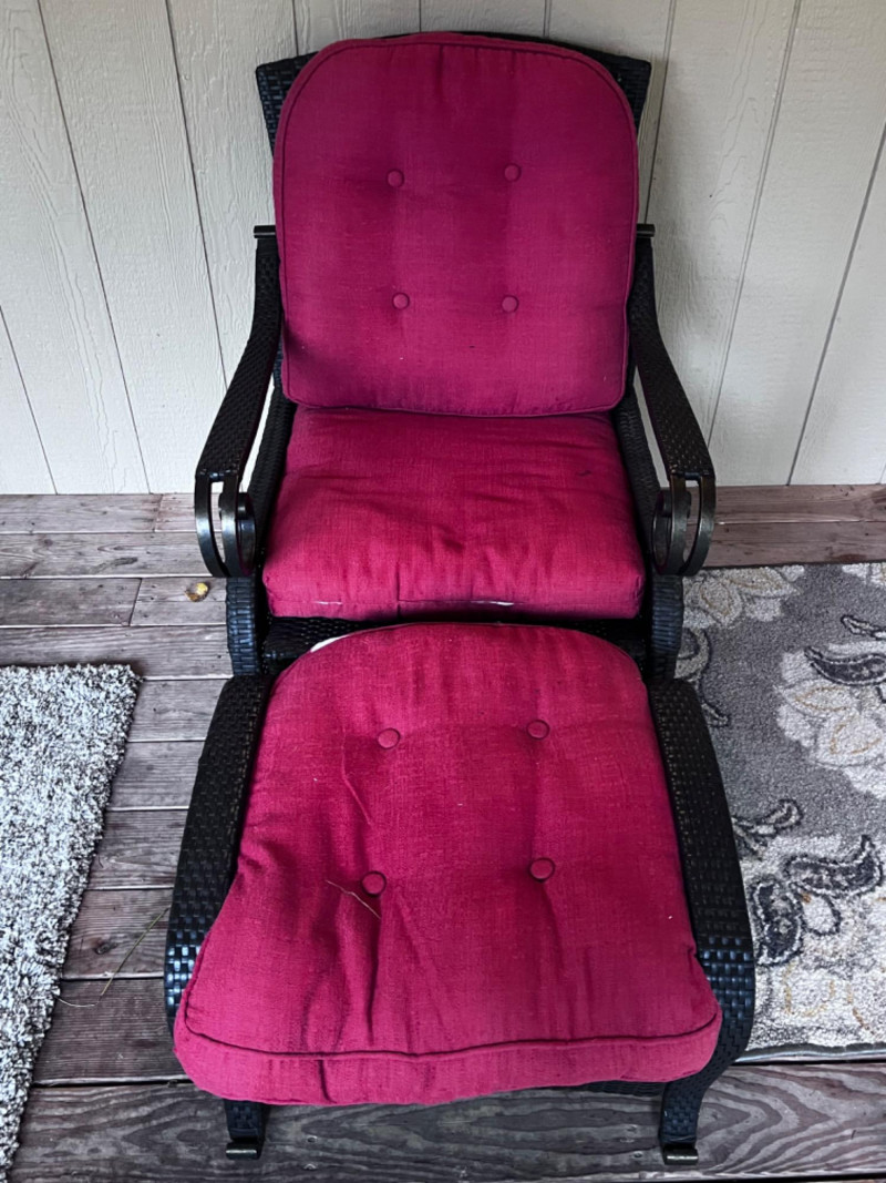 Hampton Bay Black Wicker Patio Chair & Ottoman Black wicker chair with red seat and back cushion. Chair height is 13.5”. Ottoman is 24”x19”x17”.