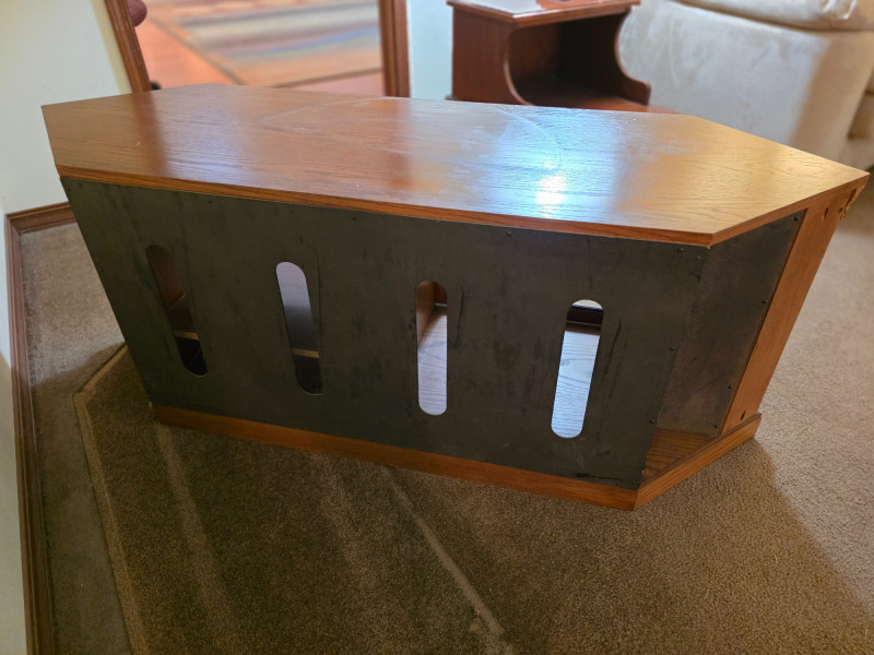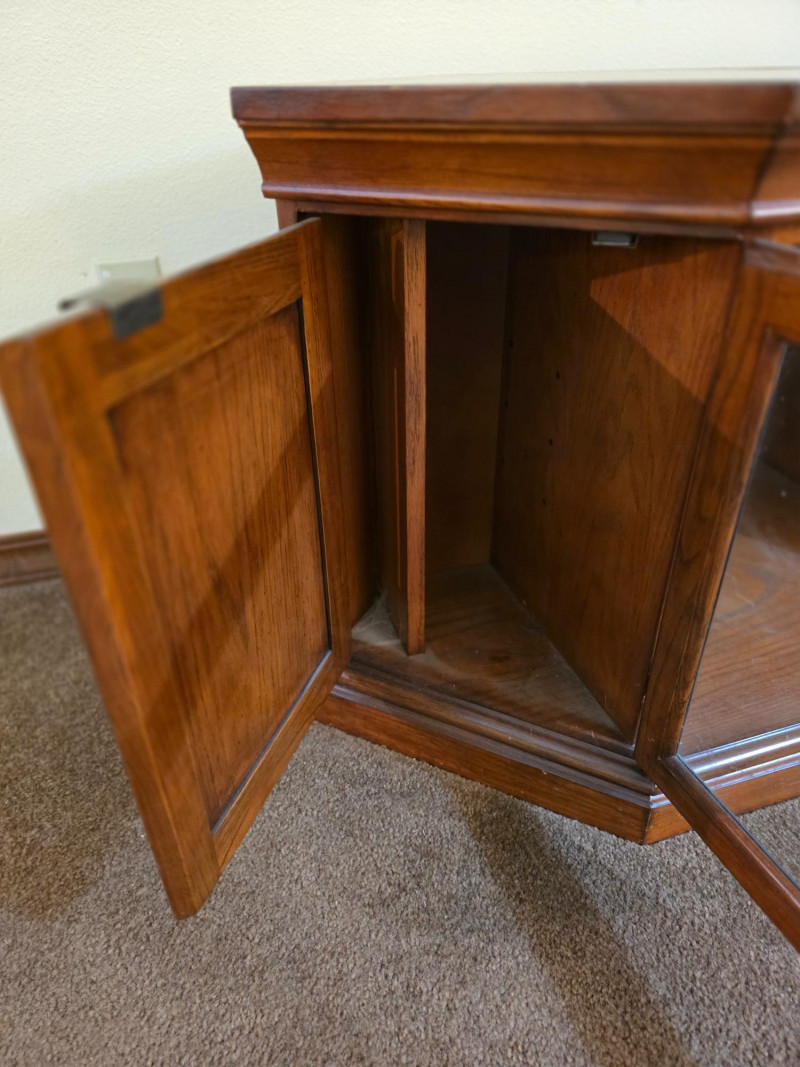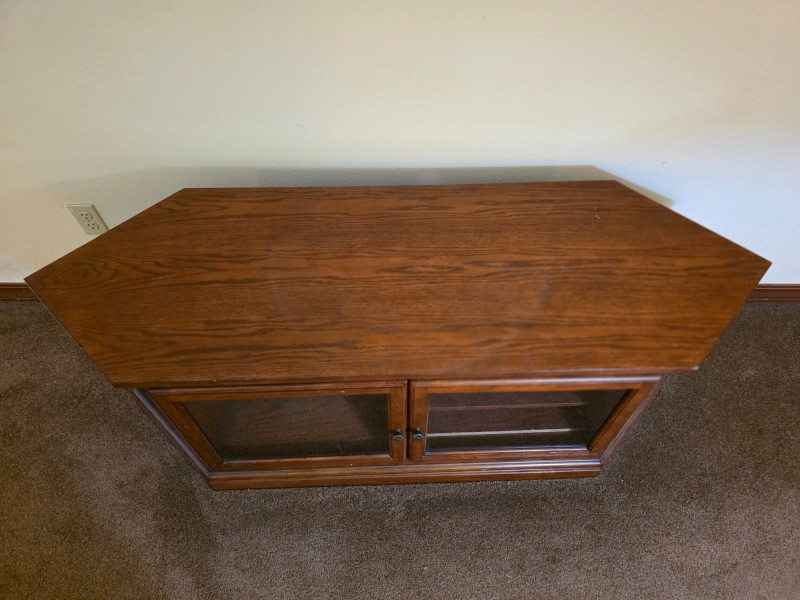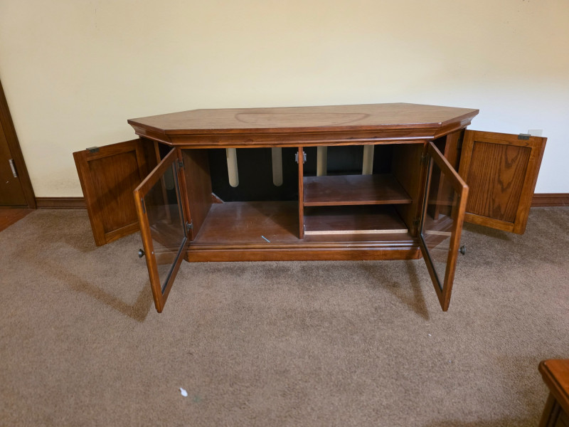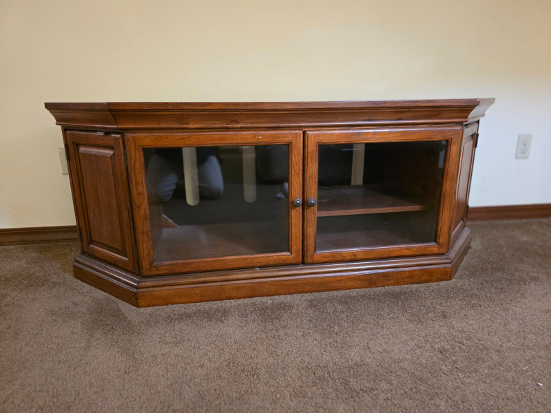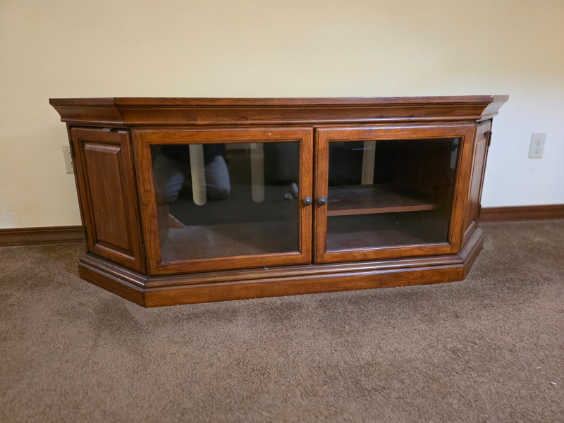 Media Cabinet With Glass Doors & Side Storage Media cabinet & TV stand is finished in dark stain with dual glass doors and side cabinets Adjustable shelves See pics for condition 22.75"T x 59"W x 19.5"D