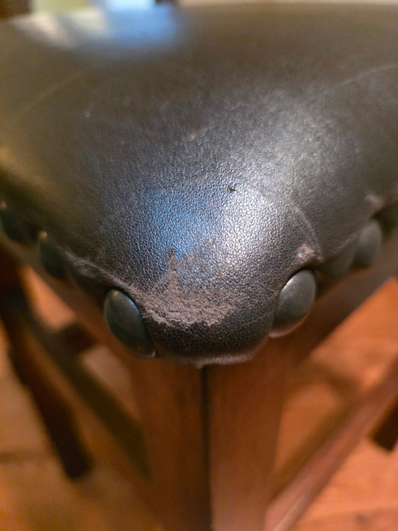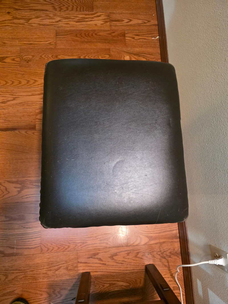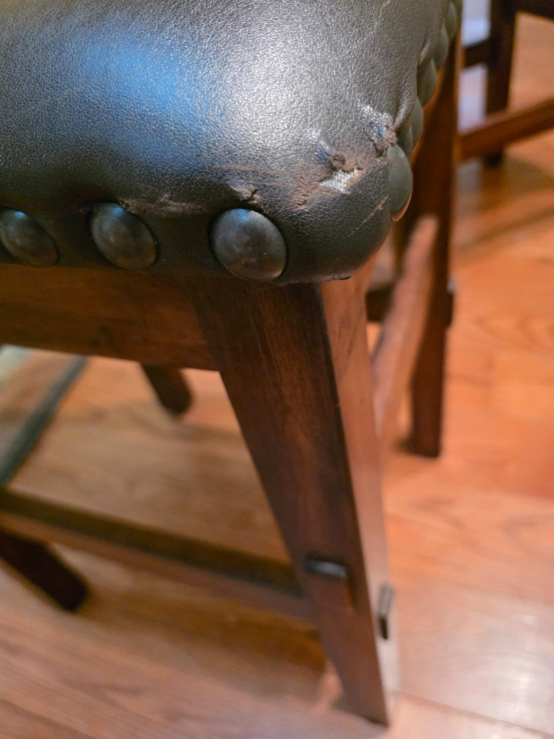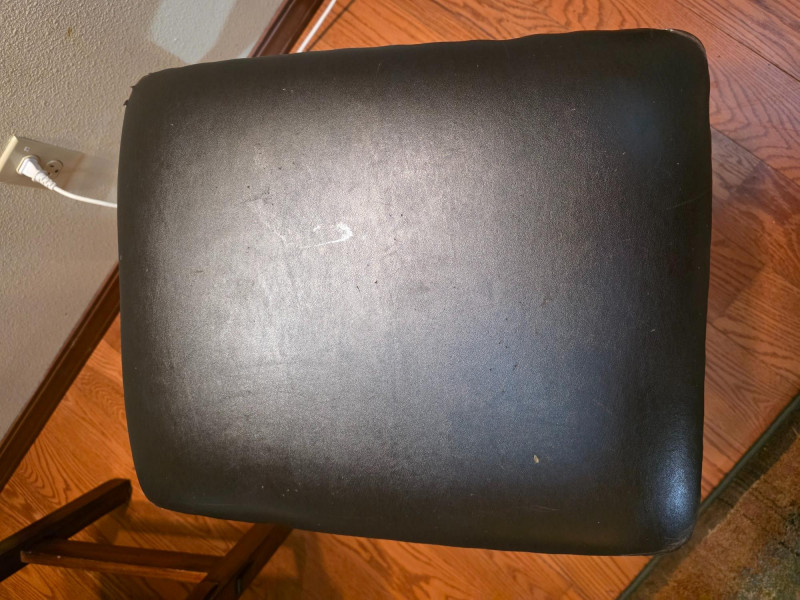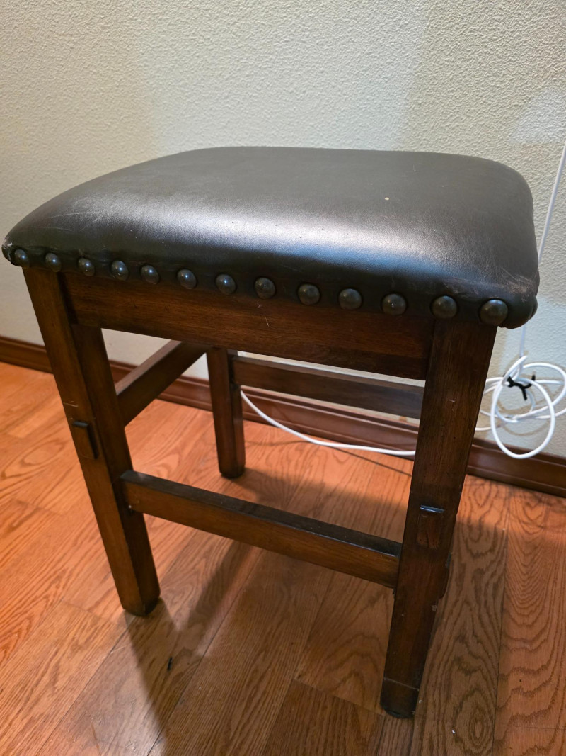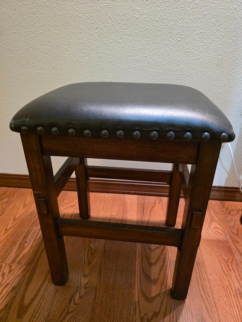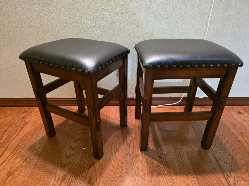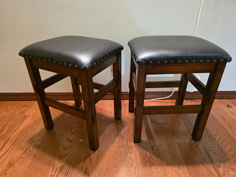 Pair Of Ashley Furniture 24" Wood Barstools With Nailhead Trim 24" backless barstool in a tobacco leaf finish on distressed wood frame and a black vinyl/faux leather upholstered cushion seat with nailhead trim See pics for condition 24"T x 18.5"W x 15.5"D