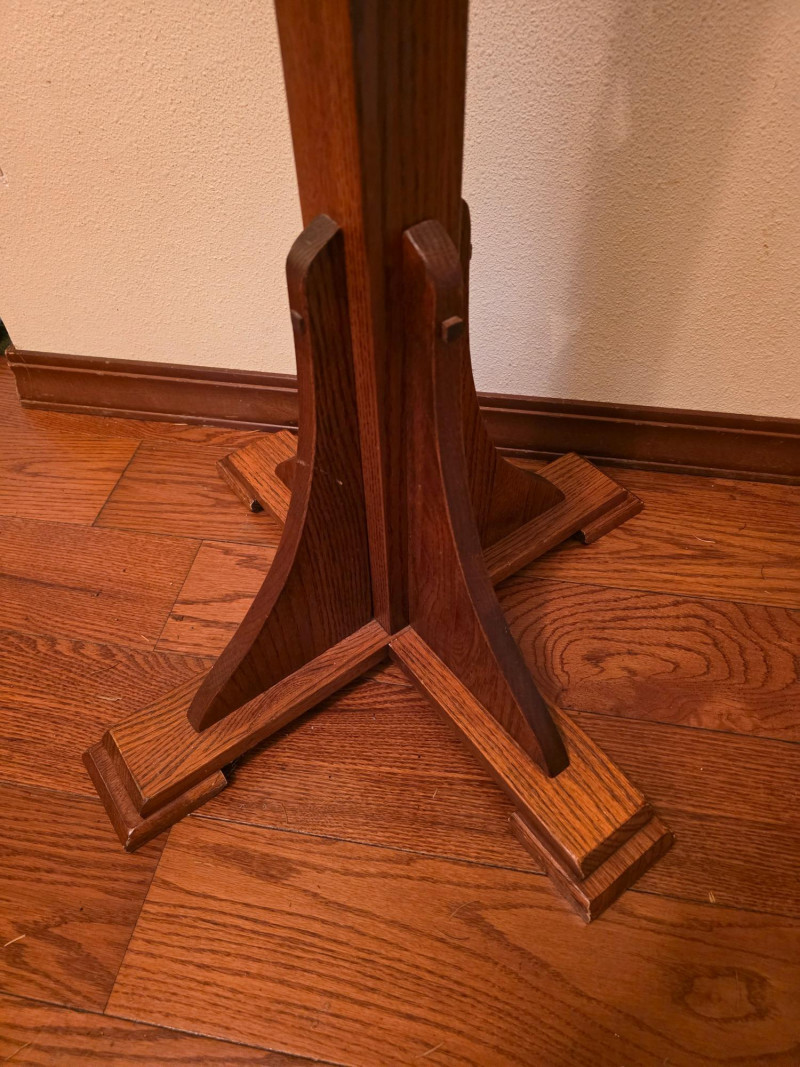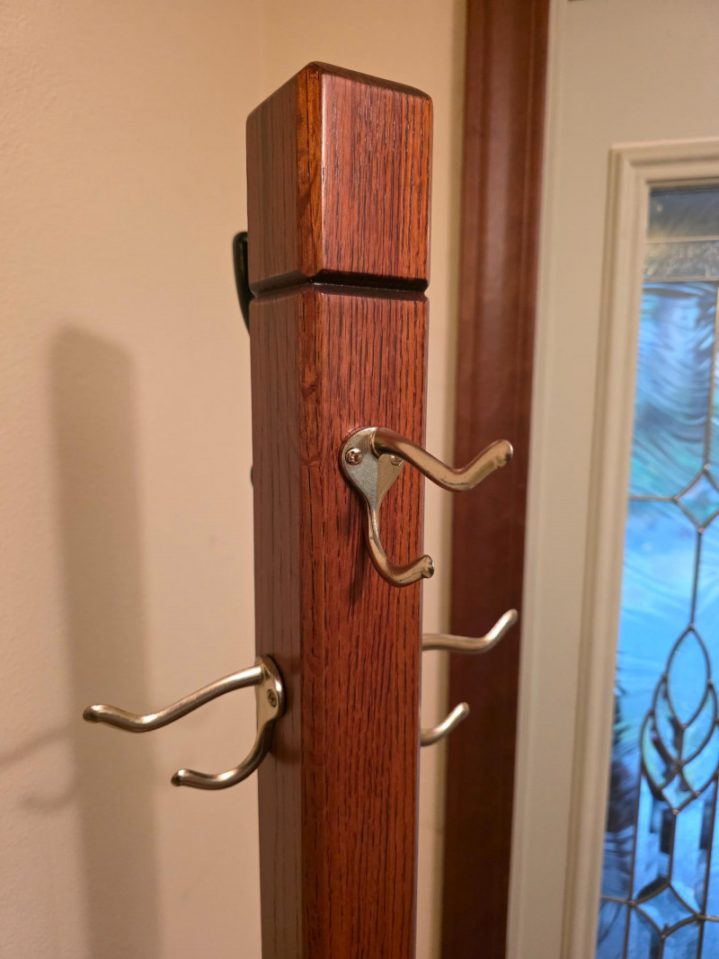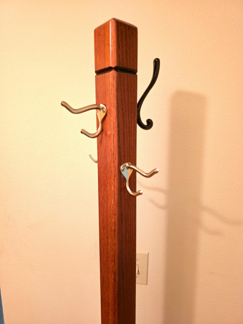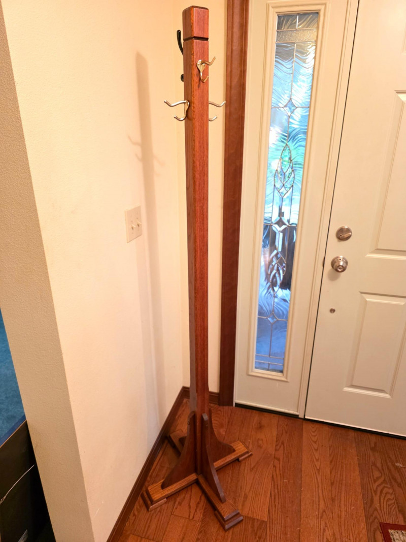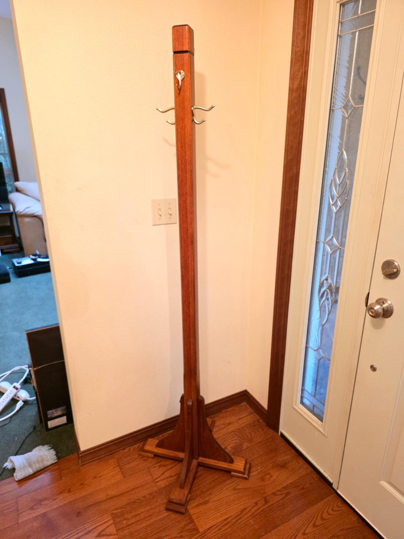 Mission Style Solid Wood Coat Rack Mission style wooden coat rack, also referred to as a hat stand, costumer, or hall tree. The specific design is very characteristic of pieces from the Arts and Crafts movement design The base is an "X" or cross-frame design for stability One of the 4 hooks is Mismatched 70"T x 21"W (at base)