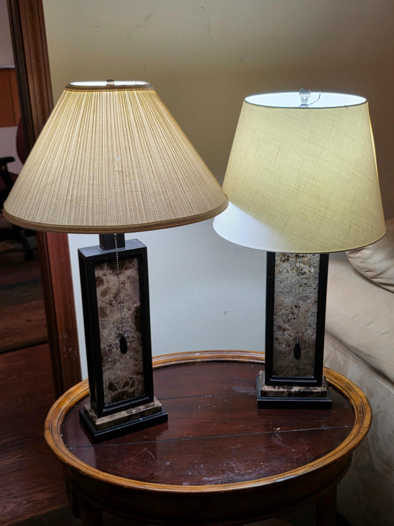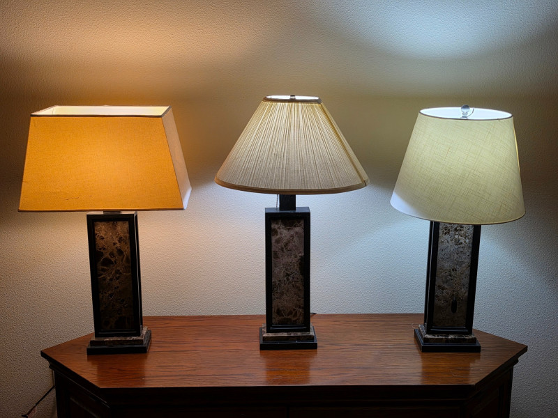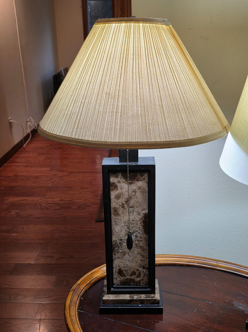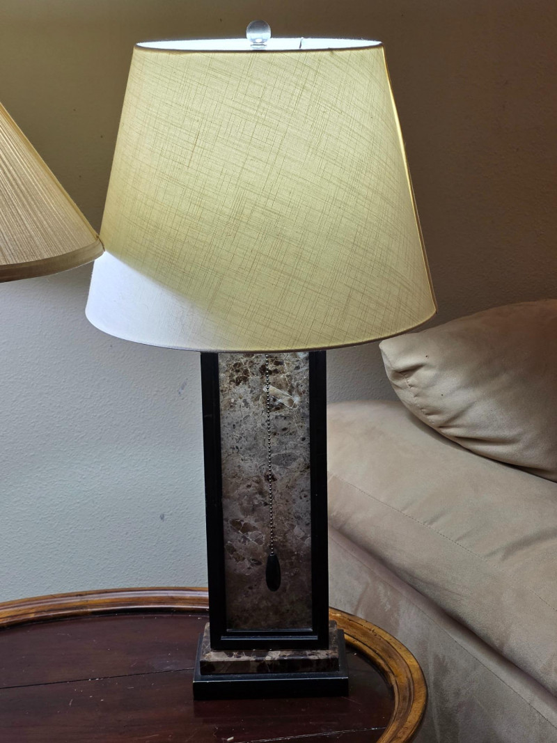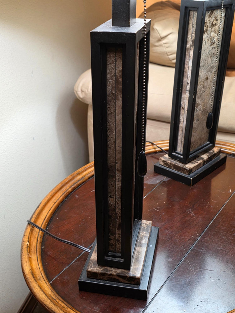 (3) Black Aluminum Table Lamps With Granite Inserts & Base Nice set of tall rectangular pull-chain table lamps with mismatched round shades Both Tested - Both Work! 29"T x 7"W x 5"D (at base)