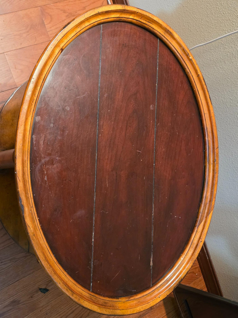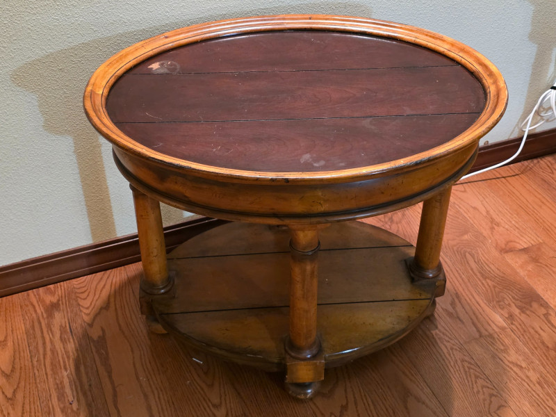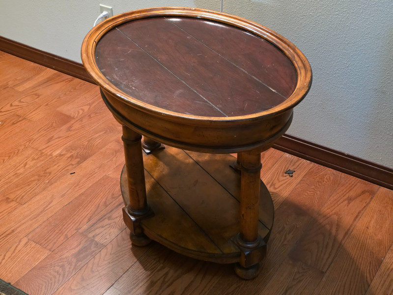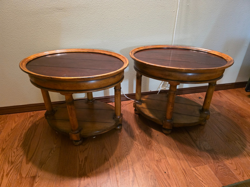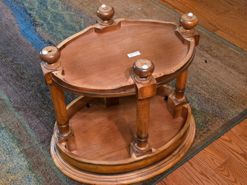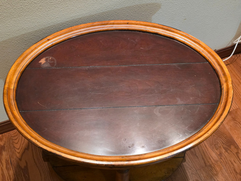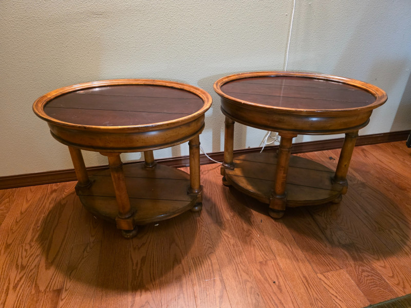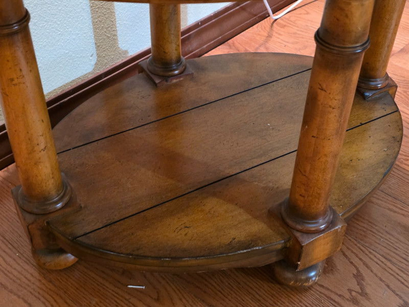Pair Of Ashley Furniture Oval Wood Accent Tables With Shelf Dark finish wood slats on top with a medium lip detail on 4 column legs with ball feet. Both have a medium finish slat wood lower shelf See pics for condition 24.5"T x 30"W x 23"D