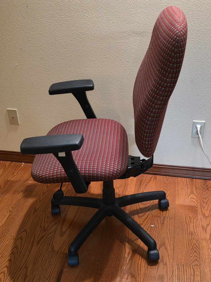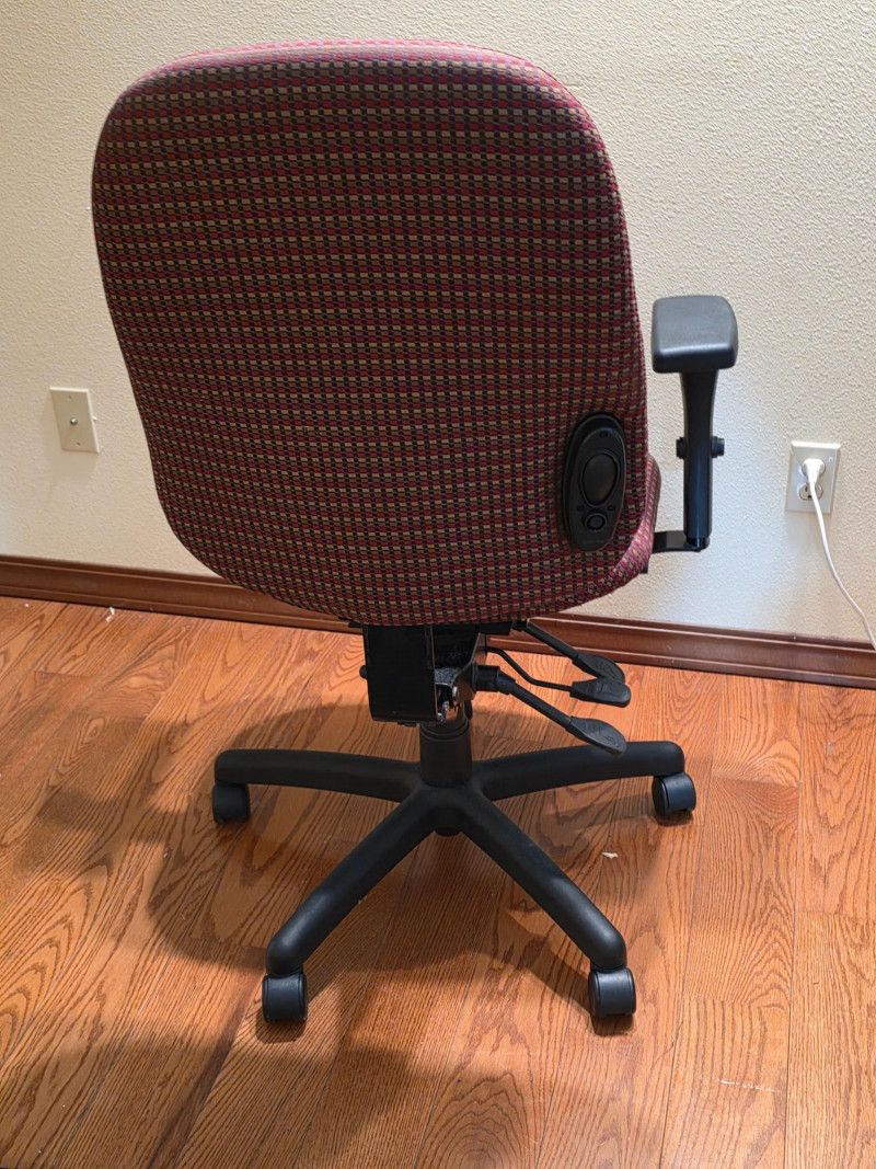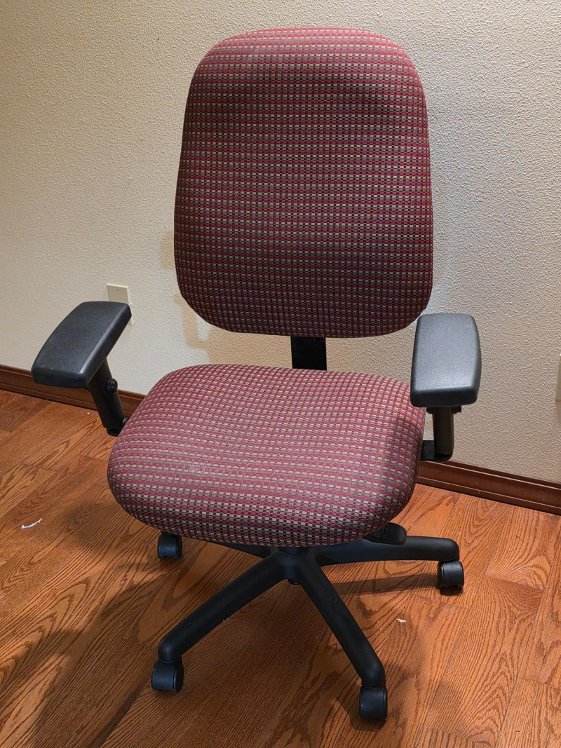 Creative Office Ergonomics Chair With Twilight Angora Fabric Features a thick foam padded seat and backrest with built-in inflatable lumbar support. Includes fully adjustable controls, armrests and 360° swivel. Equipped with a heavy-duty nylon base and dual-wheel carpet casters. In good condition! 43"T x 28"W x 24"D