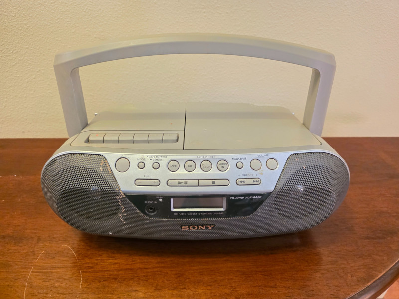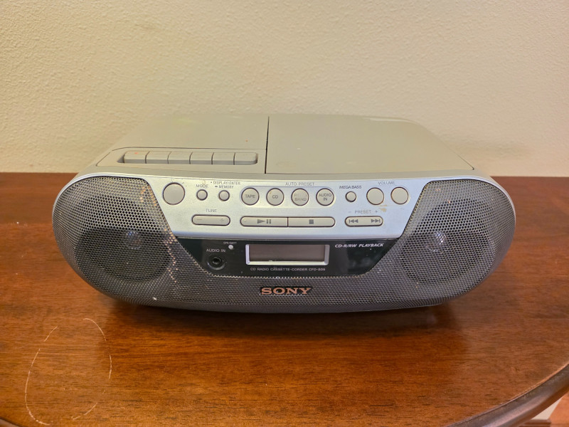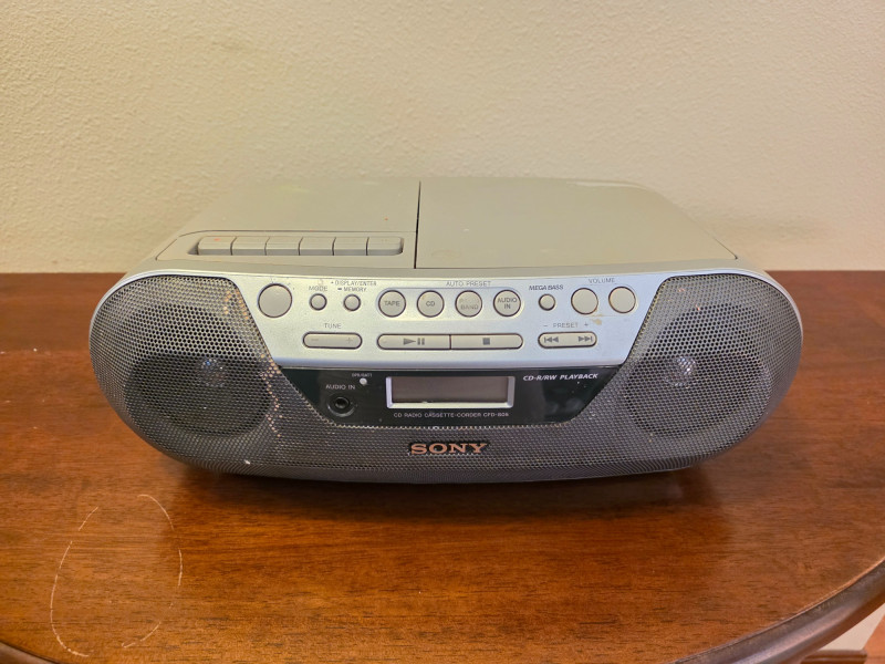 Sony CFD-S05 CD/AM/FM Radio Cassette Recorder It features a built-in cassette tape deck with recording functionality. Includes a flat-loading CD player that supports CD-R/RW playback. It has an AM/FM tuner with 30 digital presets. An auxiliary audio-in jack is available for connecting external devices like MP3 players. The system operates on both AC power and batteries See pics for condition Power cord included Tested - Works! 5"T x 14"W x 9"D