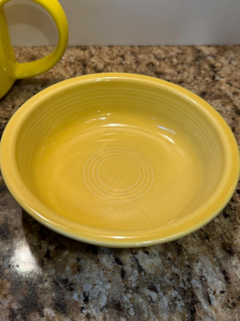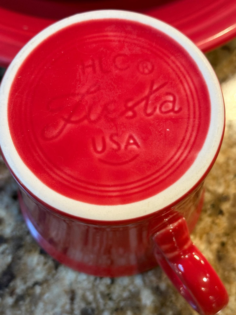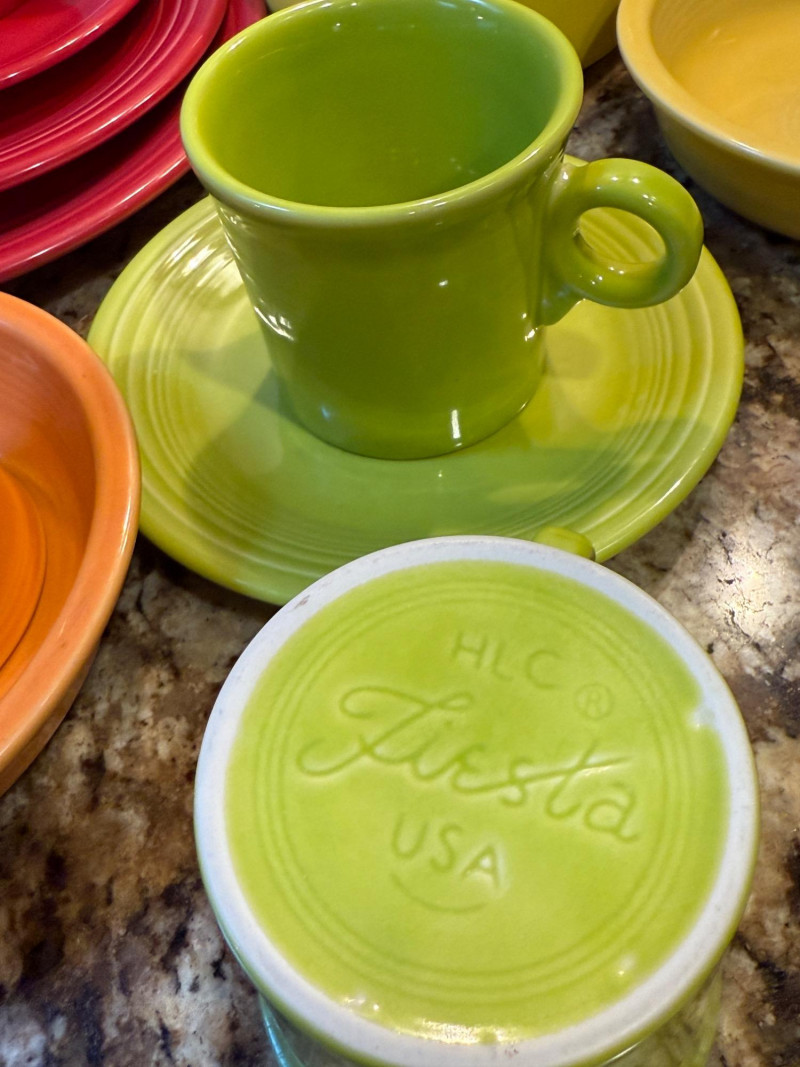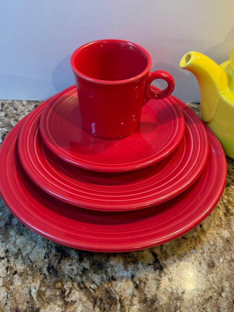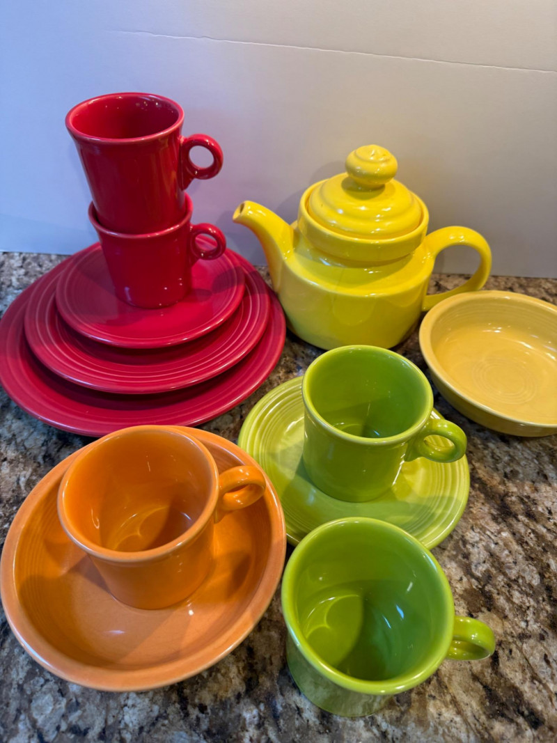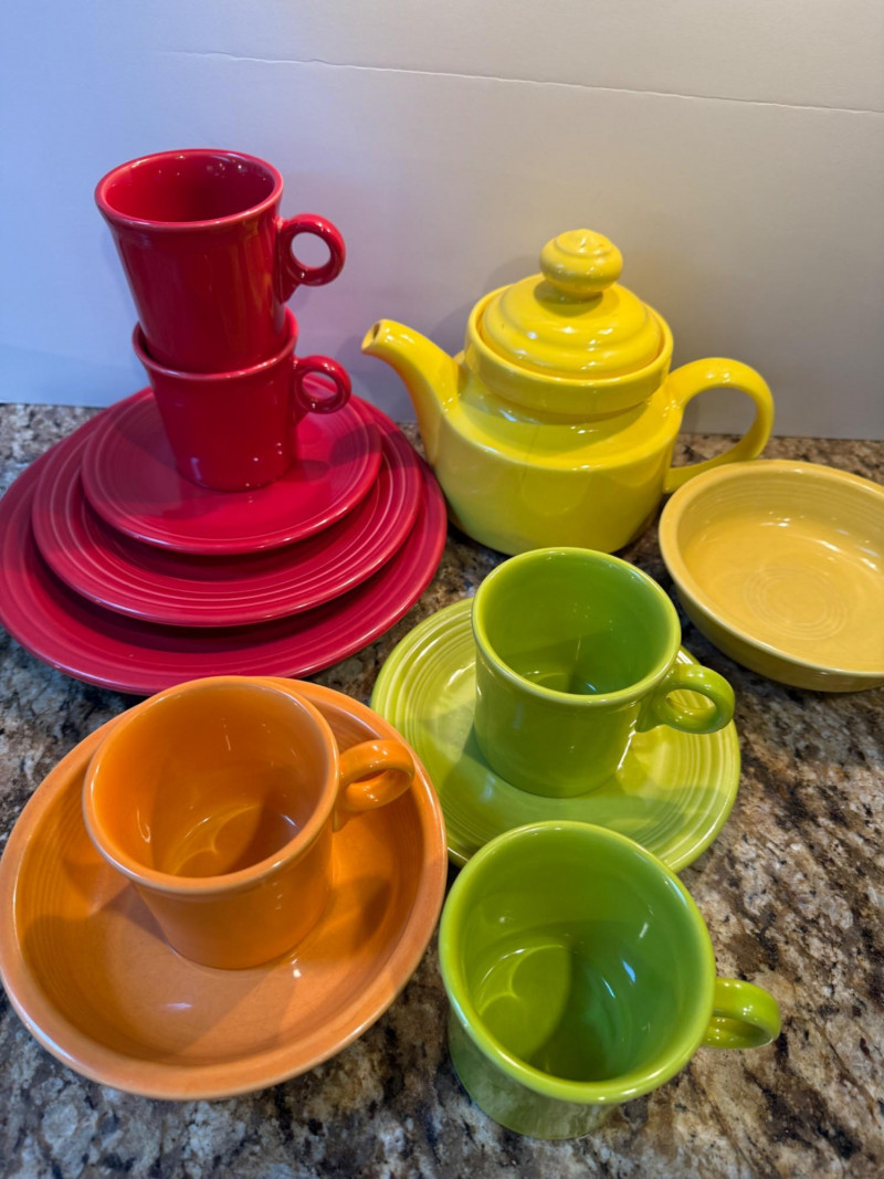 Fiesta Ware Dishes & Spanish Wachterbach Teapot 3 red plates 10.5”,9”,7” 2 red mugs green plate and 2 mugs orange mug and bowl yellow bowl