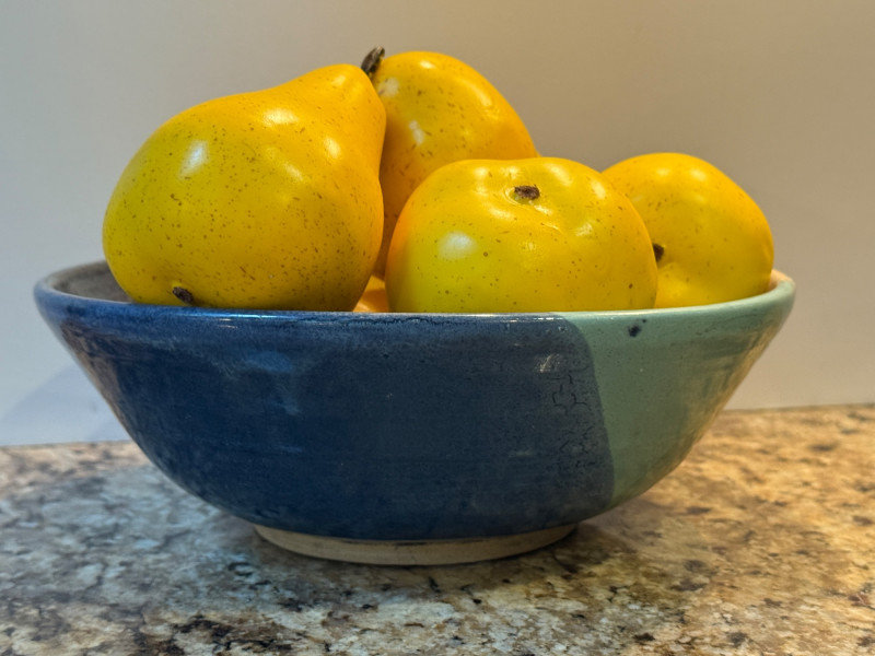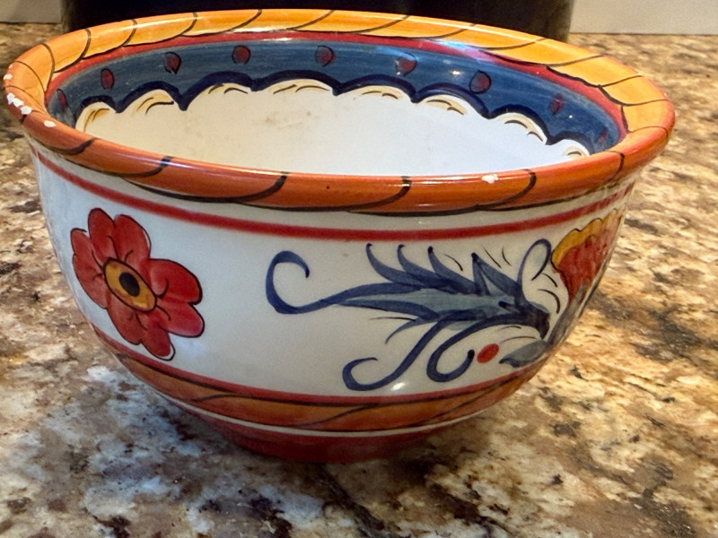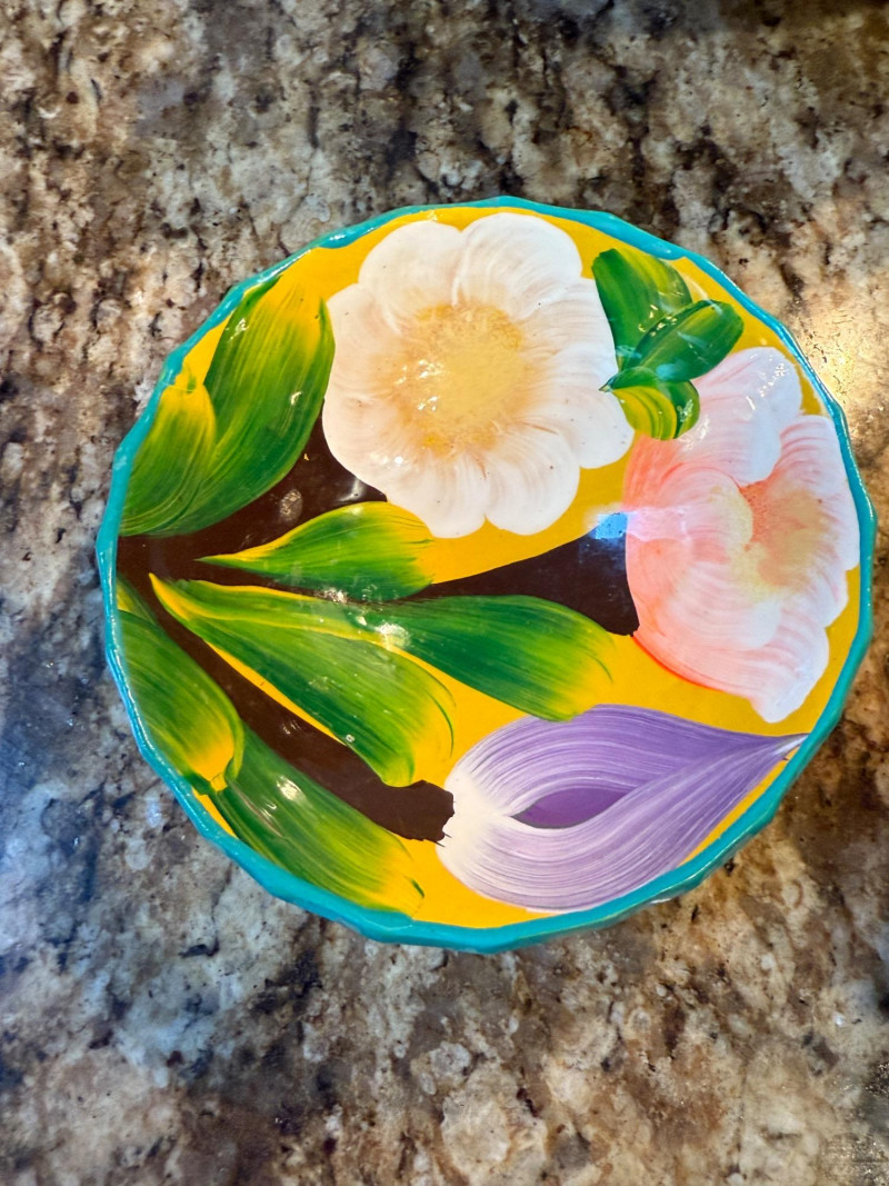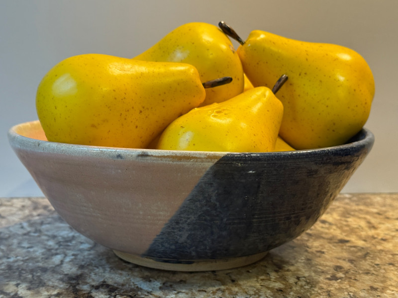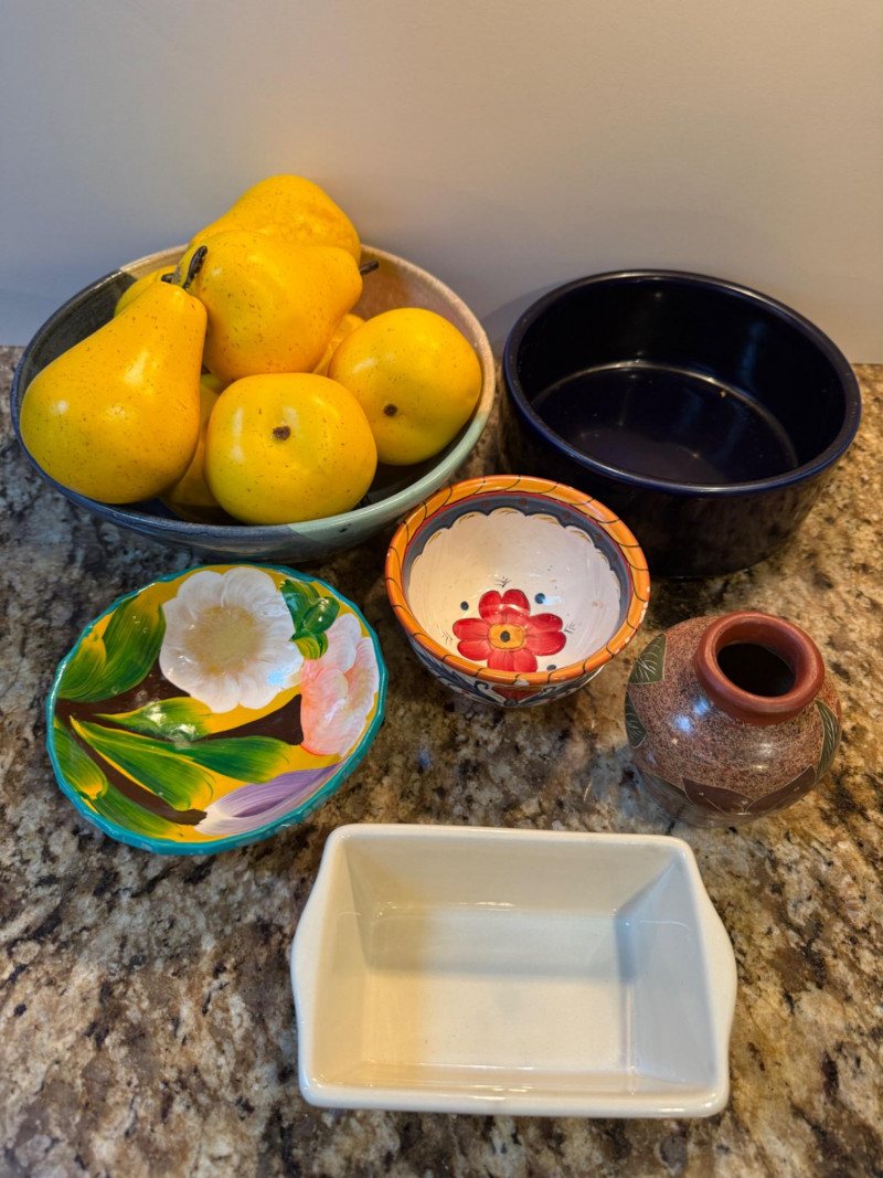 Pottery & Pears 9.5”x3.5” multi-color bowl 8- realistic pears Deep blue stoneware bowl 2 handpainted small bowls bird and leaves bud vase mini loaf stoneware
