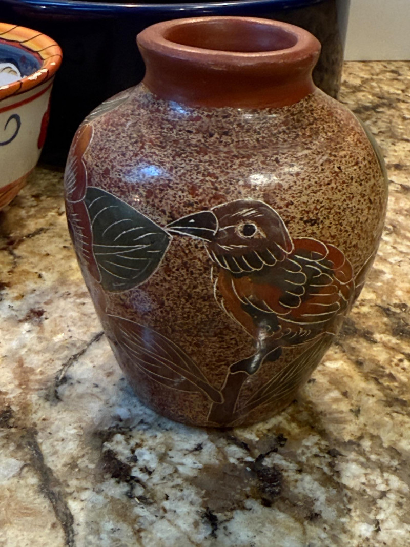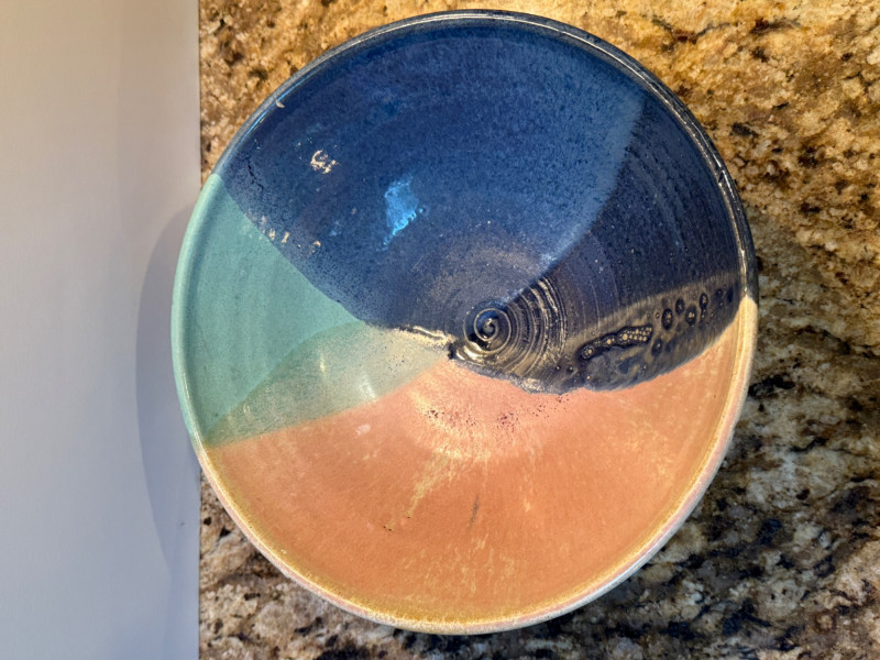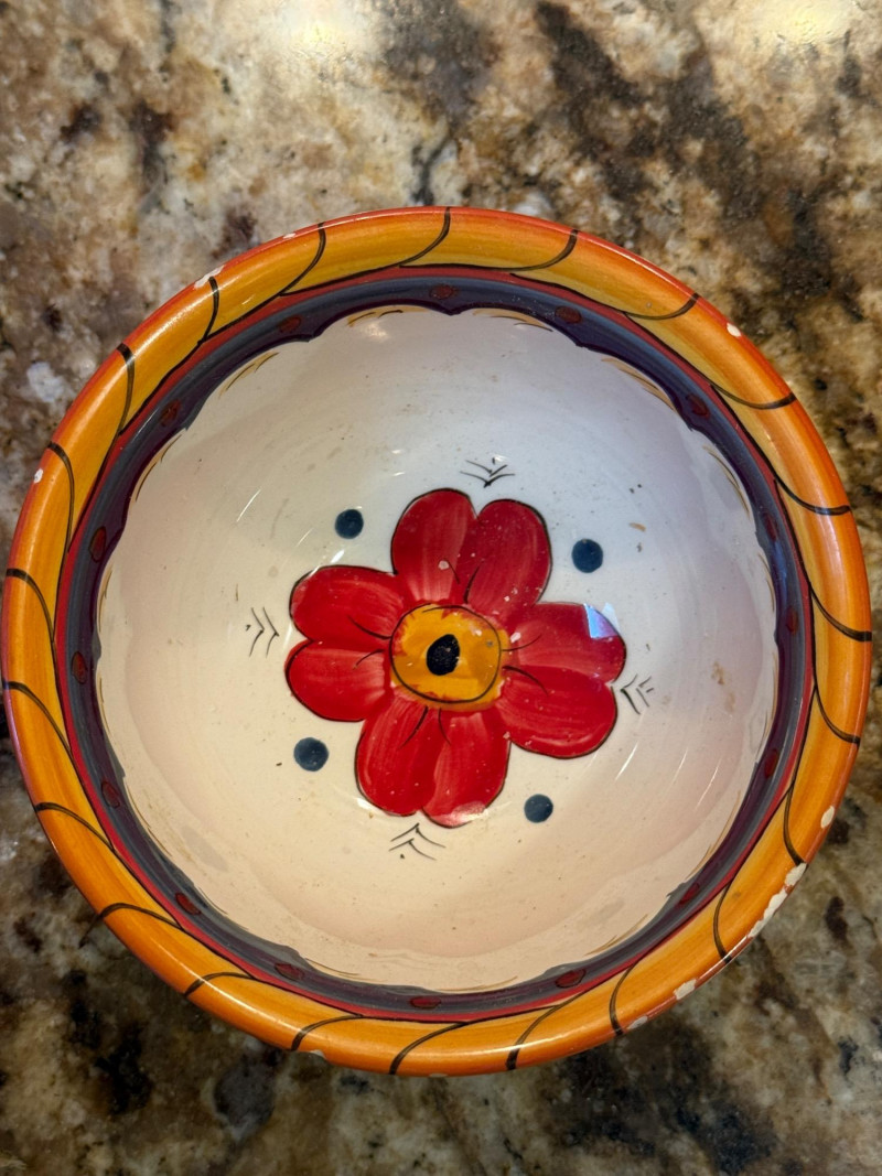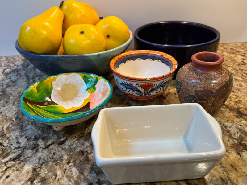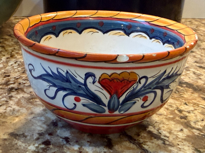 Pottery & Pears 9.5”x3.5” multi-color bowl 8- realistic pears Deep blue stoneware bowl 2 handpainted small bowls bird and leaves bud vase mini loaf stoneware