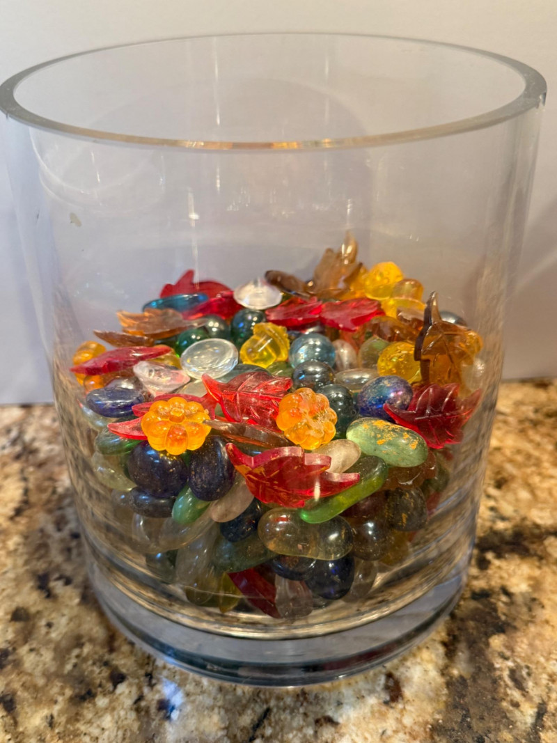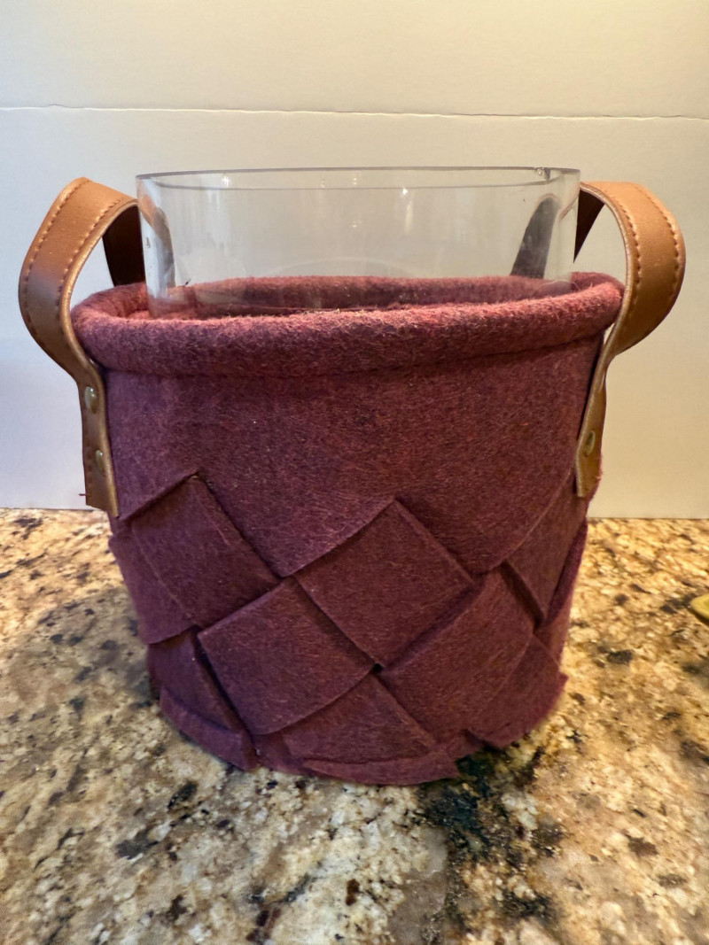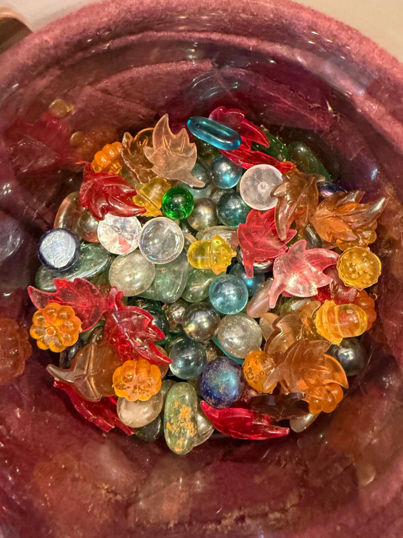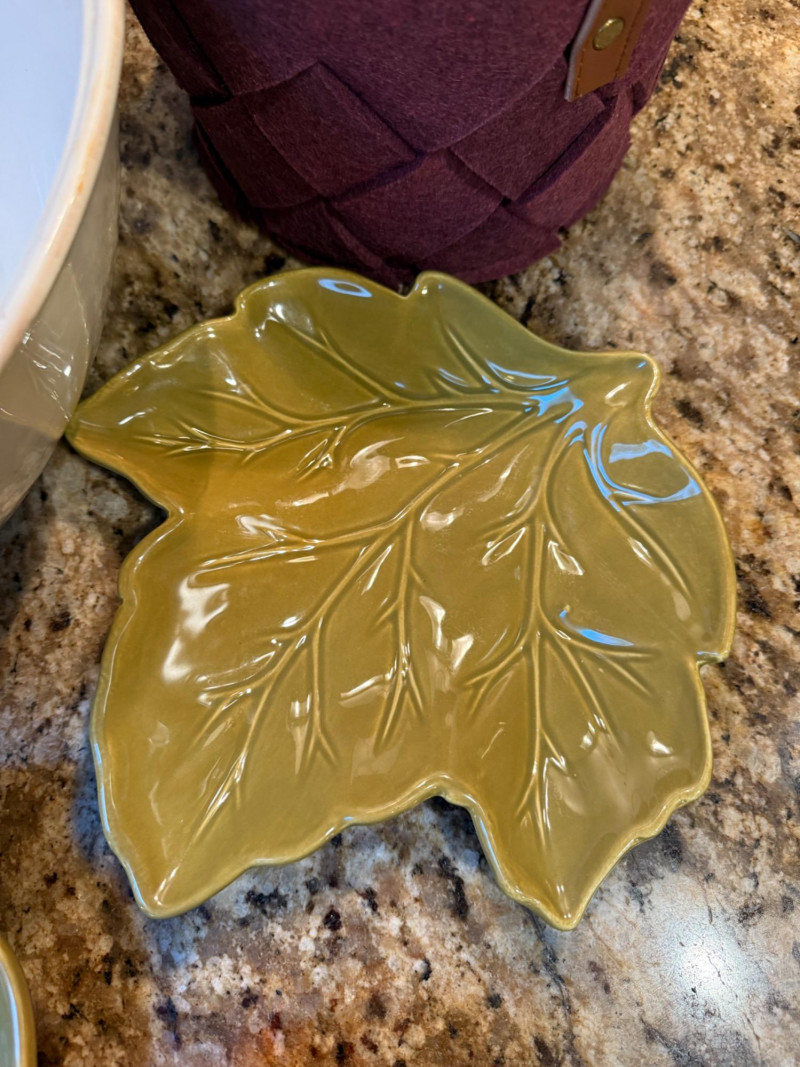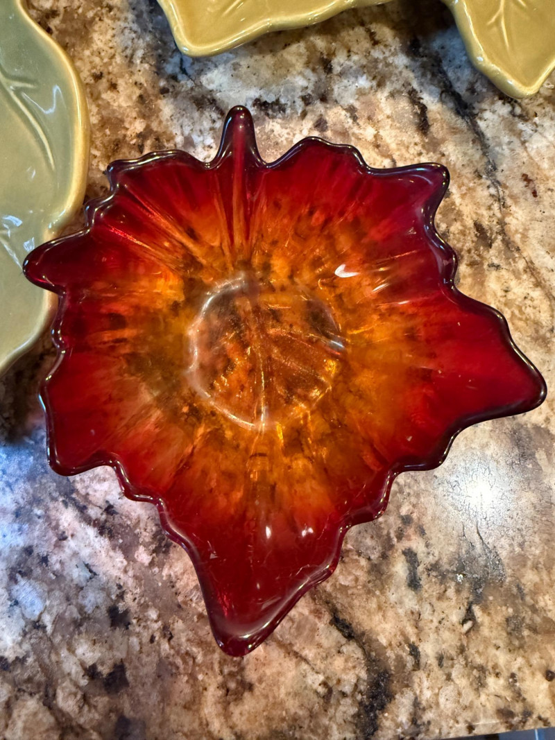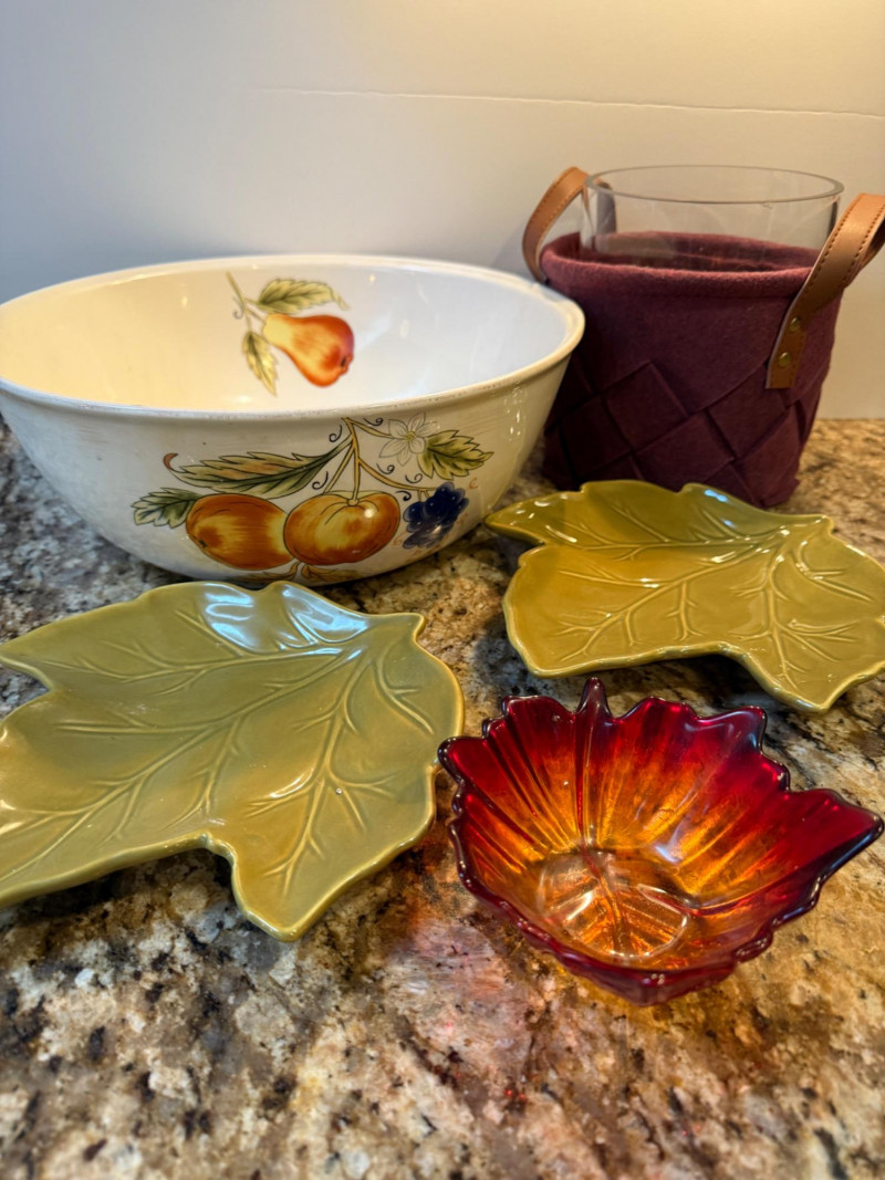 Fall(en) Leaves and Apple Bowl 6”x6.5” clear glass vessel with colorful vase filler 2 Green leaf plates Sunrise leaf bowl Purple felt basket Fruit bowl is 13”x5”