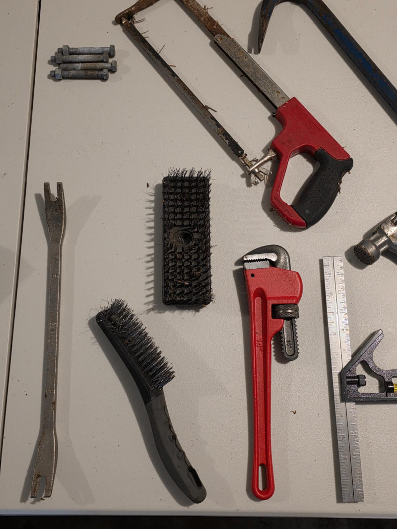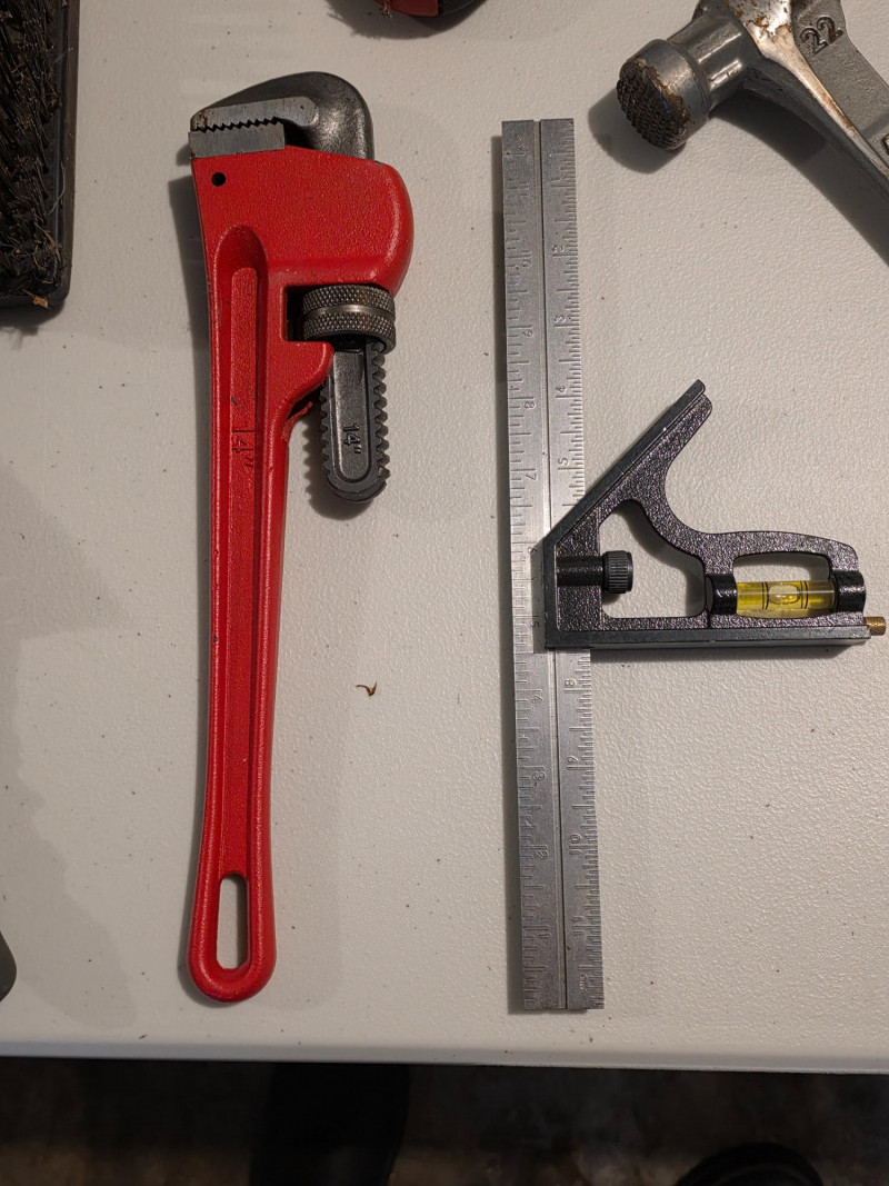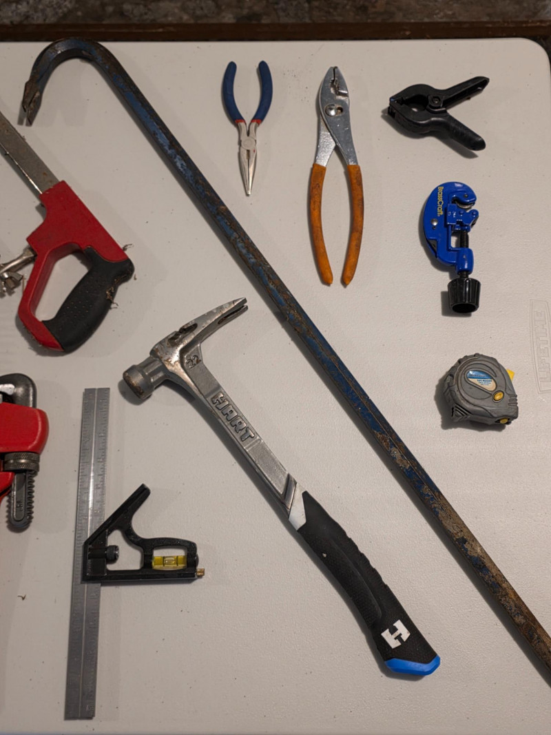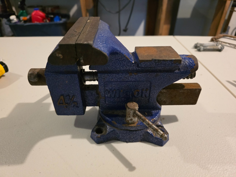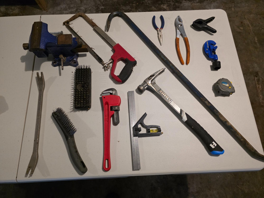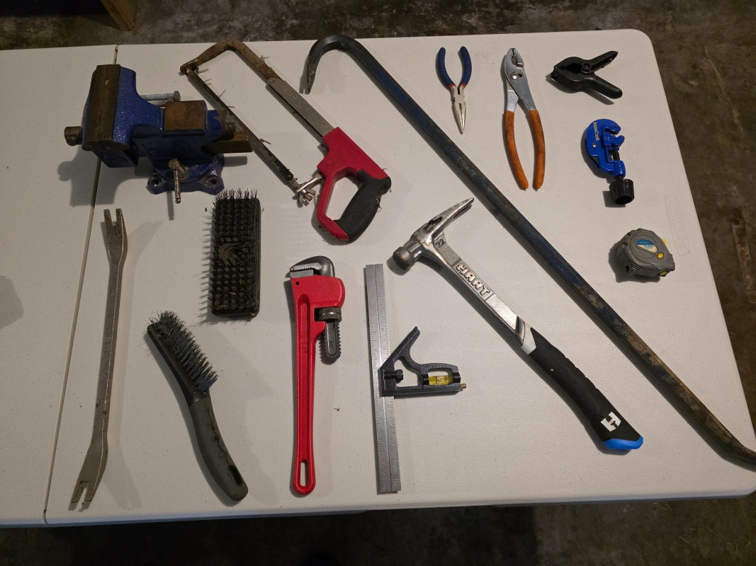 Wilton 4.5" Vise & Tools Wilton 4.5" Bench Vise 36" & 16" Pry Bars 14" Pipe Wrench Hart 22 Framing Hammer Needle-Nose Pliers 10" Slip-Joint Pliers 10" Hack Saw BrassCraft Pipe Cutter WorkForce 12' Tape Measure Ace 12" Stainless Steel Combination Square (2) Wire Brushes Small Pressure Clamp 14 pueces in all!