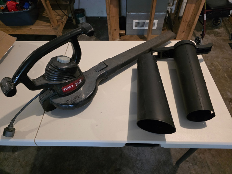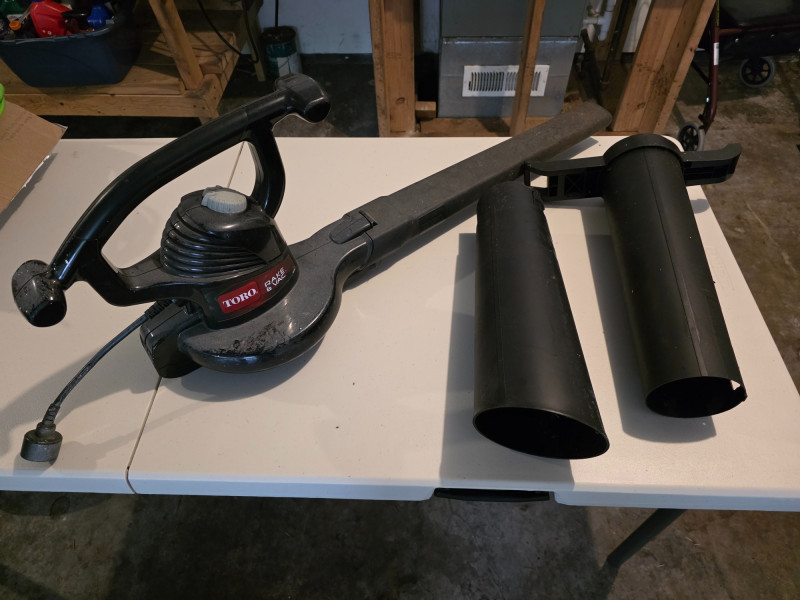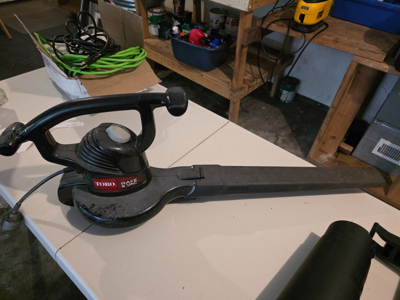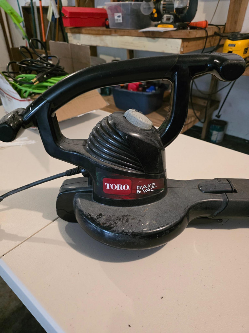 Toro Rake & Vac Handheld Electric Leaf Blower/Shredder/Vacuum Toro Model #51574 It is a 3-in-1 tool that functions as a blower, vacuum, and shredder. The tool is corded electric, with various models offering different power levels and features. It features a quick-release latch for easy, no-tool conversion between modes. A metal impeller helps shred leaves and debris into fine mulch Missing vacuum bag Tested - Works!