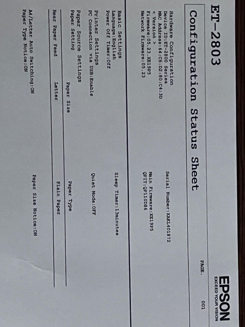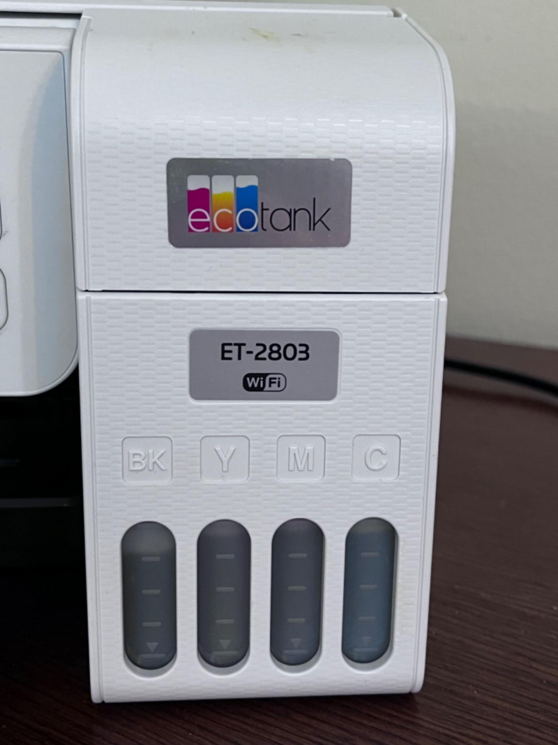 Epson ET–2803 Printer & Ink Refill Bottles Rear paper feed. PC connection via USB. Tested: Works.