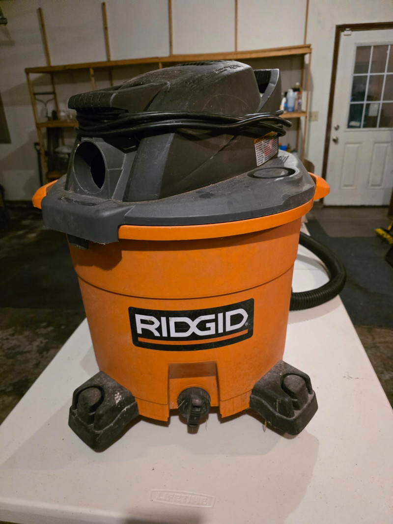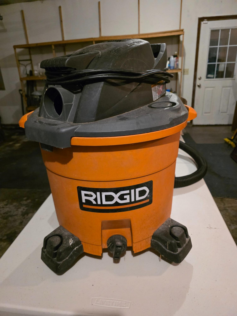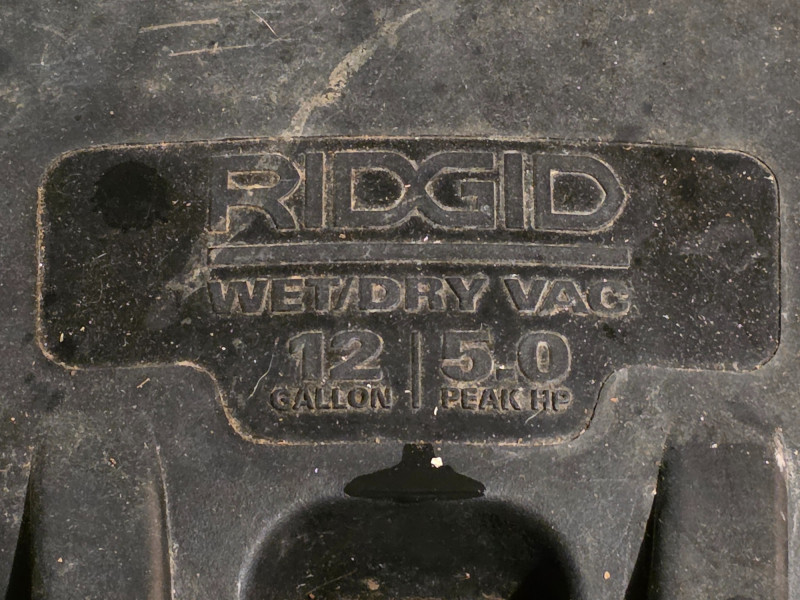 Ridgid 12-Gallon, 5.0 Peak HP Wet/Dry Shop Vacuum Ridgid Model #WD12780 Capacity & Power: 12-gallon drum, 5.0 Peak HP motor. Maneuverability: Compact design with 4 swivel casters and side carry handles. Storage: On-board storage for accessories and a power cord wrap. Hose: Features a Dual Flex hose that resists collapsing and locks onto the vac. Filtration: Uses the quick-lock filter system (VF4000 filter included) and accepts filter bags (VF3502). Blower Function: Can be converted to a blower by locking the hose into the blower port Includes hose, 3 extensions & crevice tool Tested - Works!