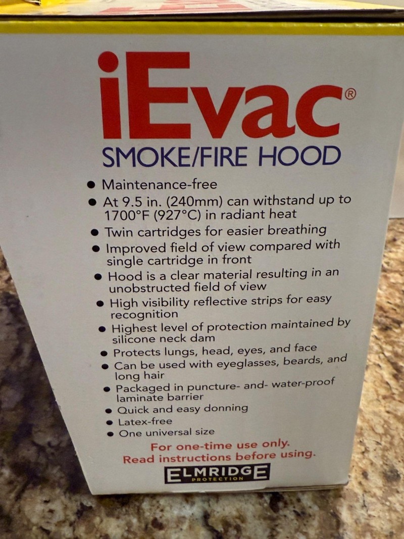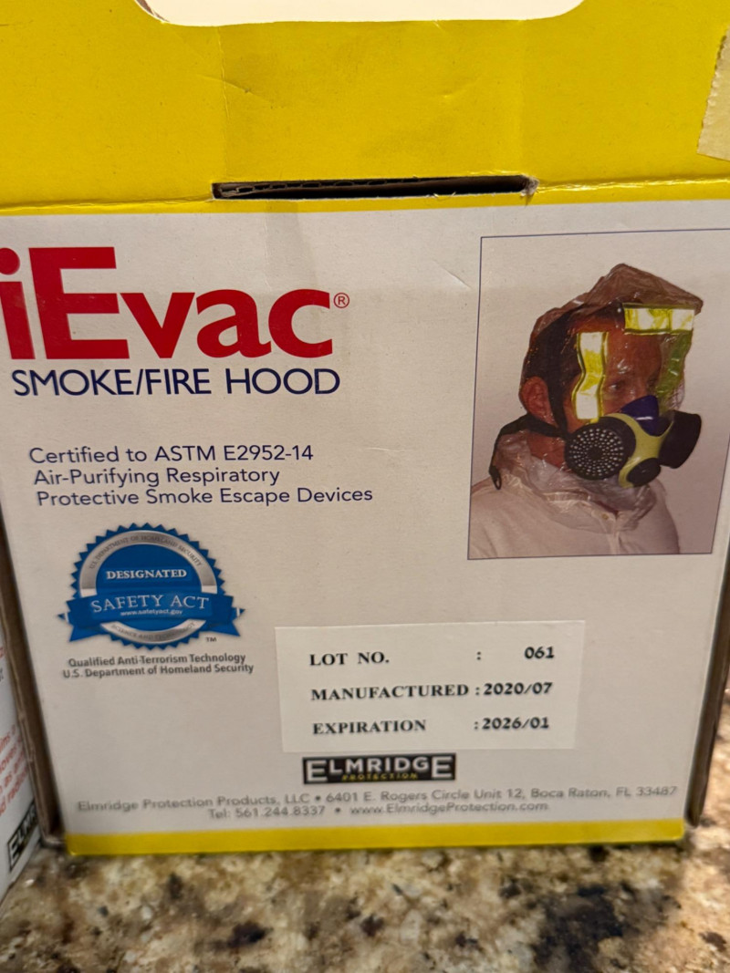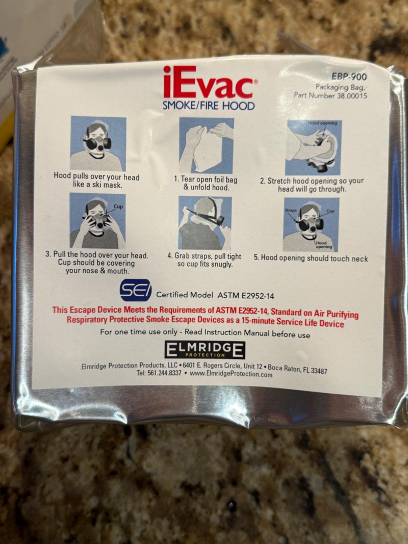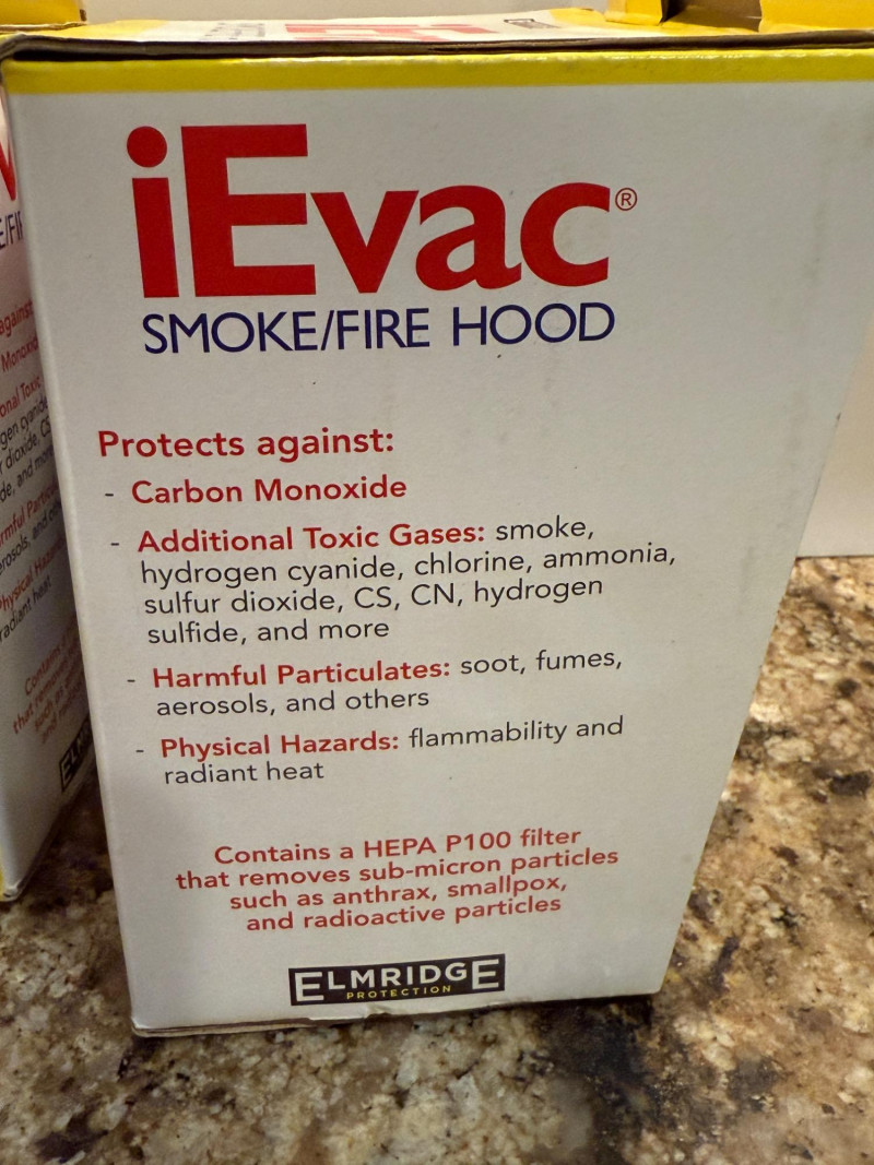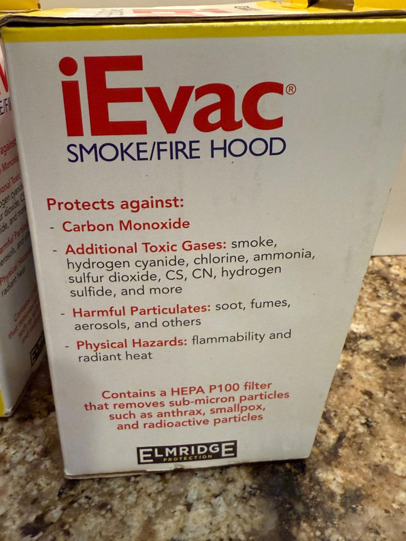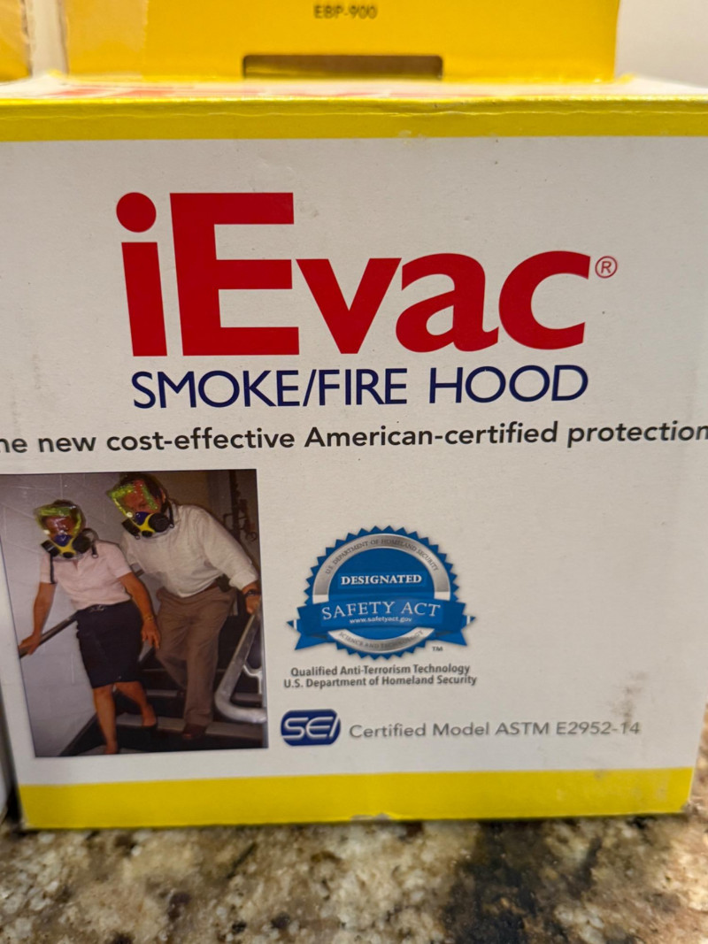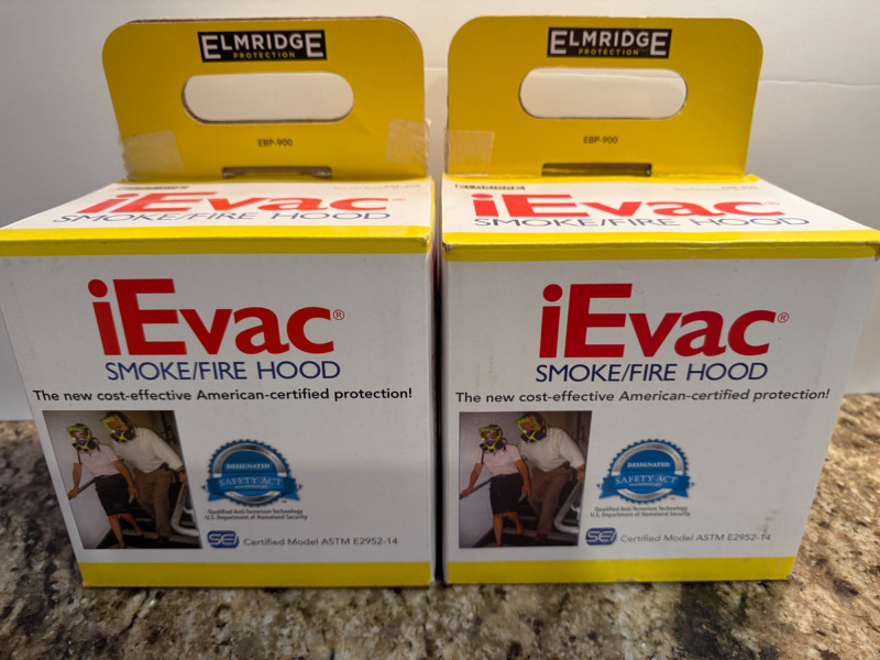 (2) NIP iEvac Smoke/Fire Hoods Model EBP-900 Unopened vacuum sealed packaging.